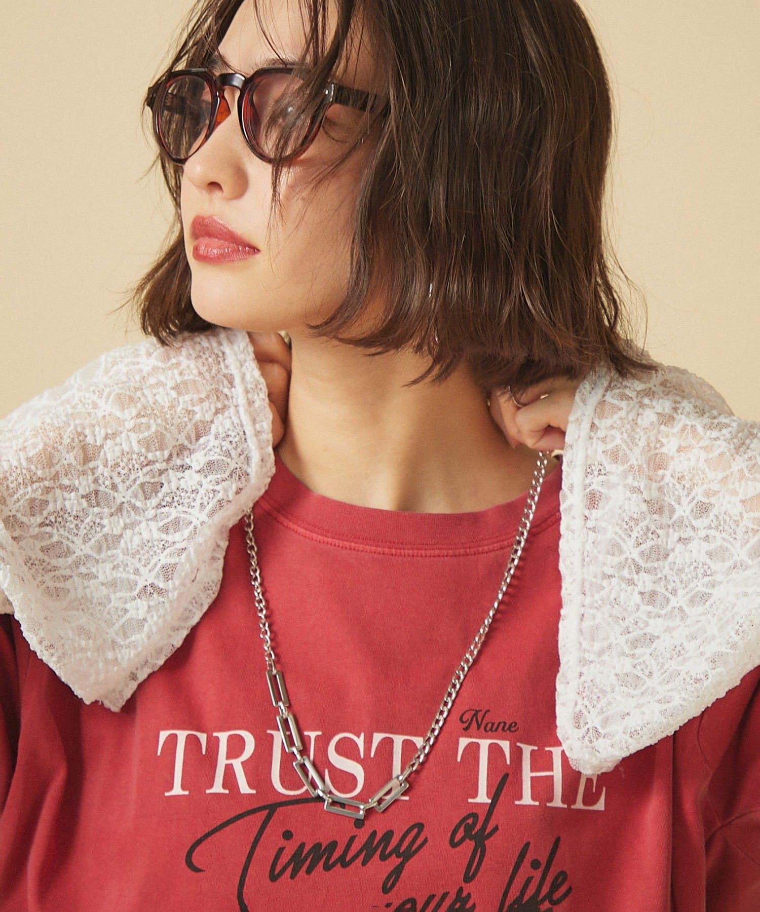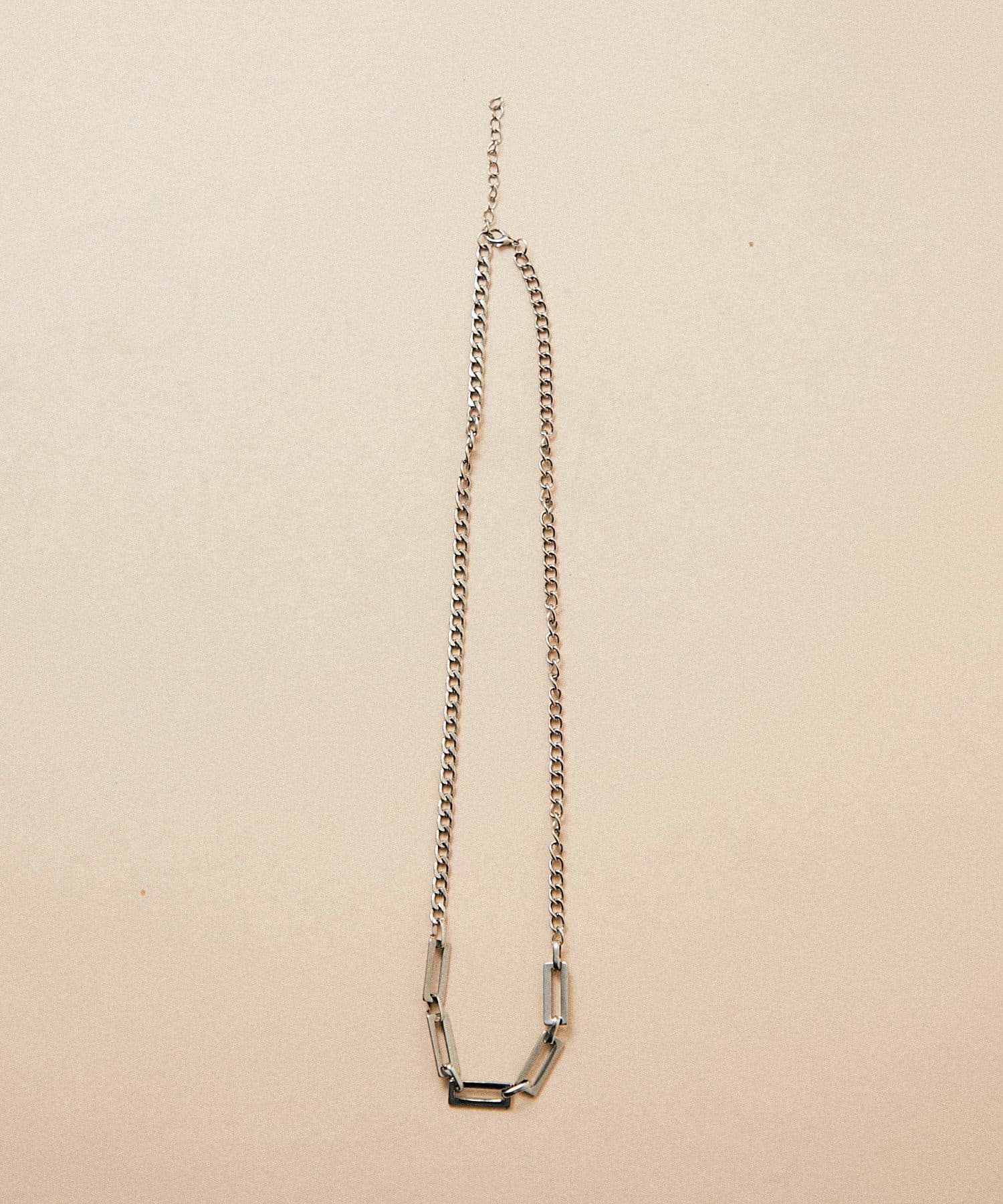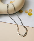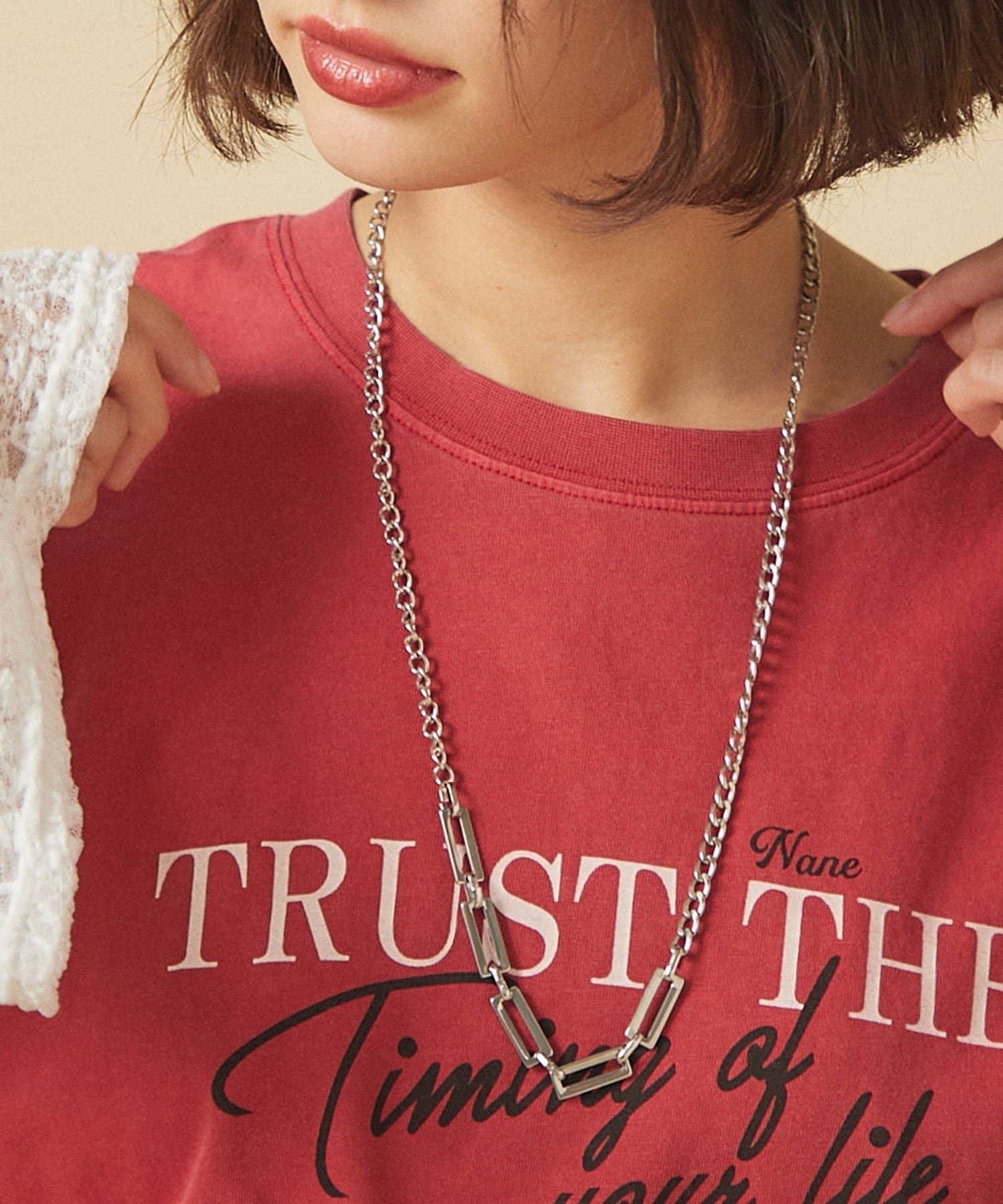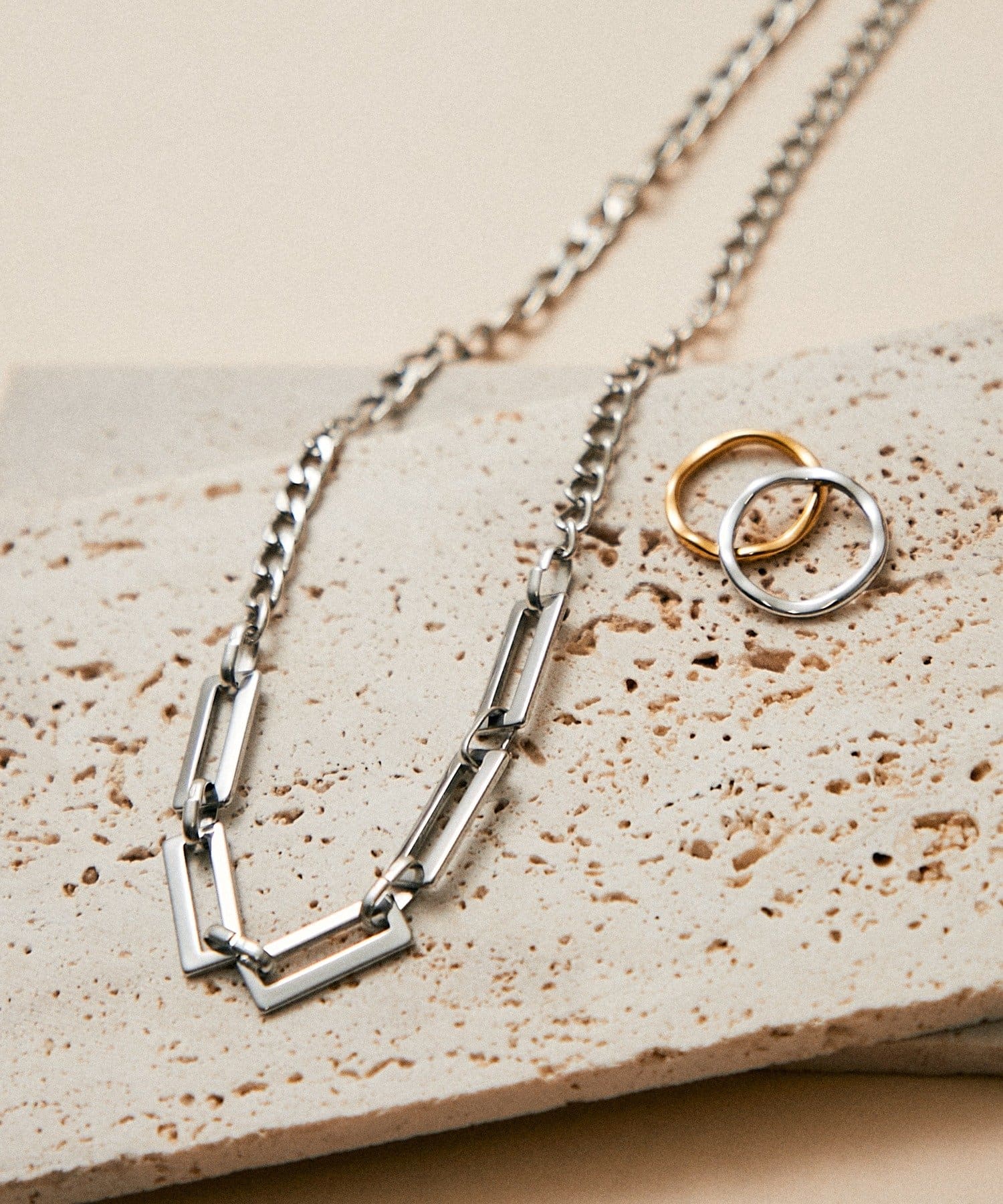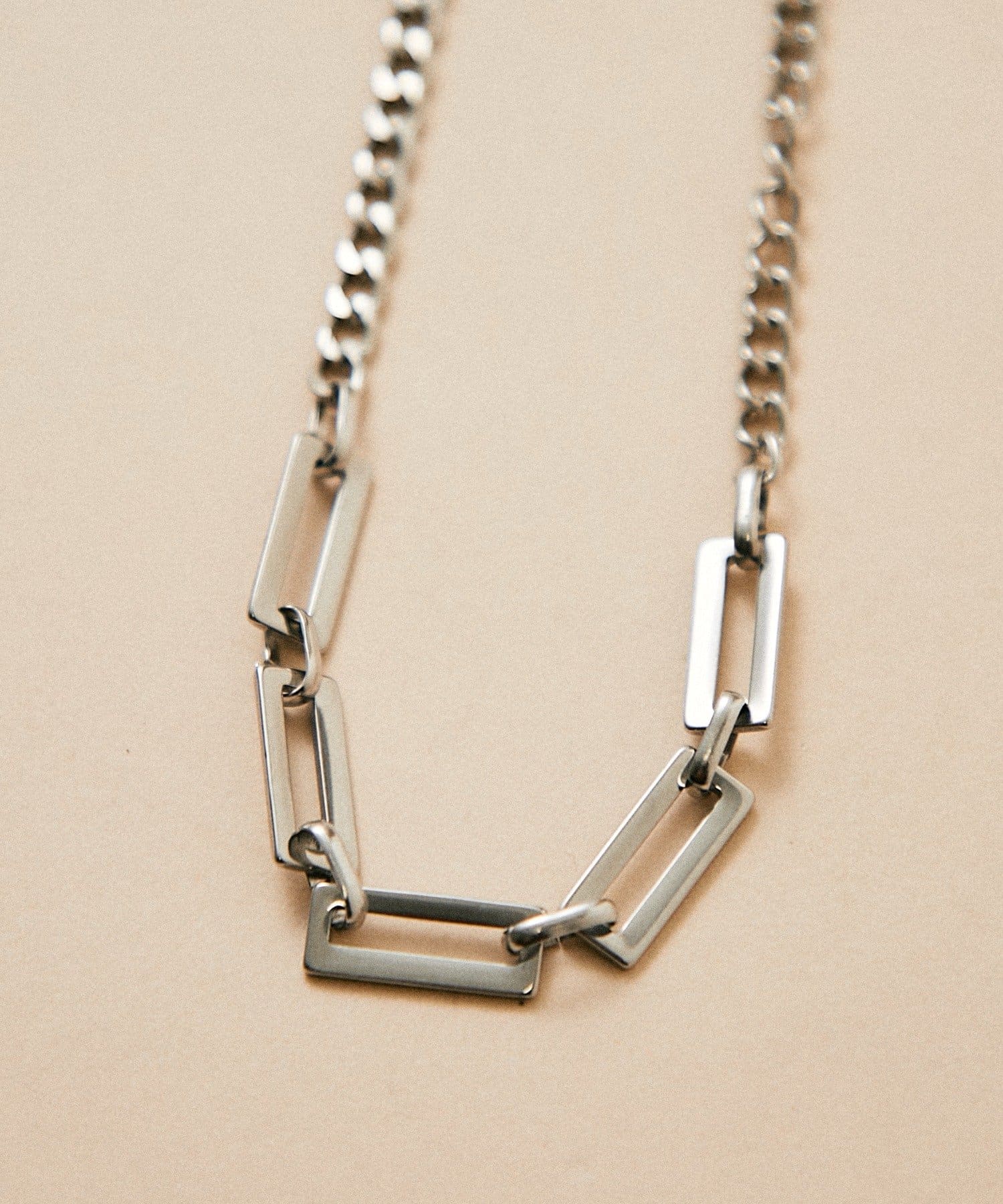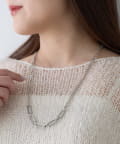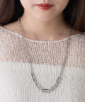 ・ベーシックなチェーンとスクエア型の大ぶりはパーツのMIXデザインがポイント