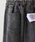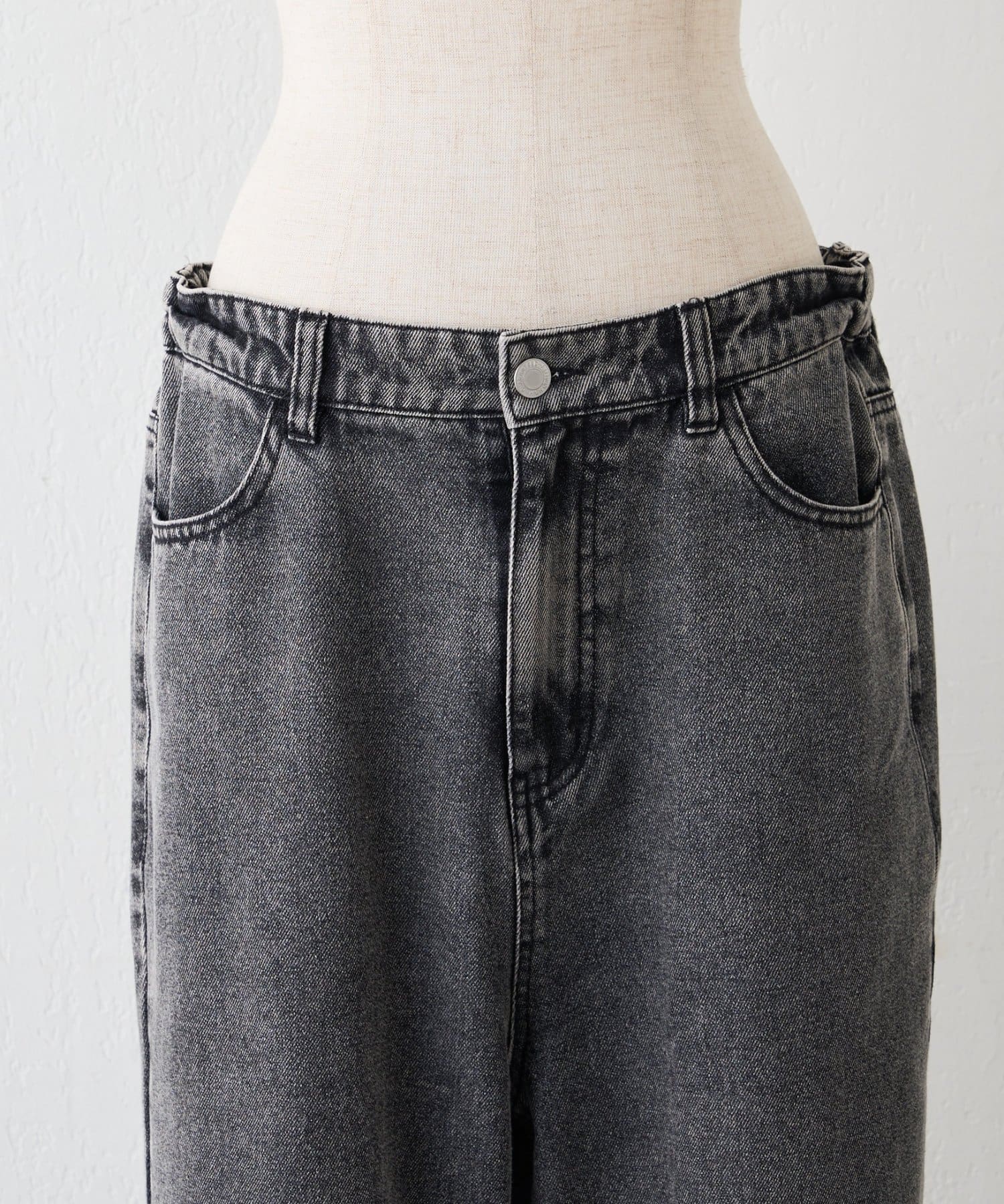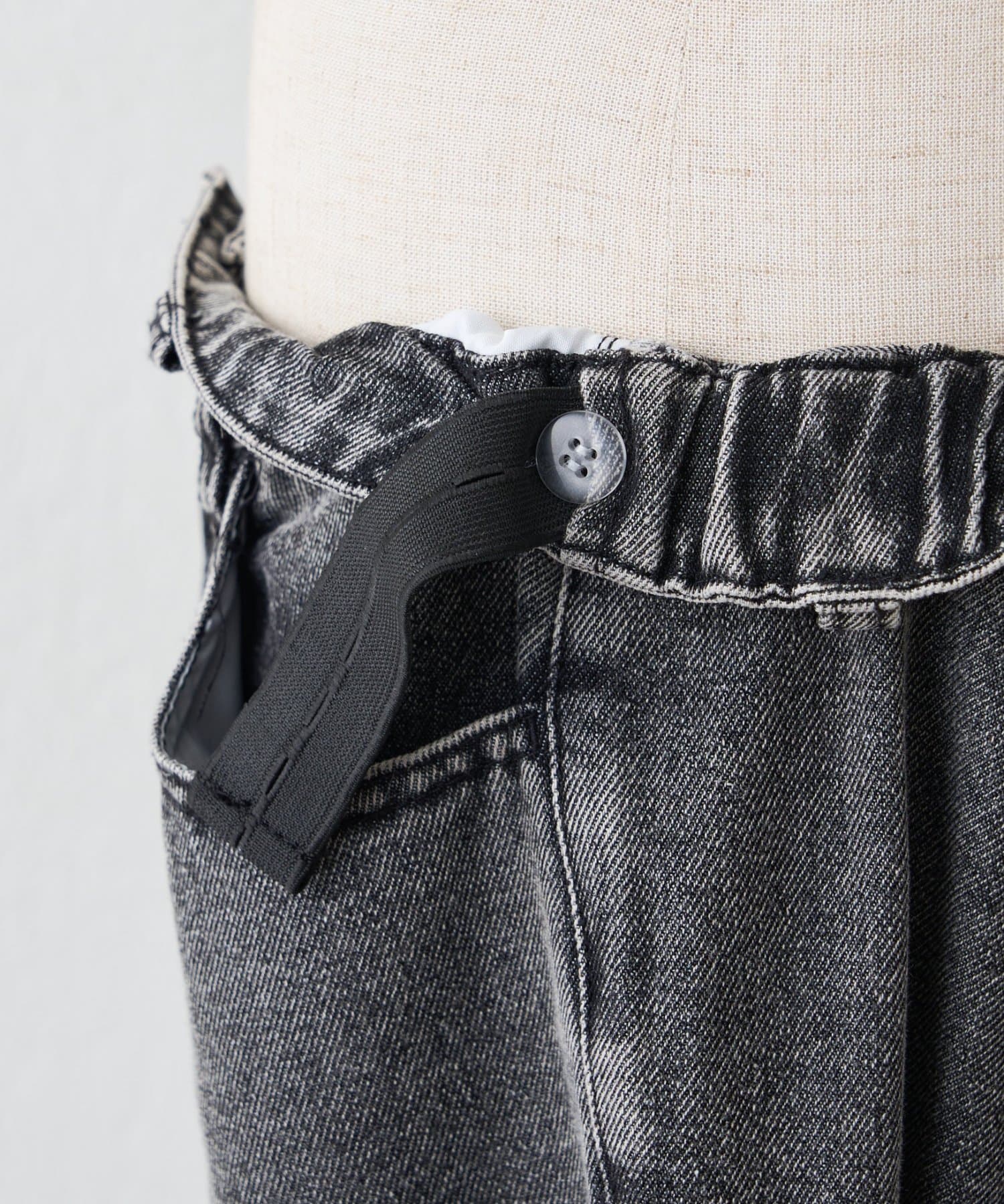 ・ウエストにインベルトを付けており、ゴムを絞ってお好みの位置でボタンを留めることができるウエスト調節可能なバギーデニム