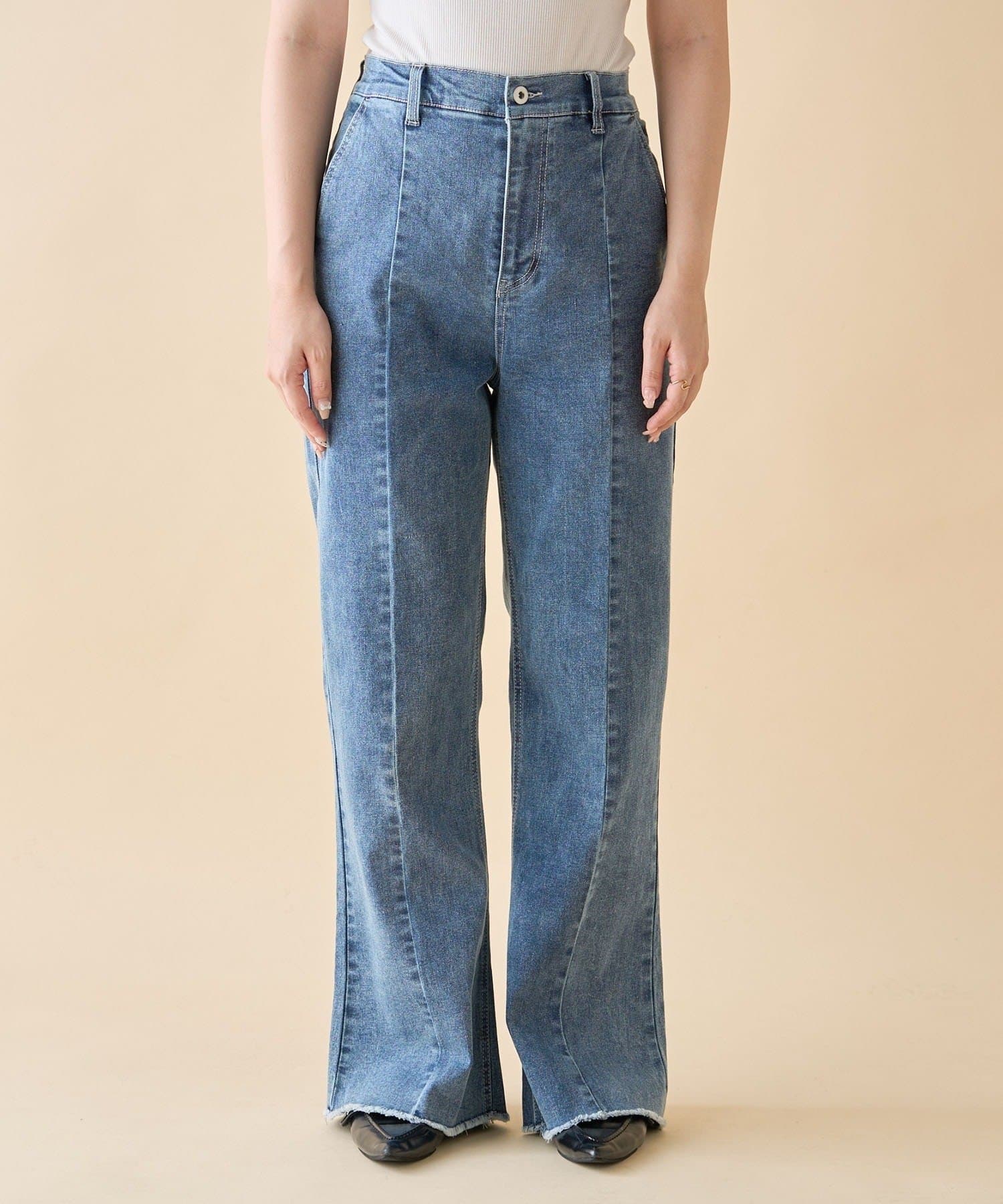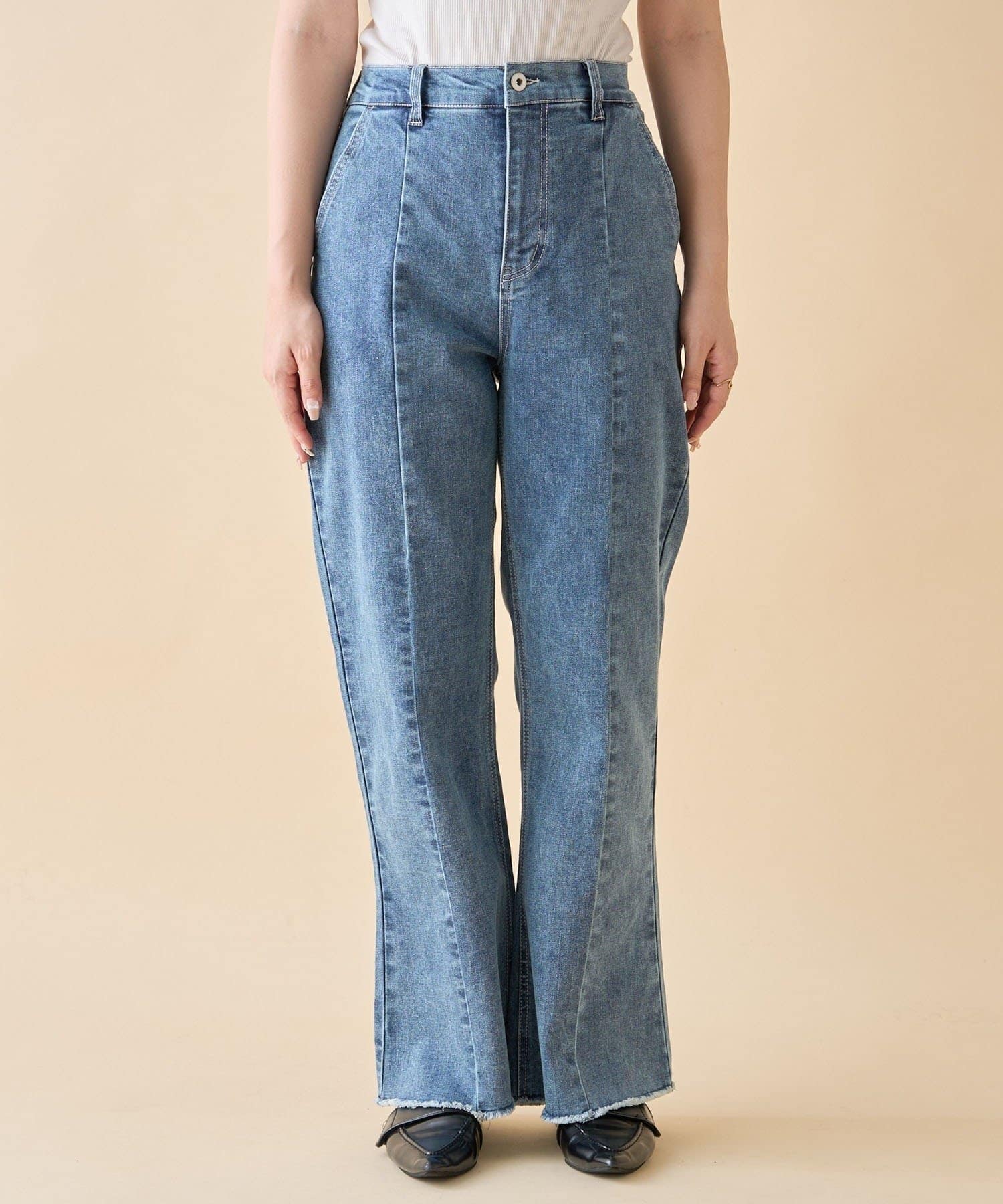 ・裾にかけて少しだけ広がるセミフレアの美シルエットデニムパンツ