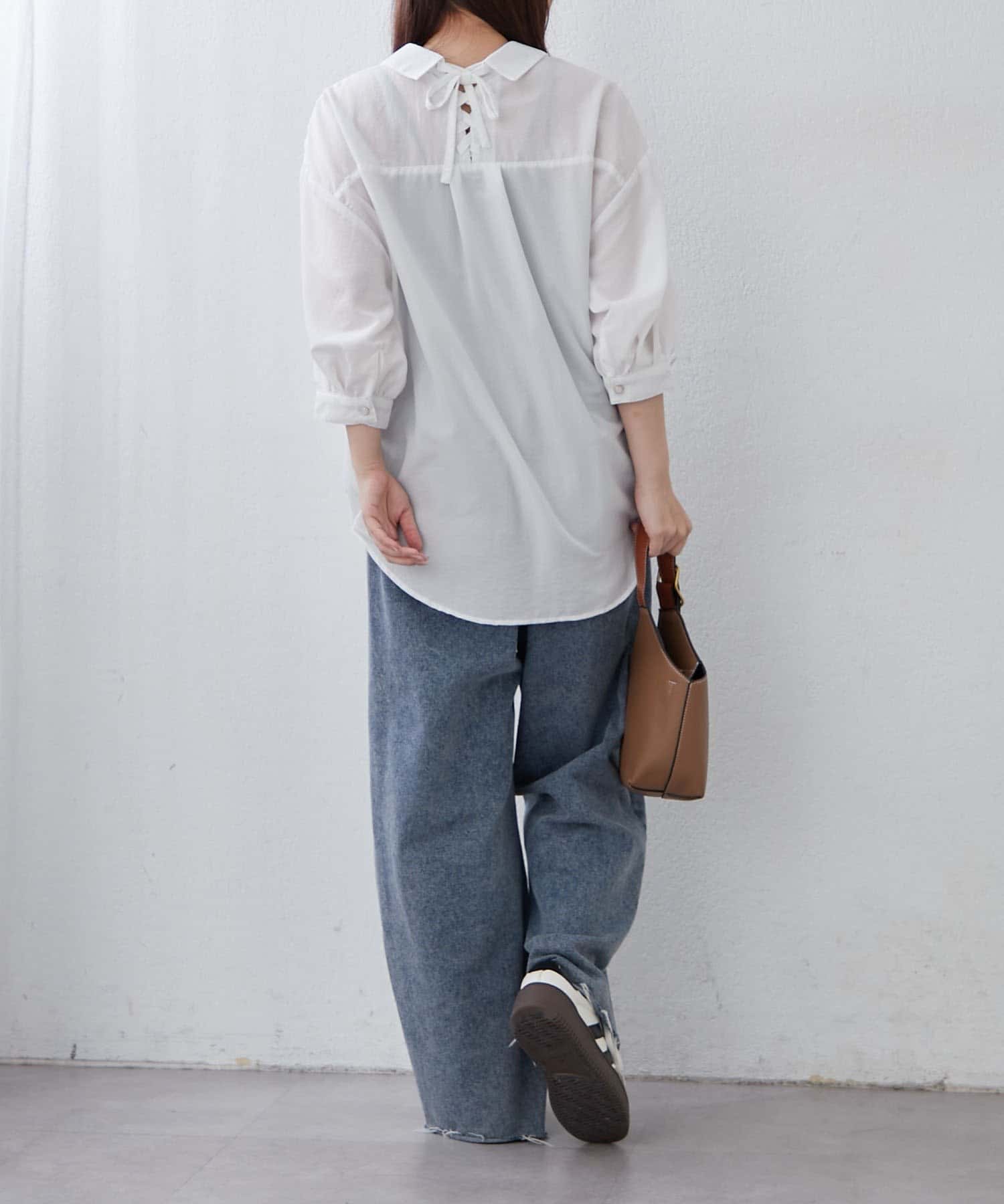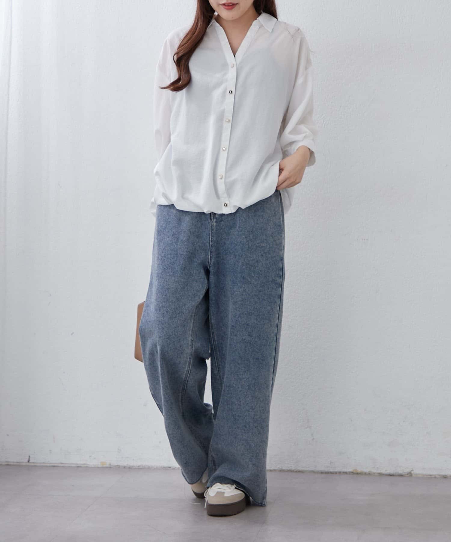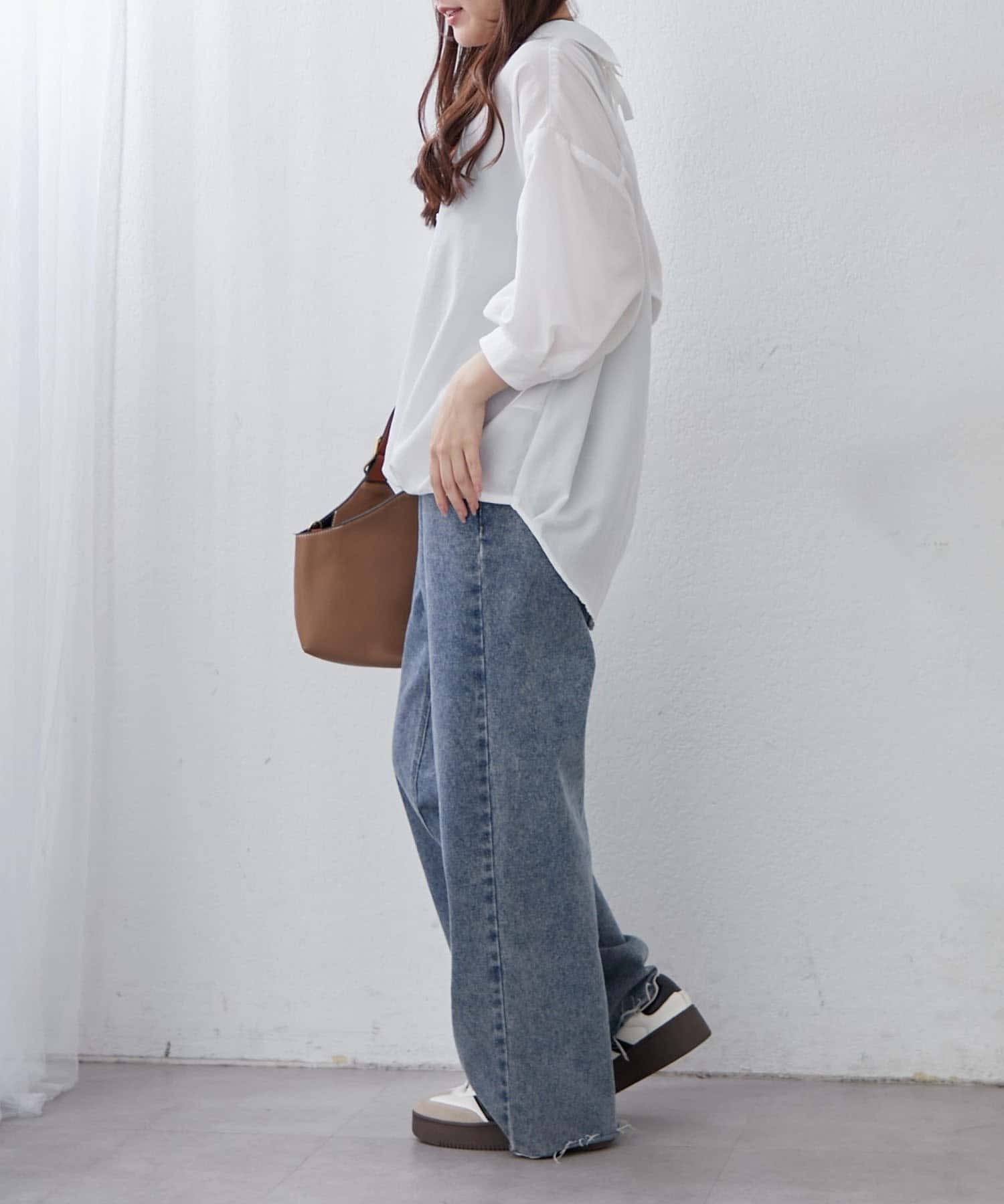 ・デニムと合わせて、こなれ感のあるカジュアルスタイルに。スニーカーやサンダルで抜け感をプラス