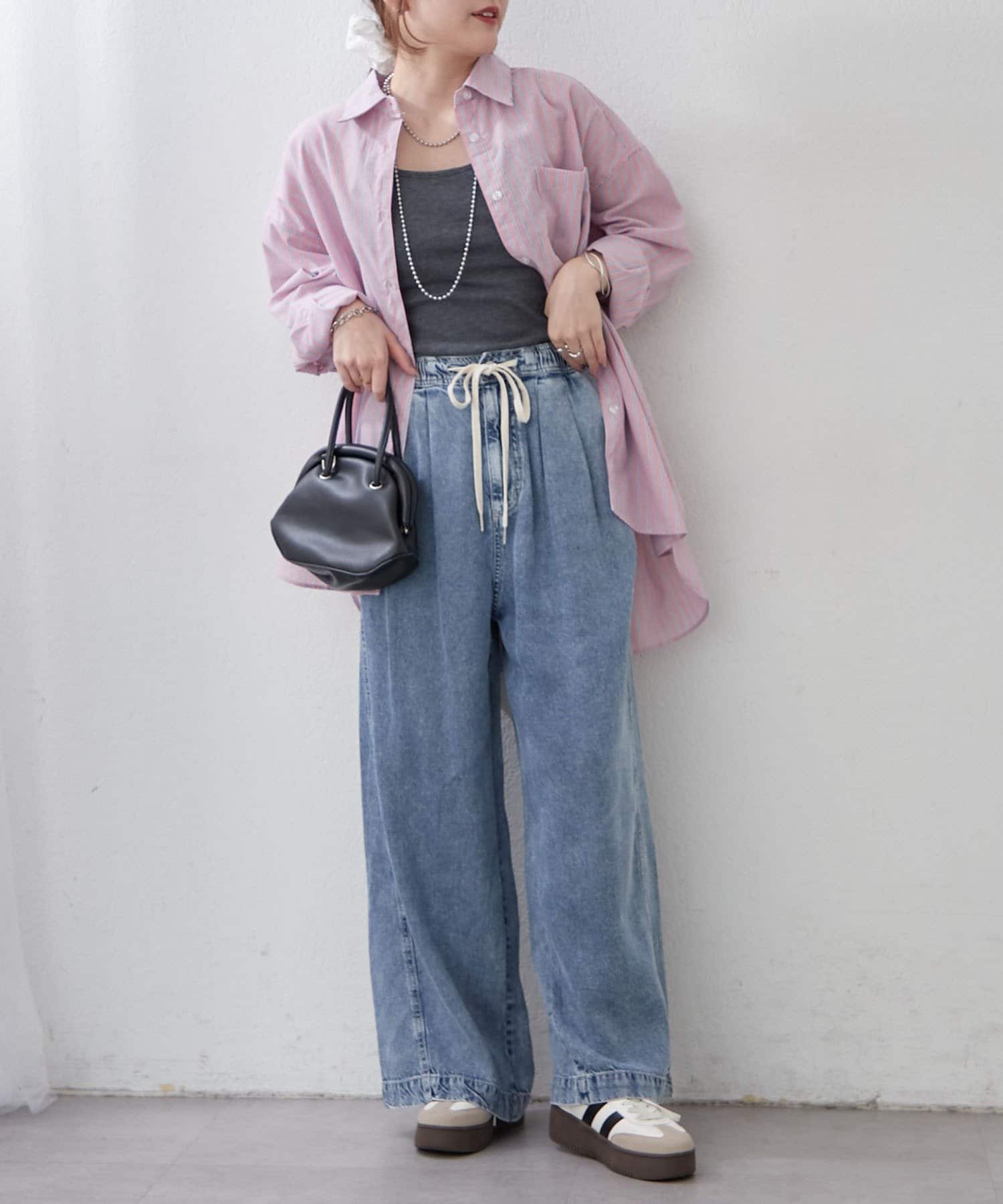 ・シンプルなキャミソールワンピースの上に、ストライプシャツをさらりと羽織って、こなれ感満載のスタイリングに
