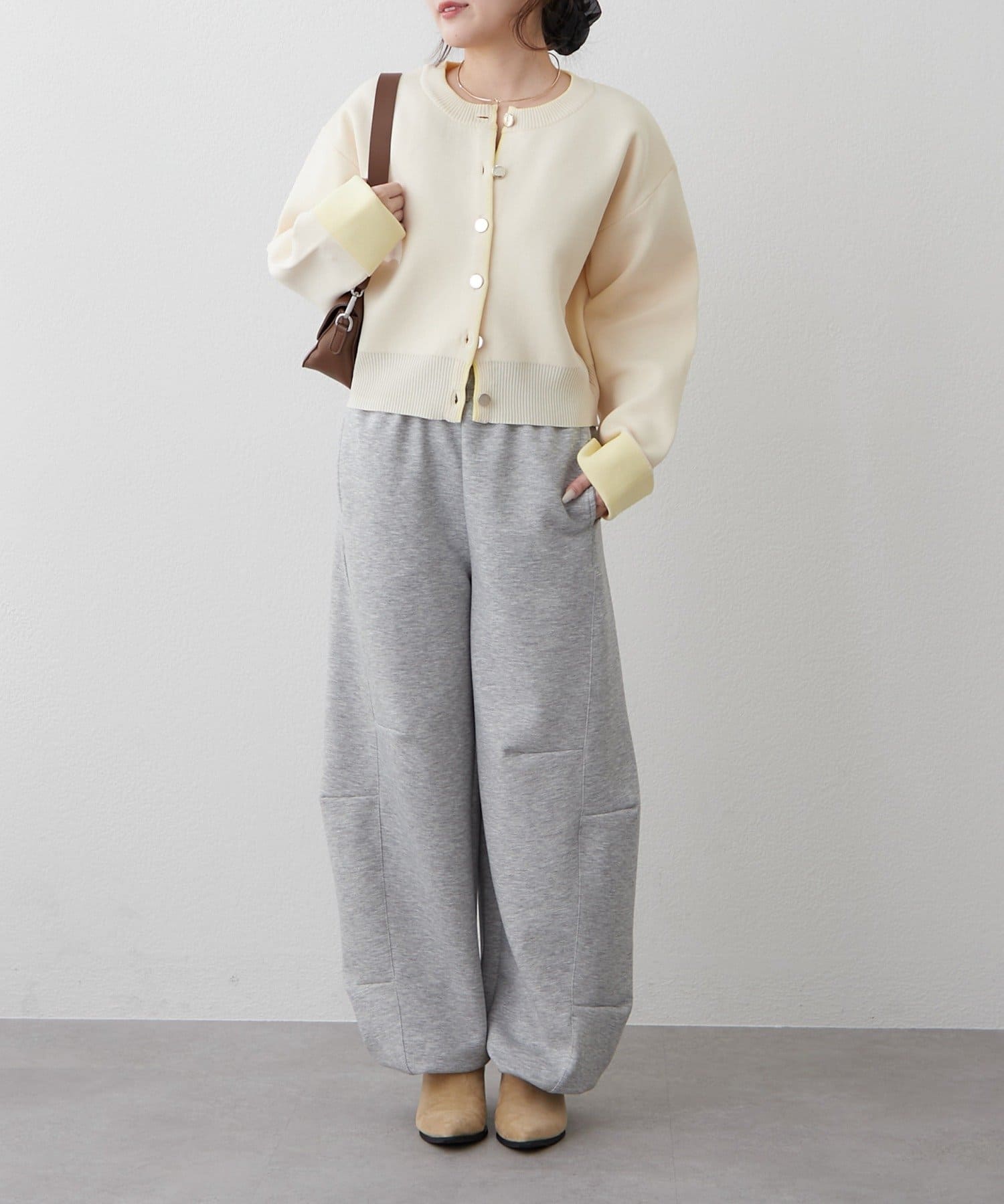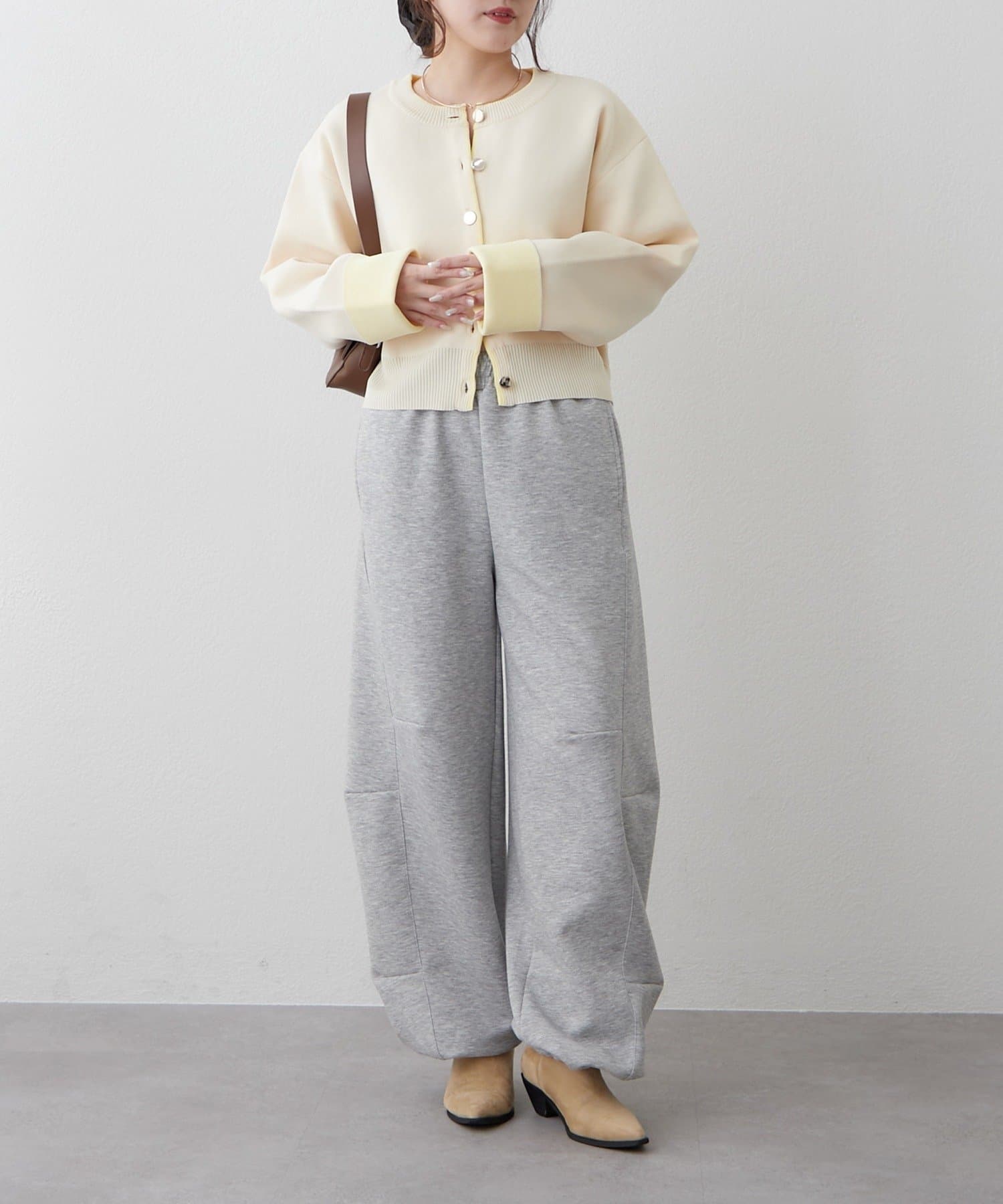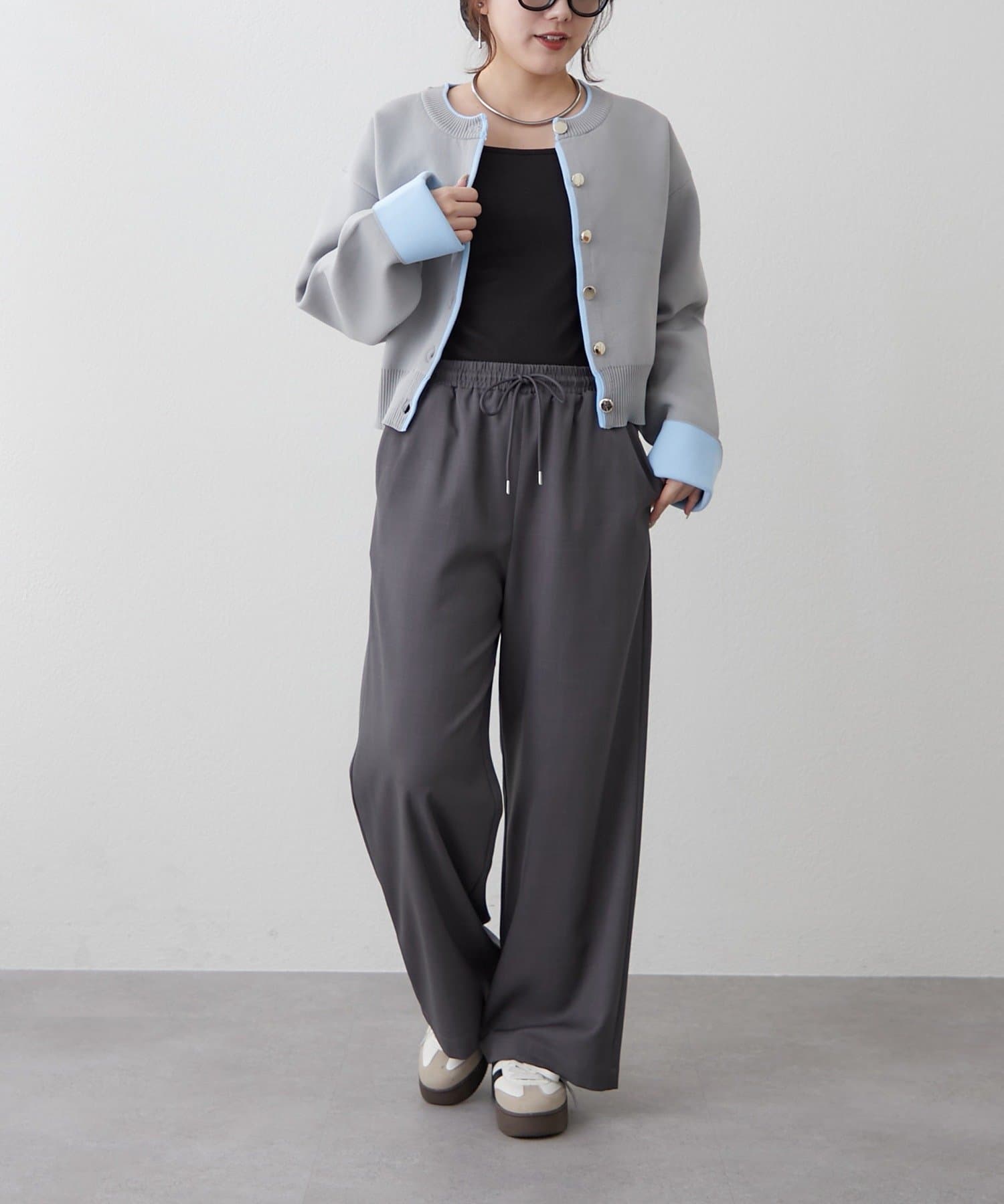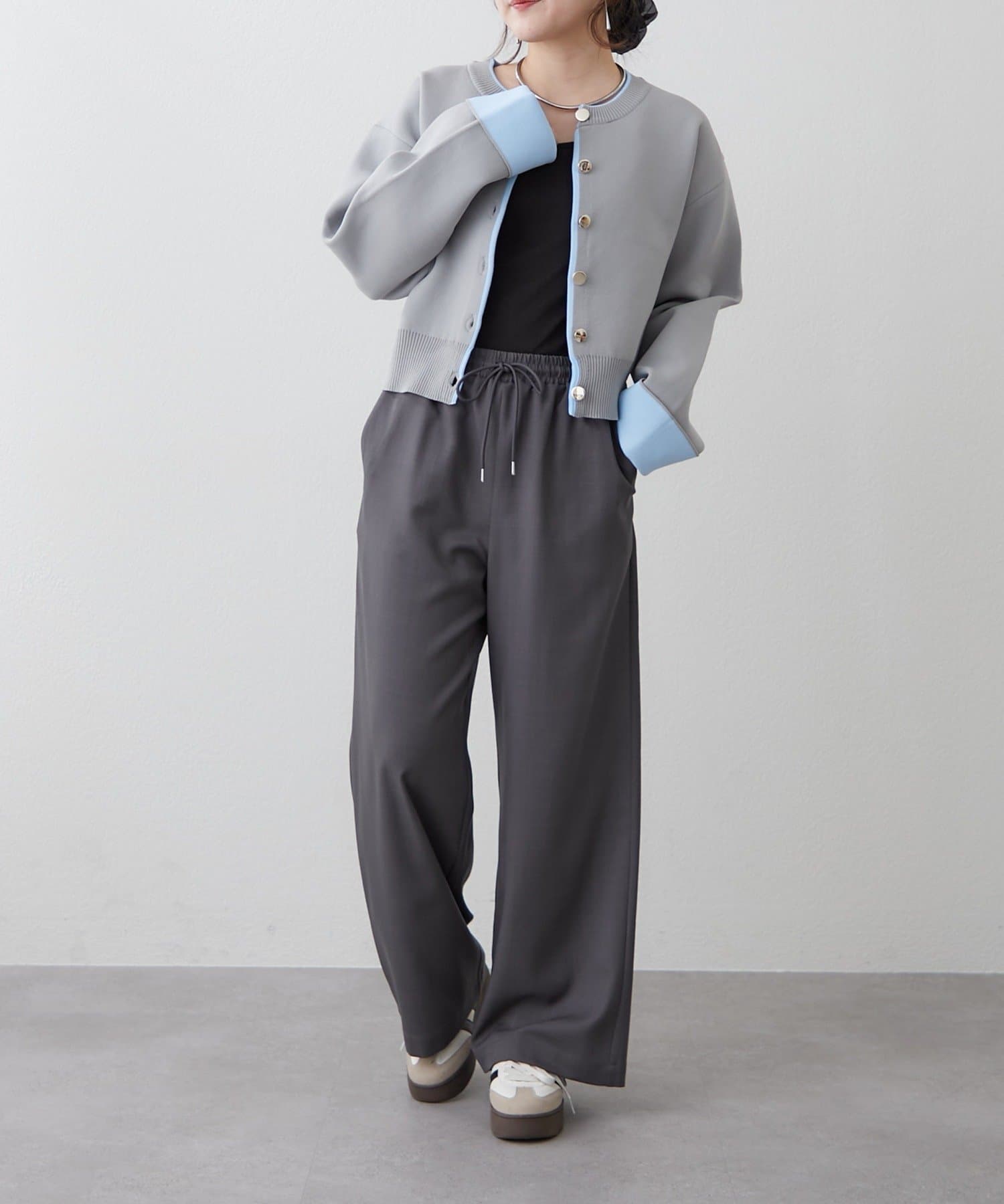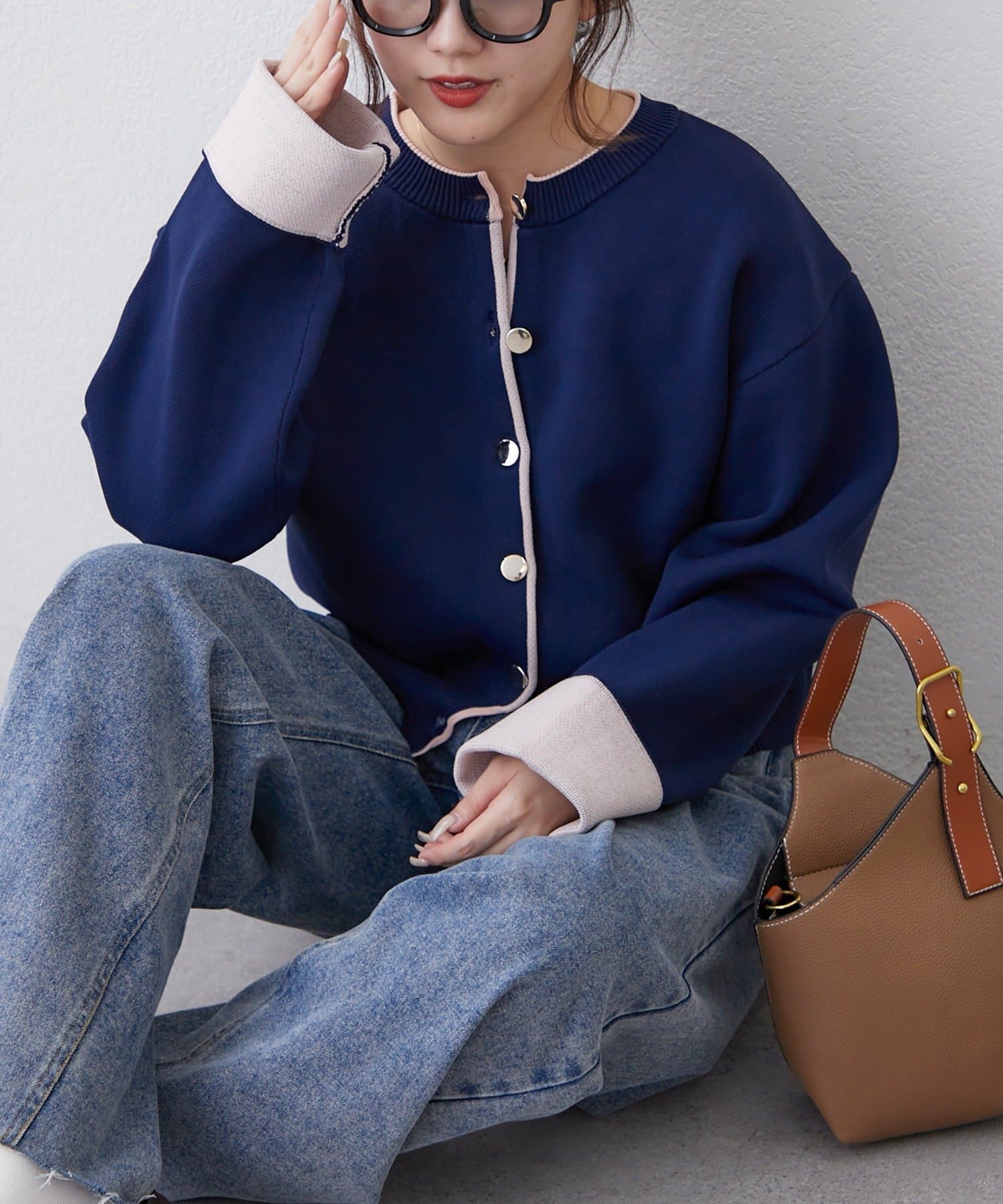 ・袖口だけではなく、前立て部分も配色になっている着映えカーディガン