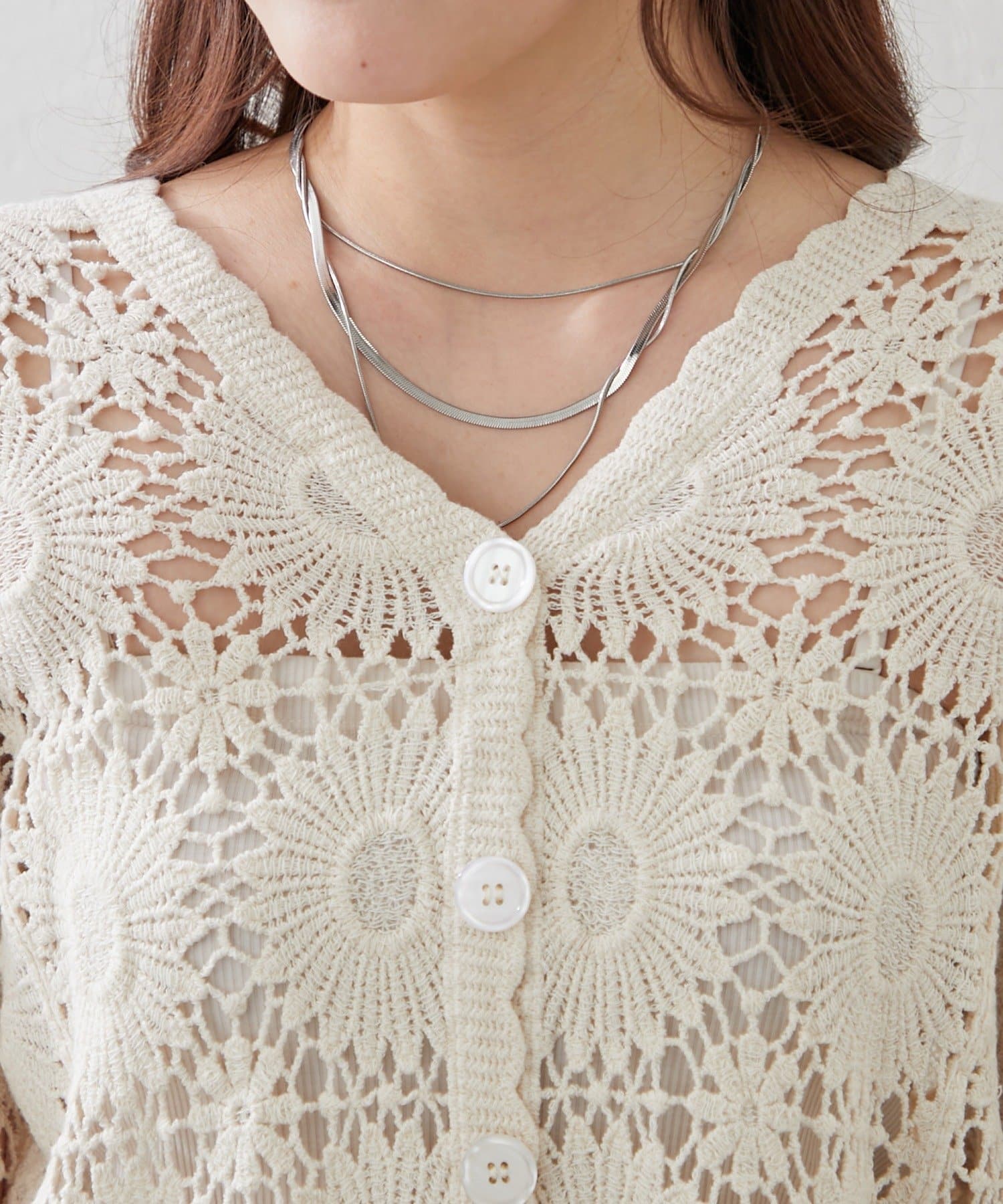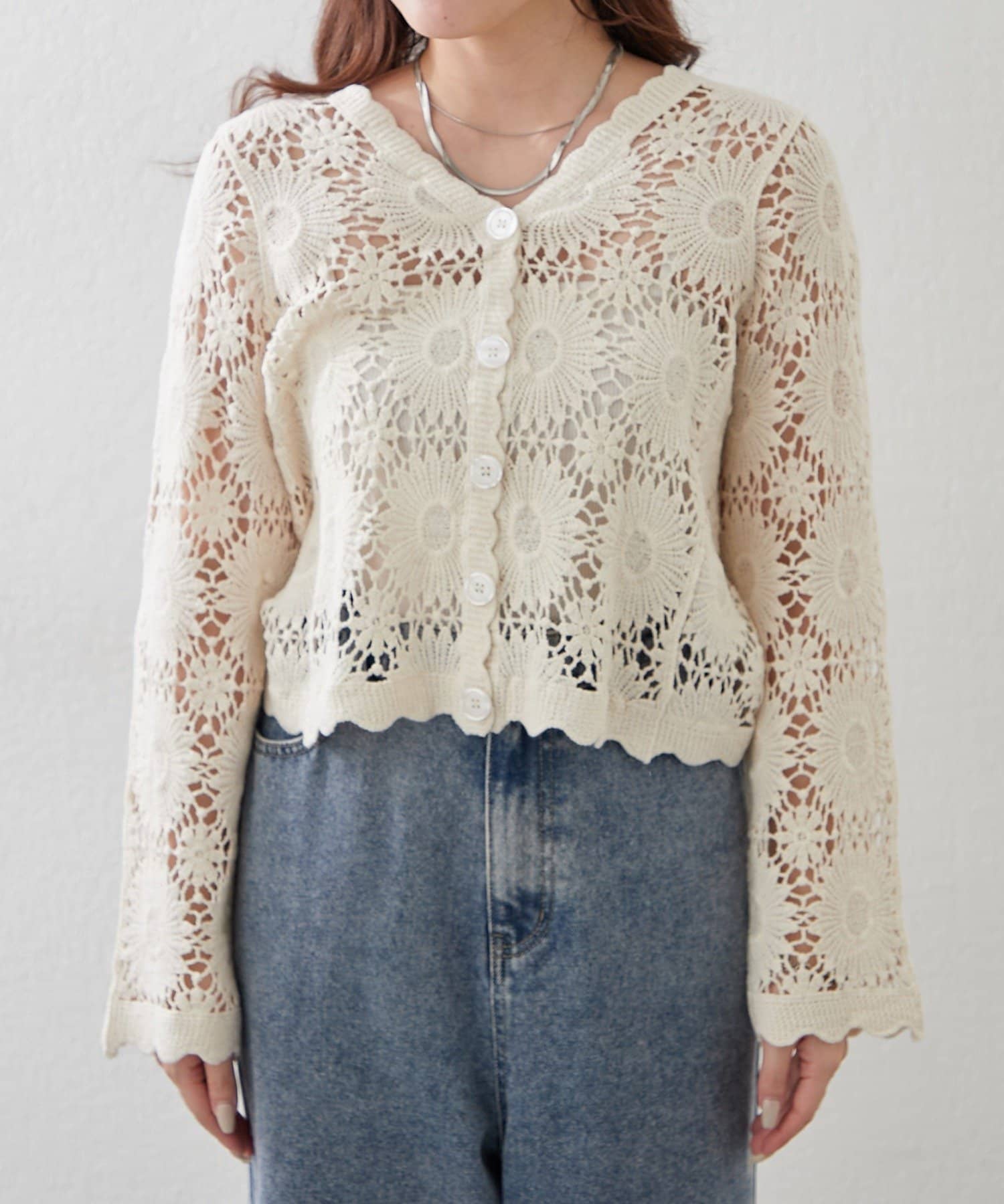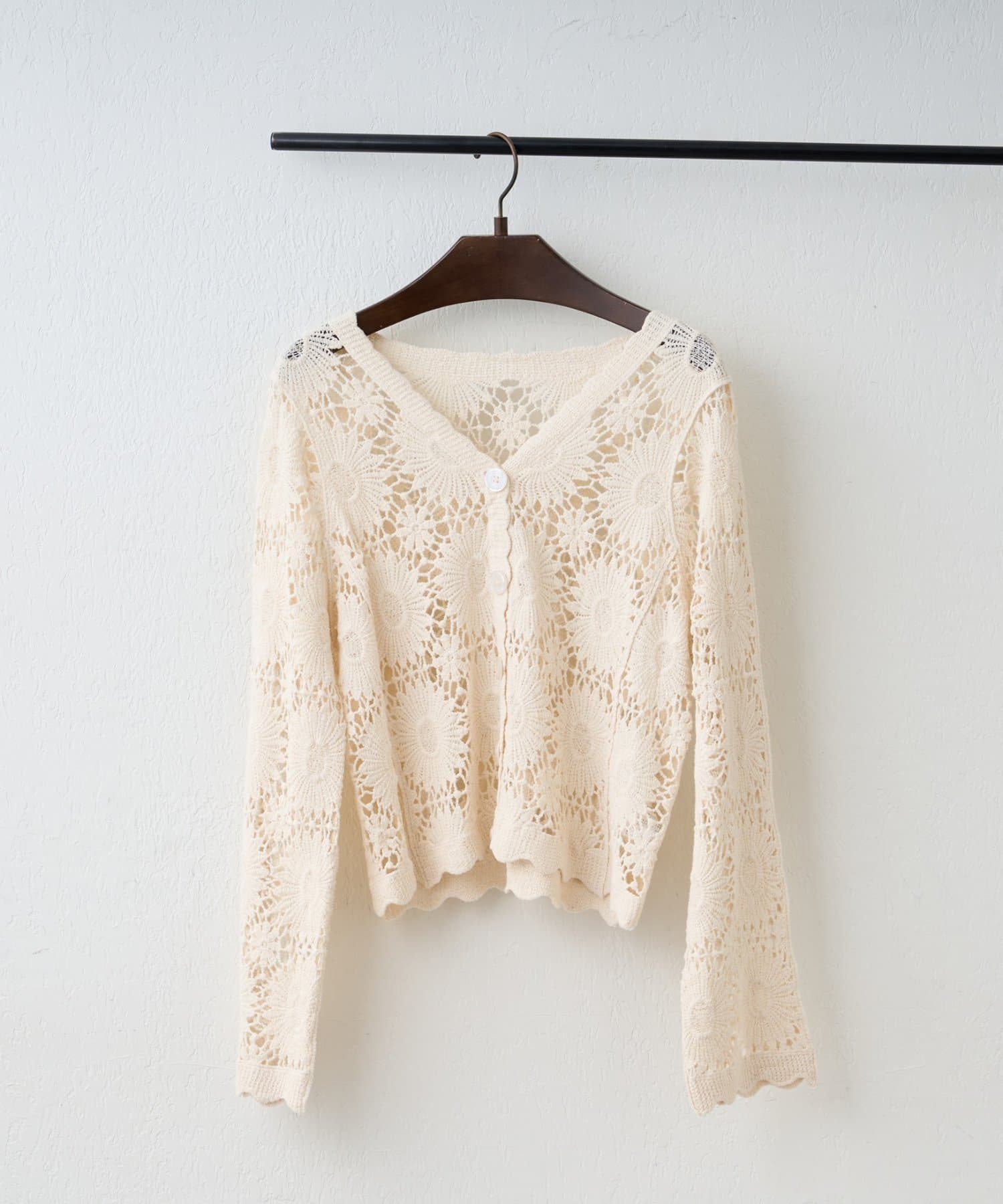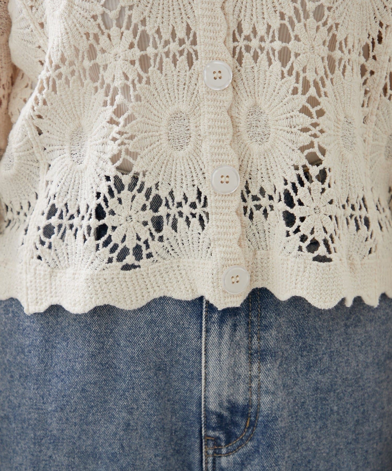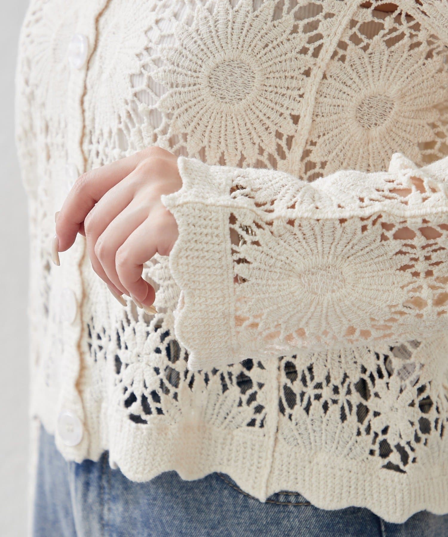 ・かぎ針編みによる繊細な透け感がおしゃれなニットカーディガン