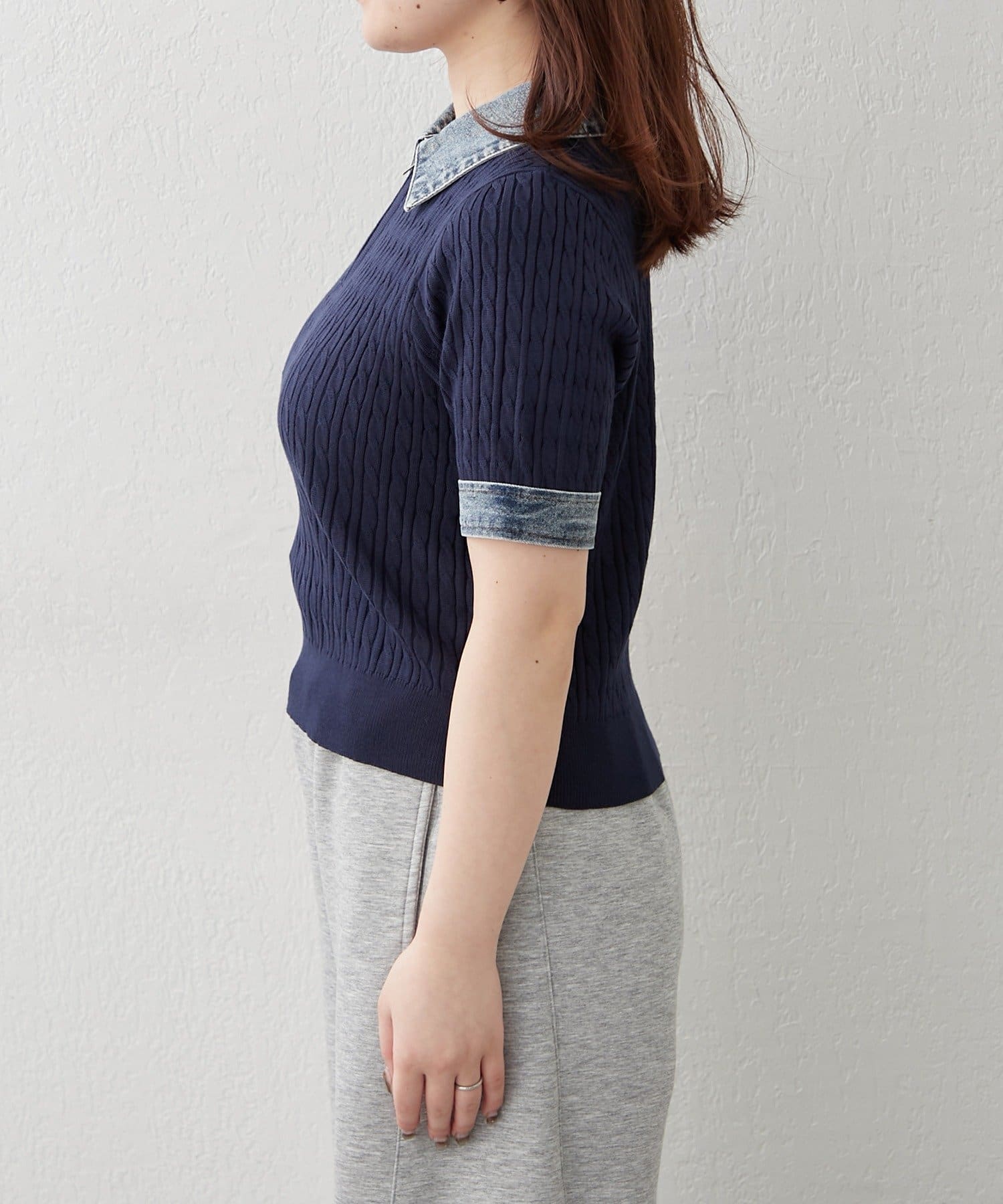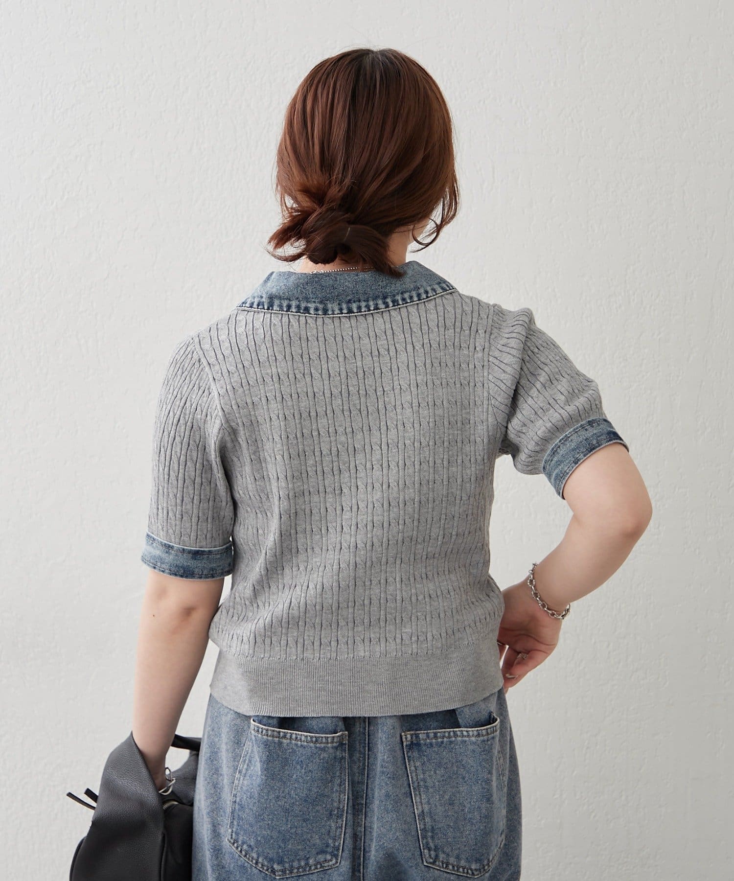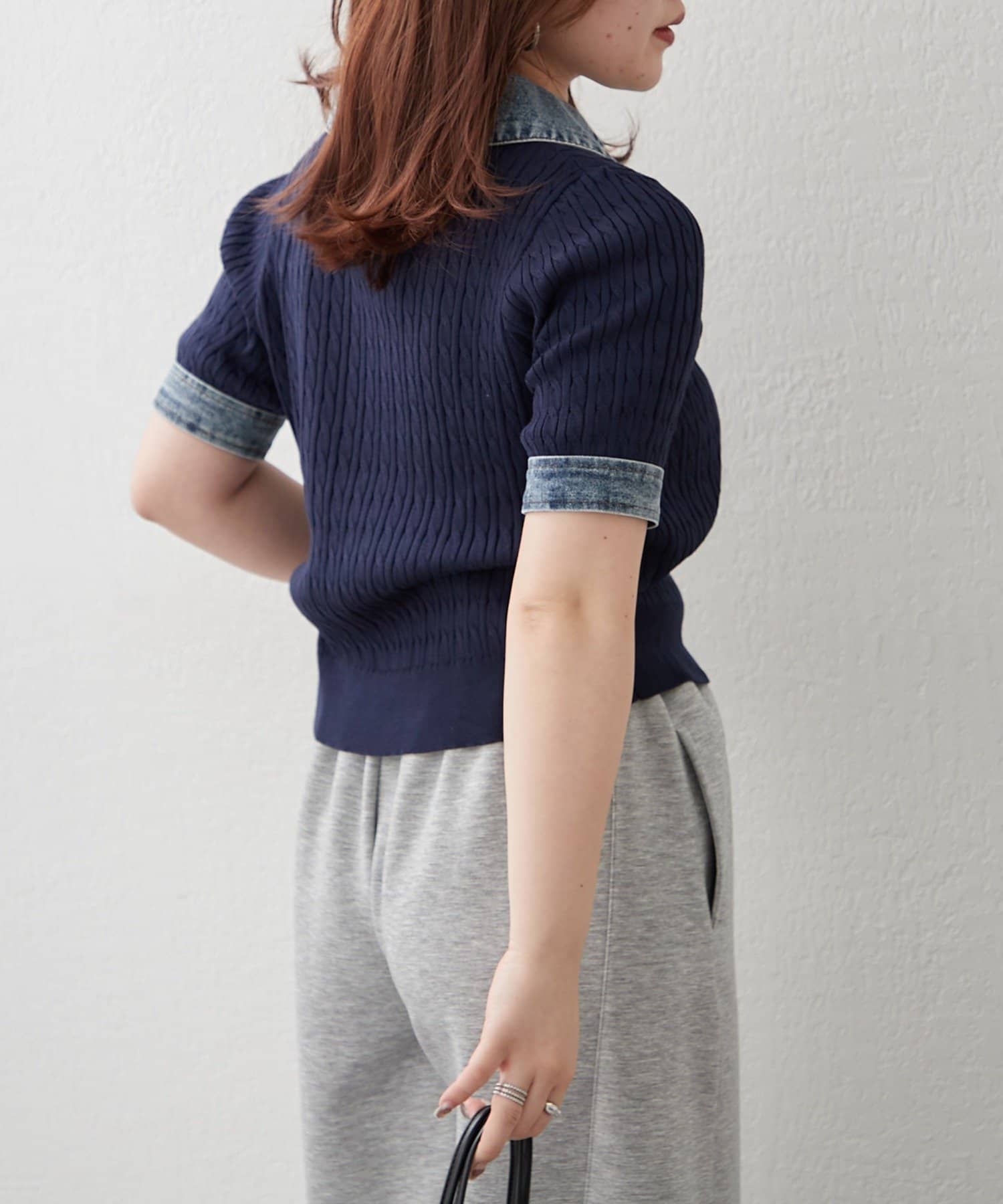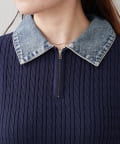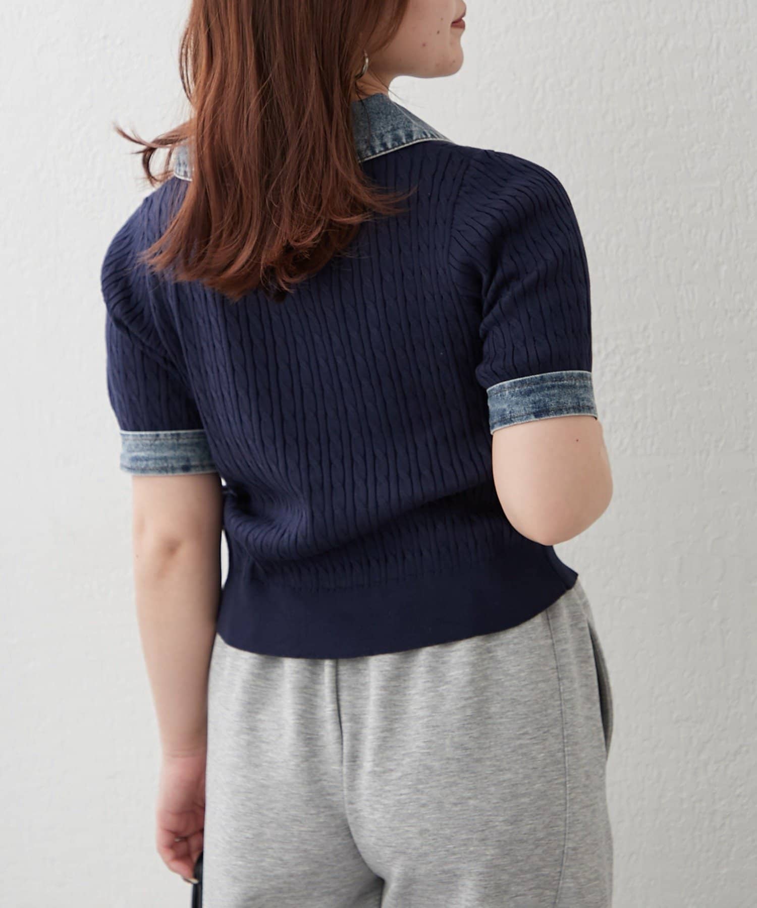 ・襟と袖口のデニム素材がアクセントになった、おしゃれなニットトップス