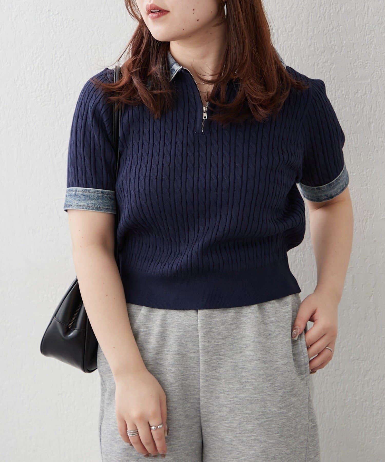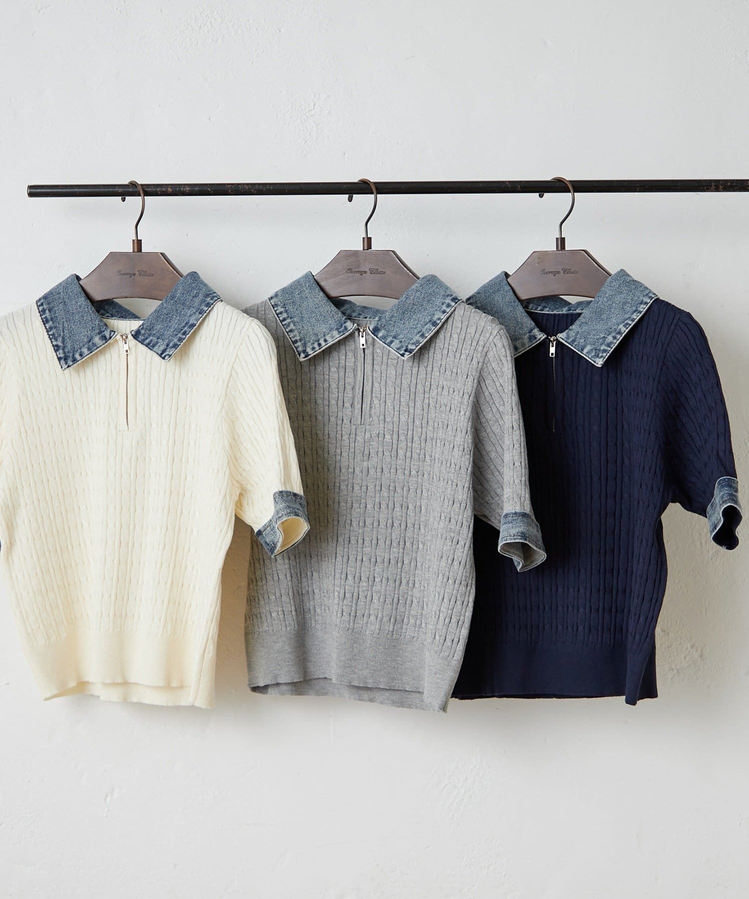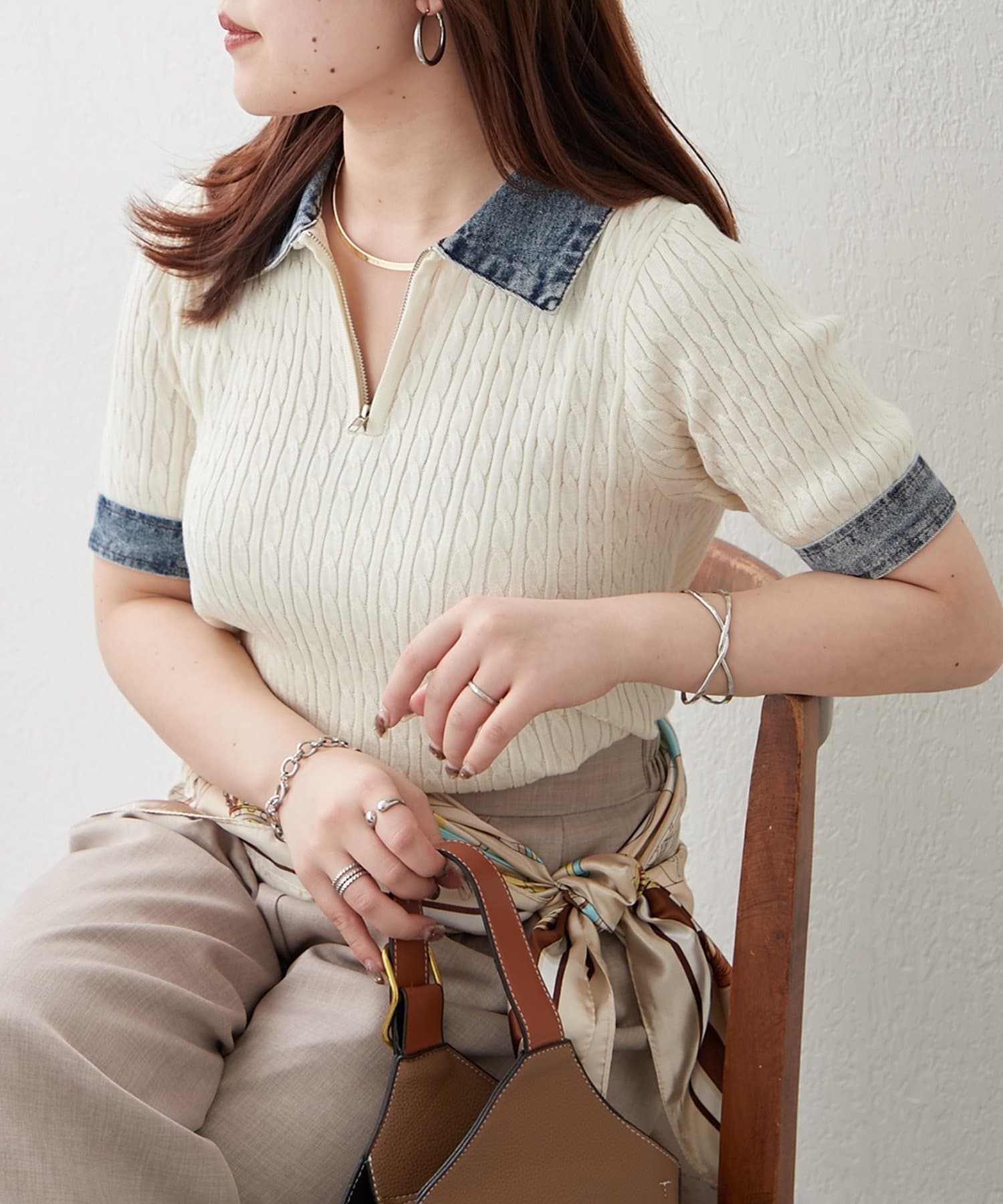 ・襟と袖口のデニム素材がアクセントになった、おしゃれなニットトップス