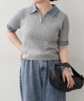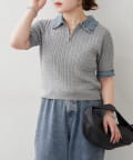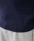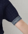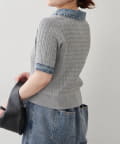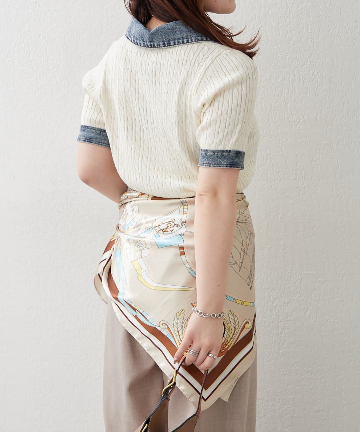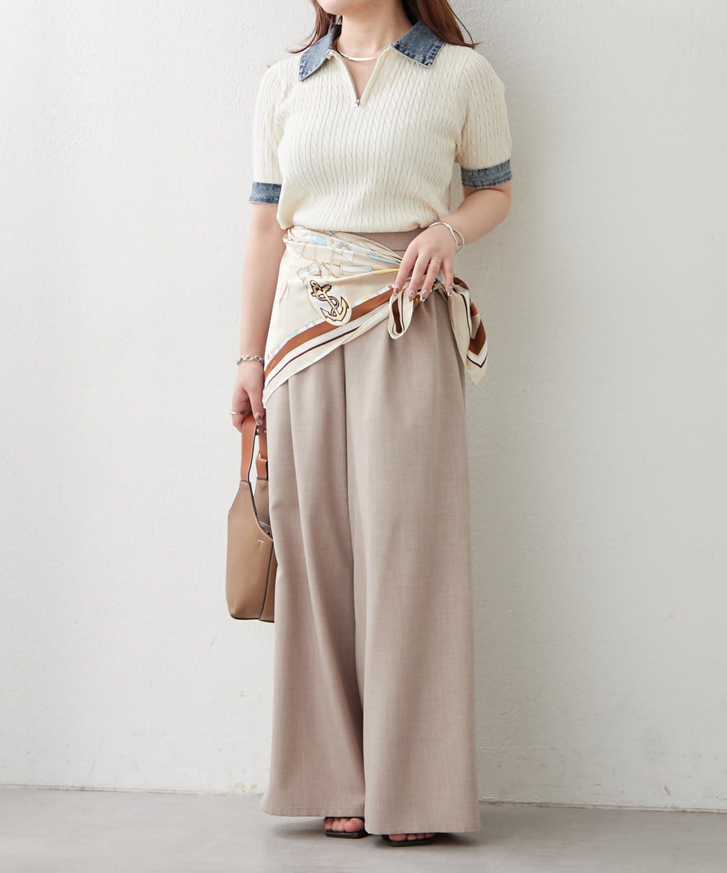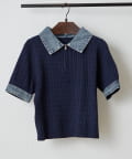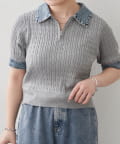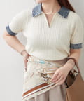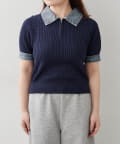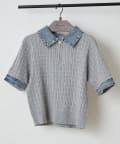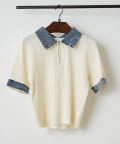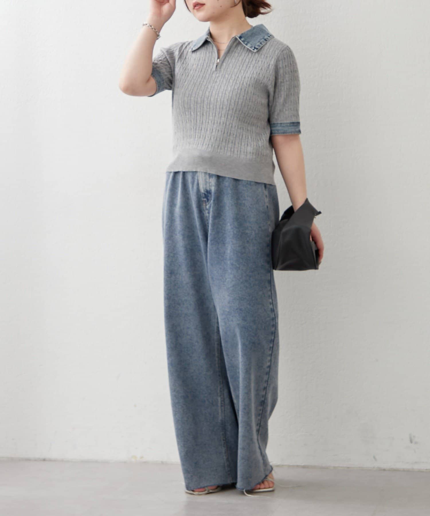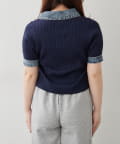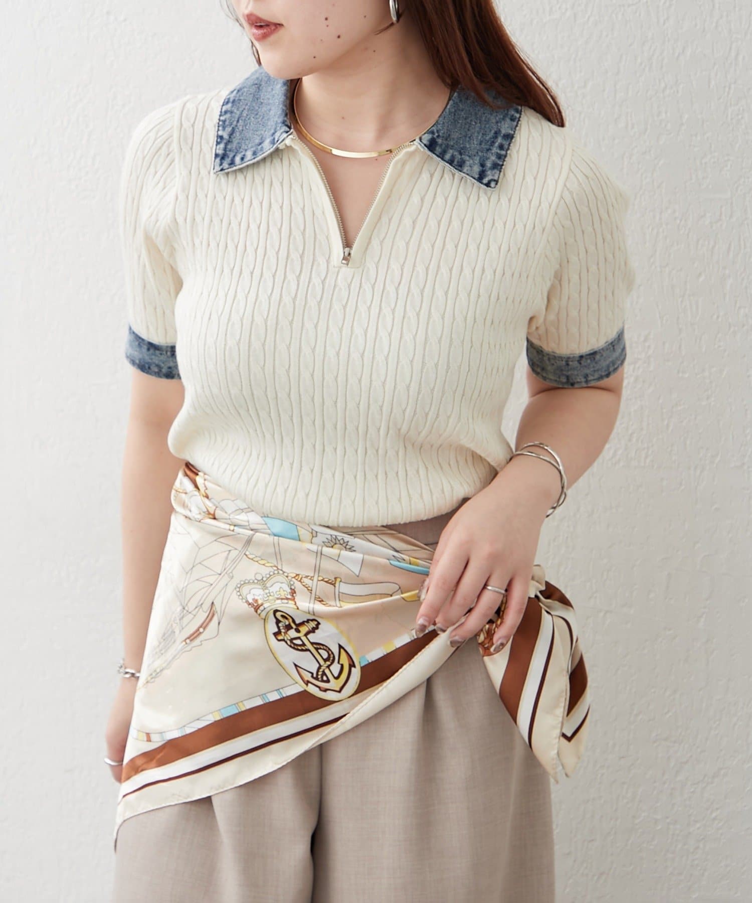 ・襟と袖口のデニム素材がアクセントになった、おしゃれなニットトップス