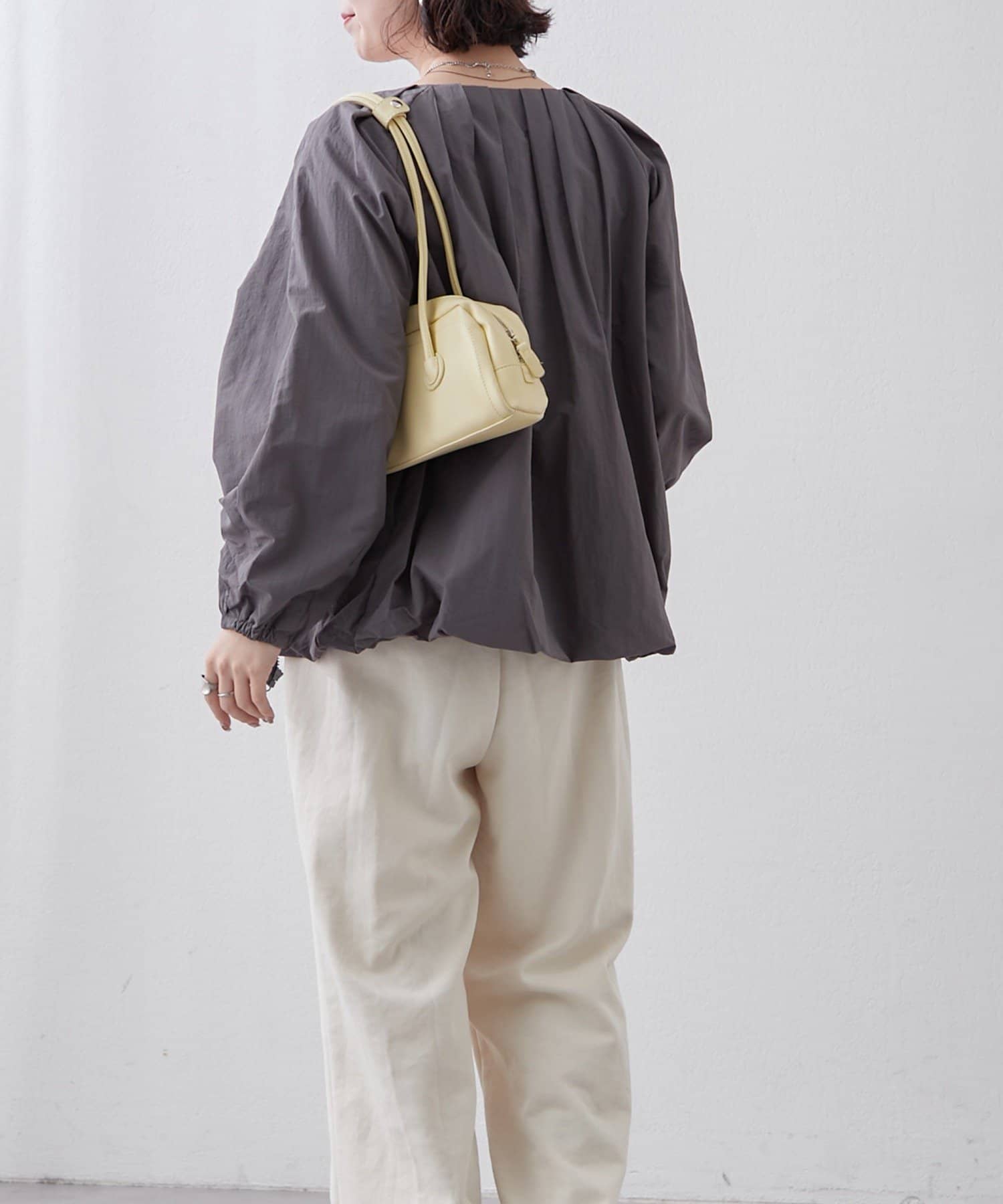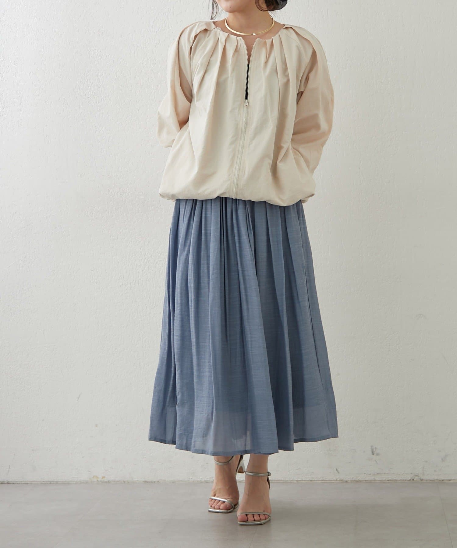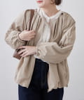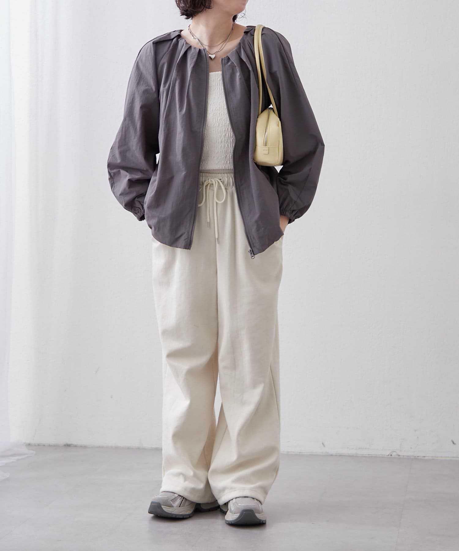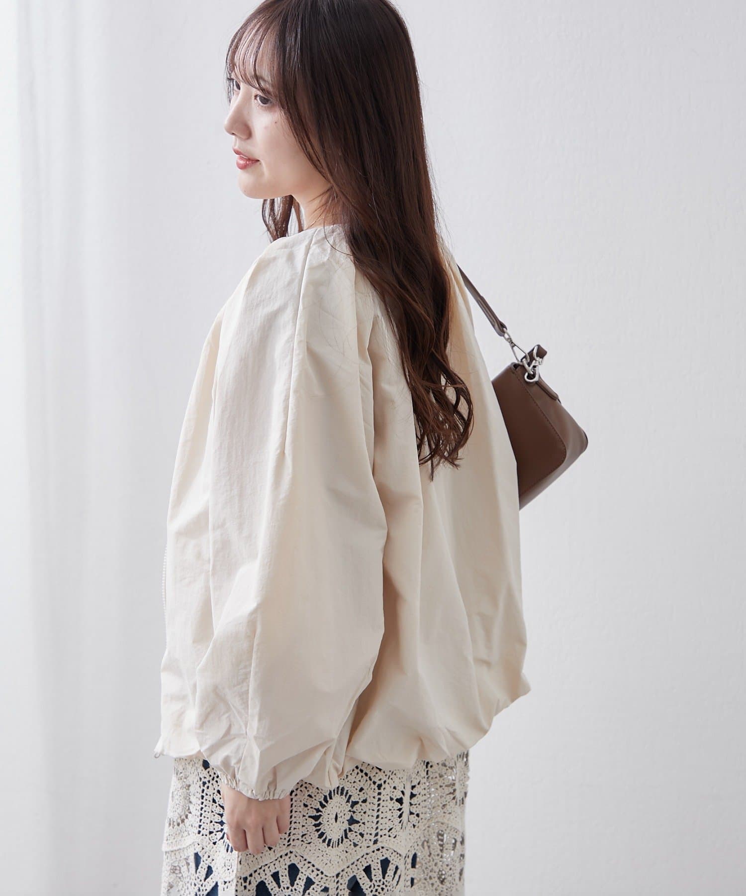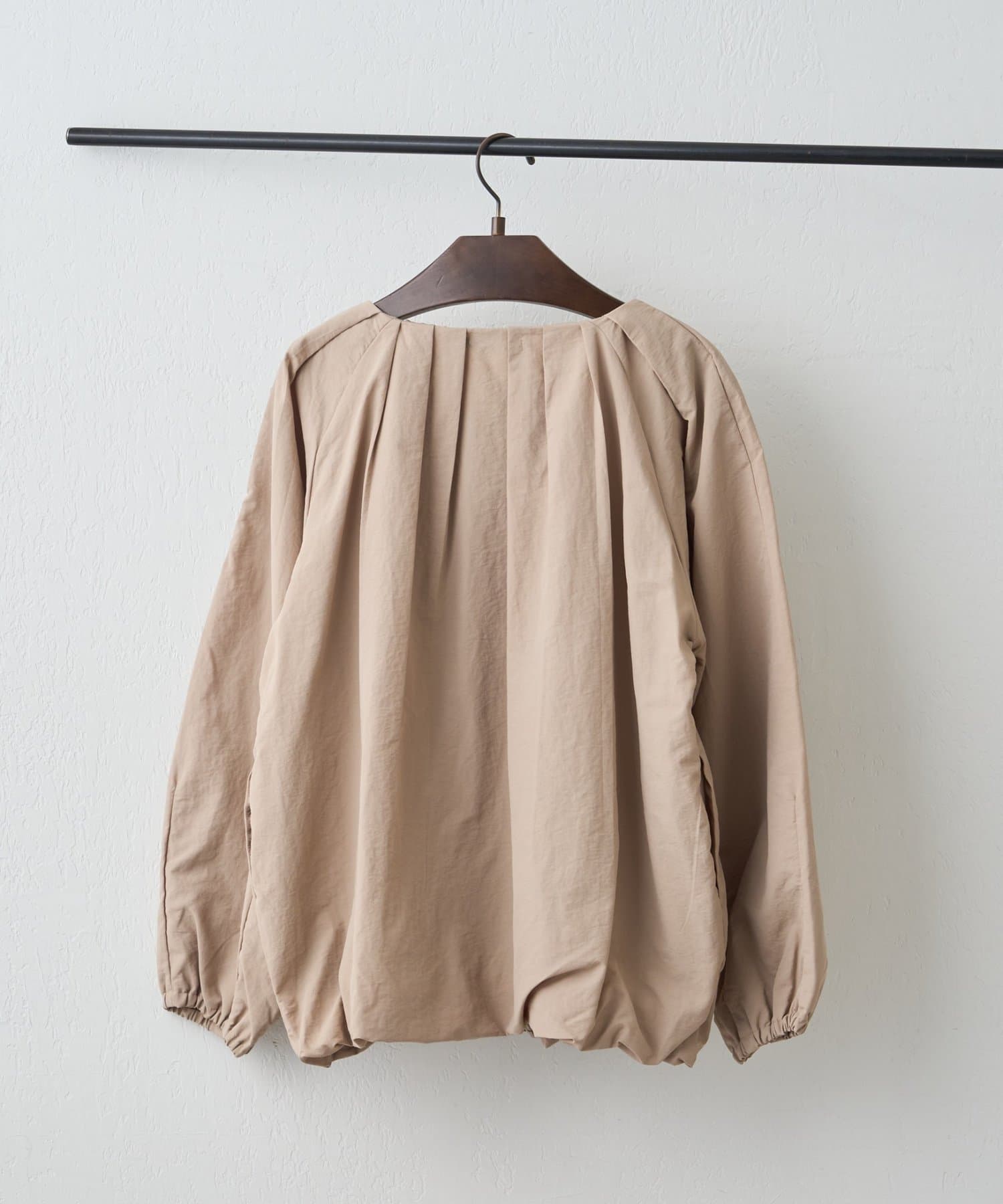 ・ふんわりとしたシルエットが魅力のタックブルゾン。ネックラインと袖口のギャザーが、女性らしい柔らかな印象をプラス