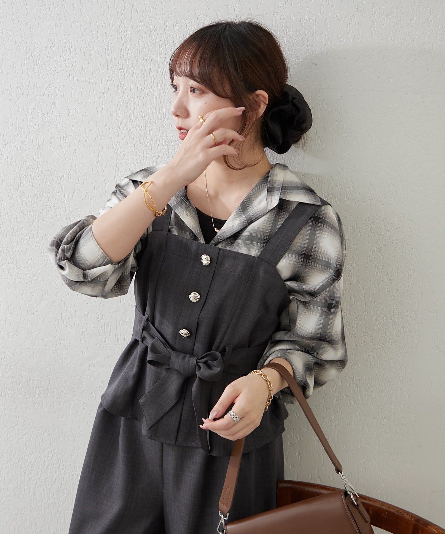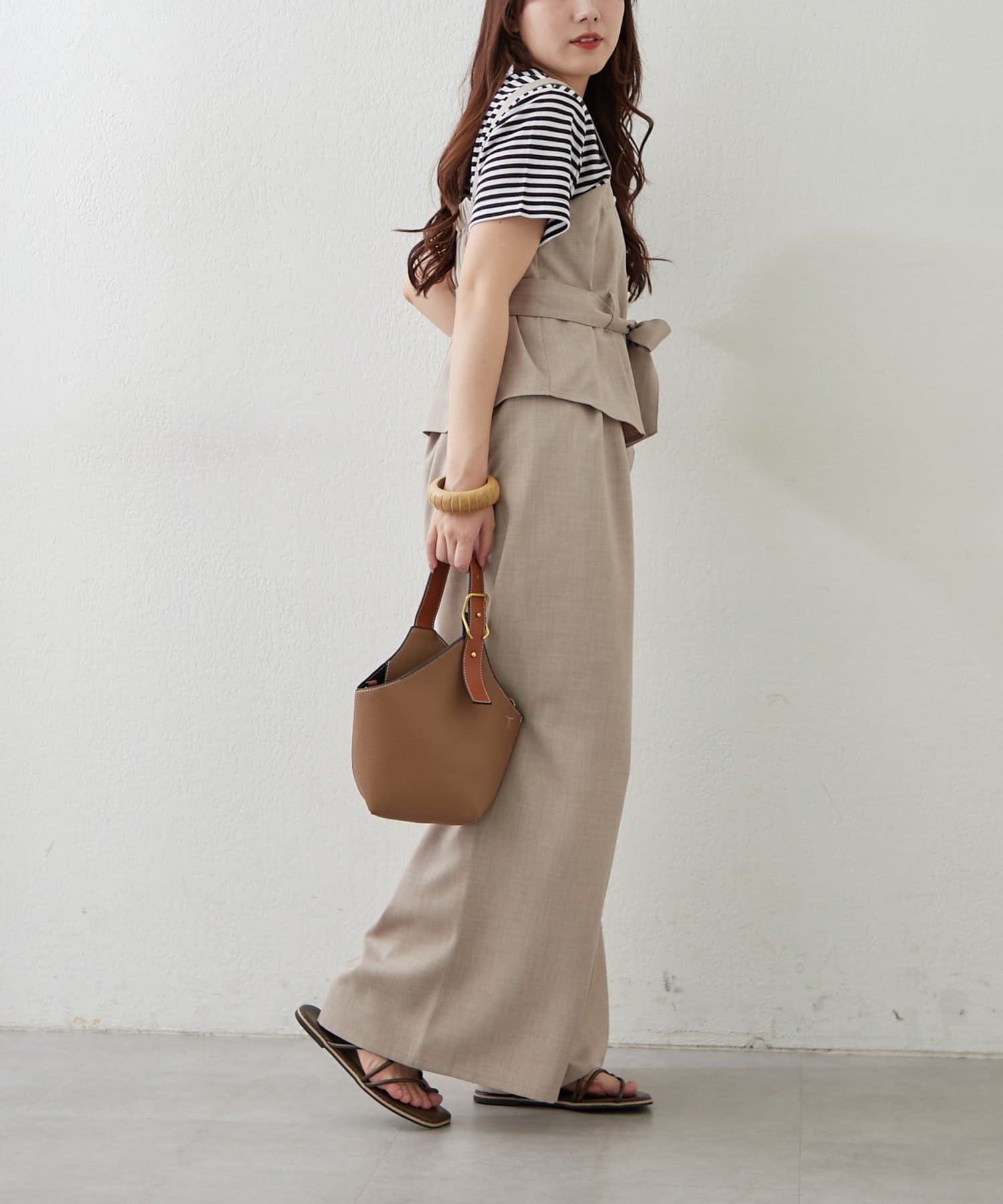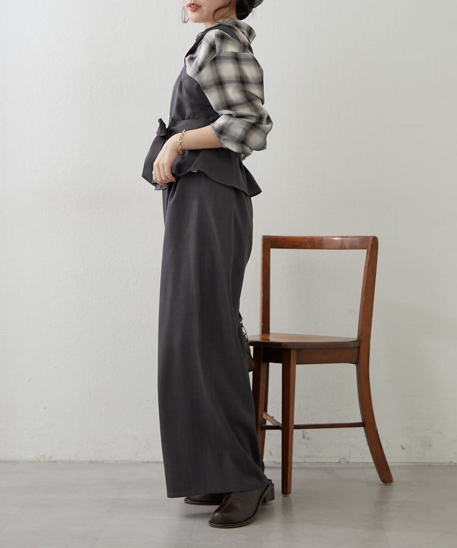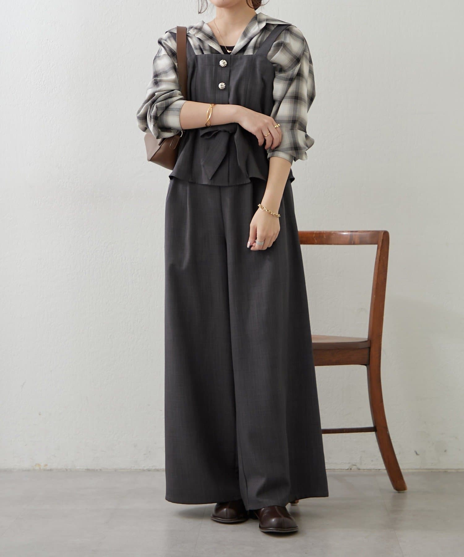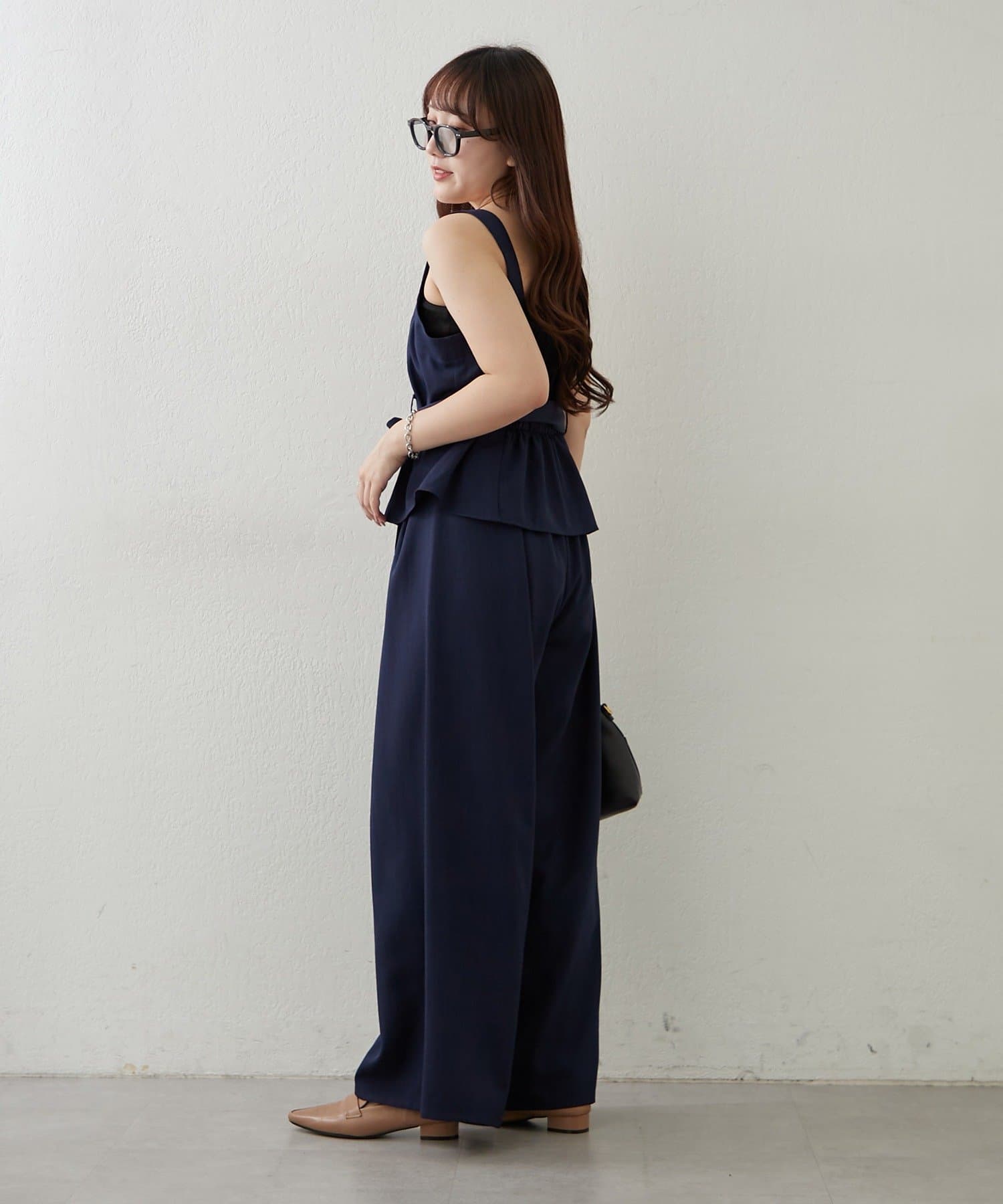 ・ビスチェの上からジャケットを羽織り、ワイドパンツにブラウスをインすれば、オフィススタイルにも◎