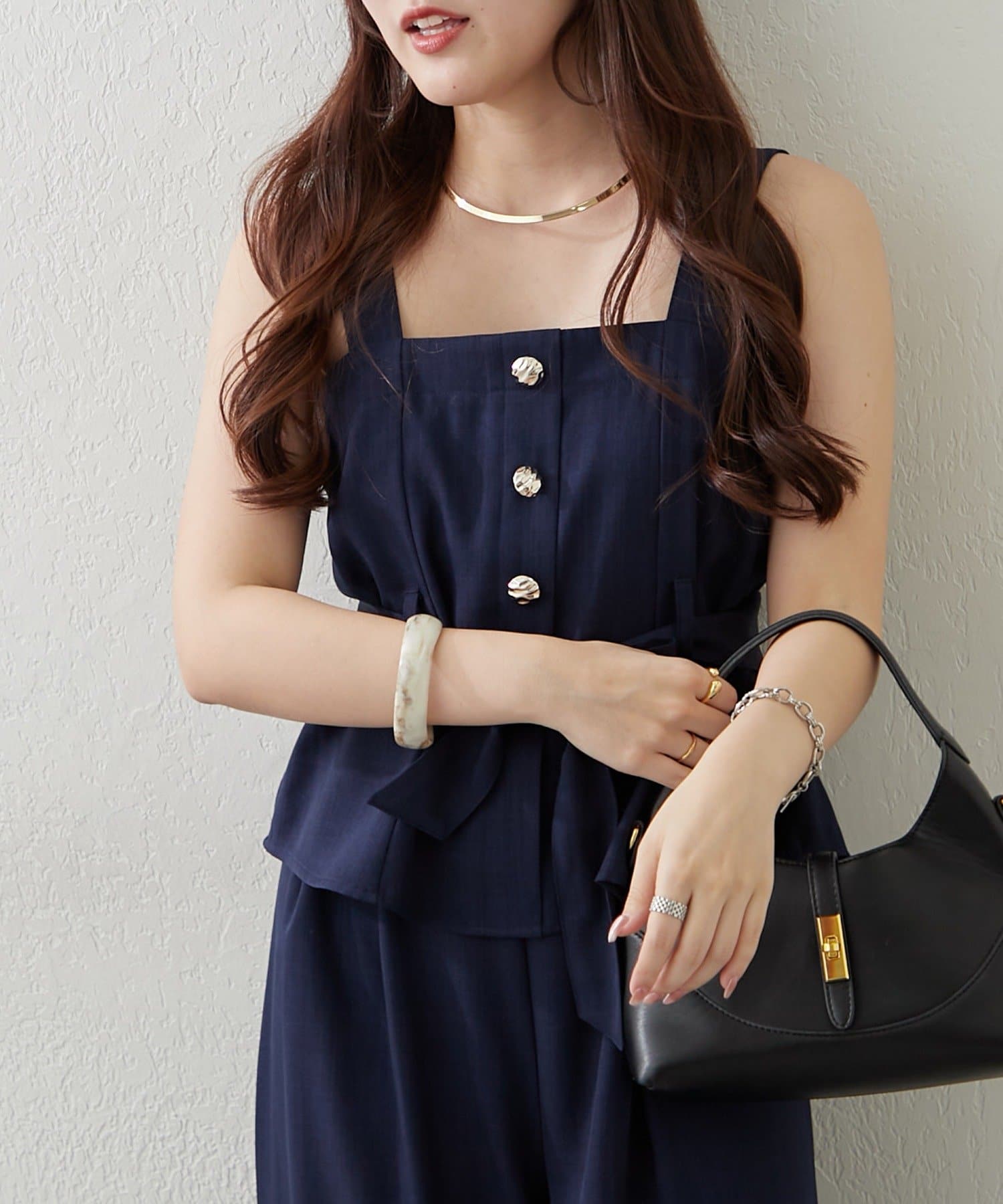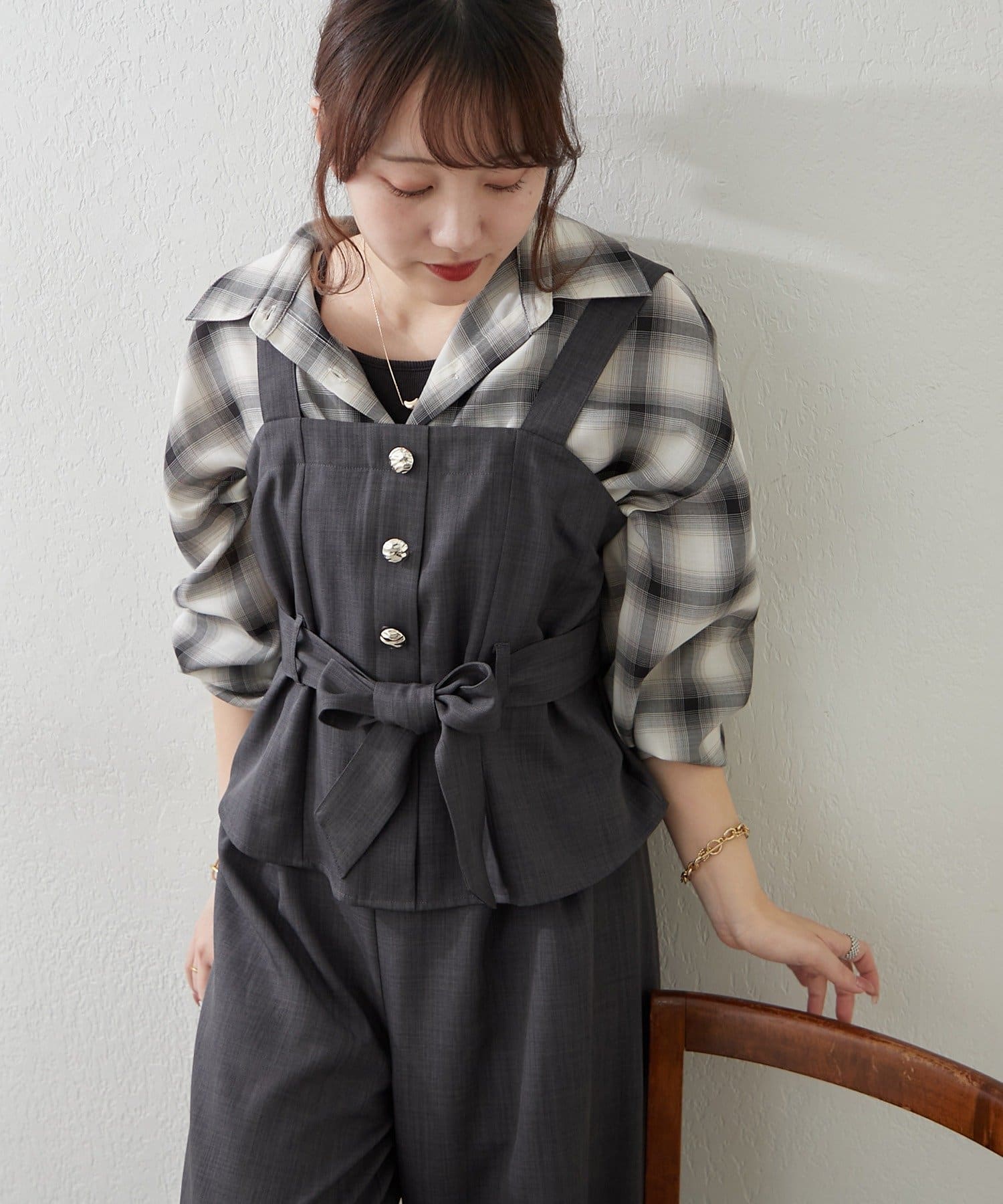 ・ビスチェは、上品なボタンとリボンがアクセントになり、女性らしさを演出