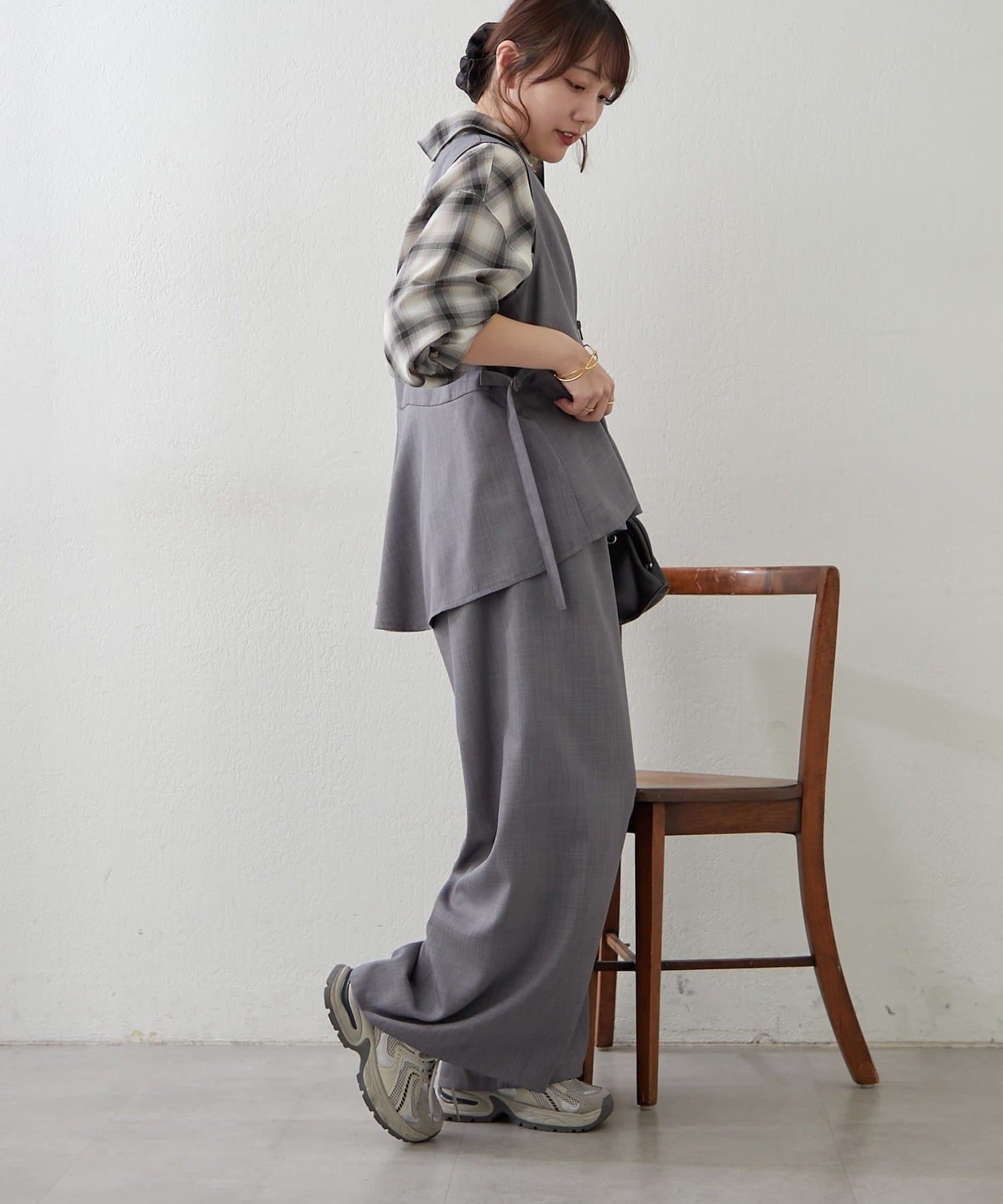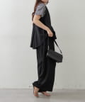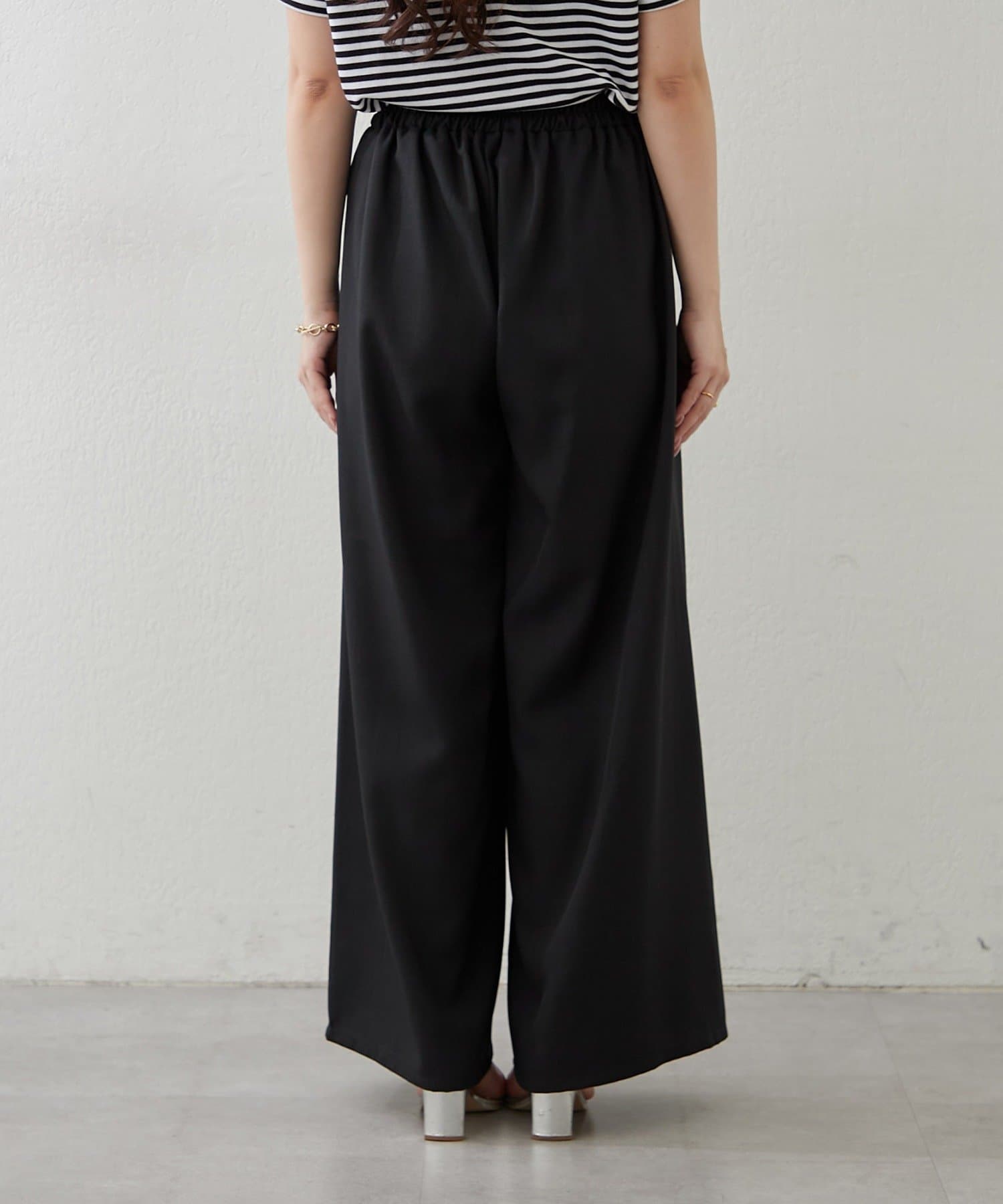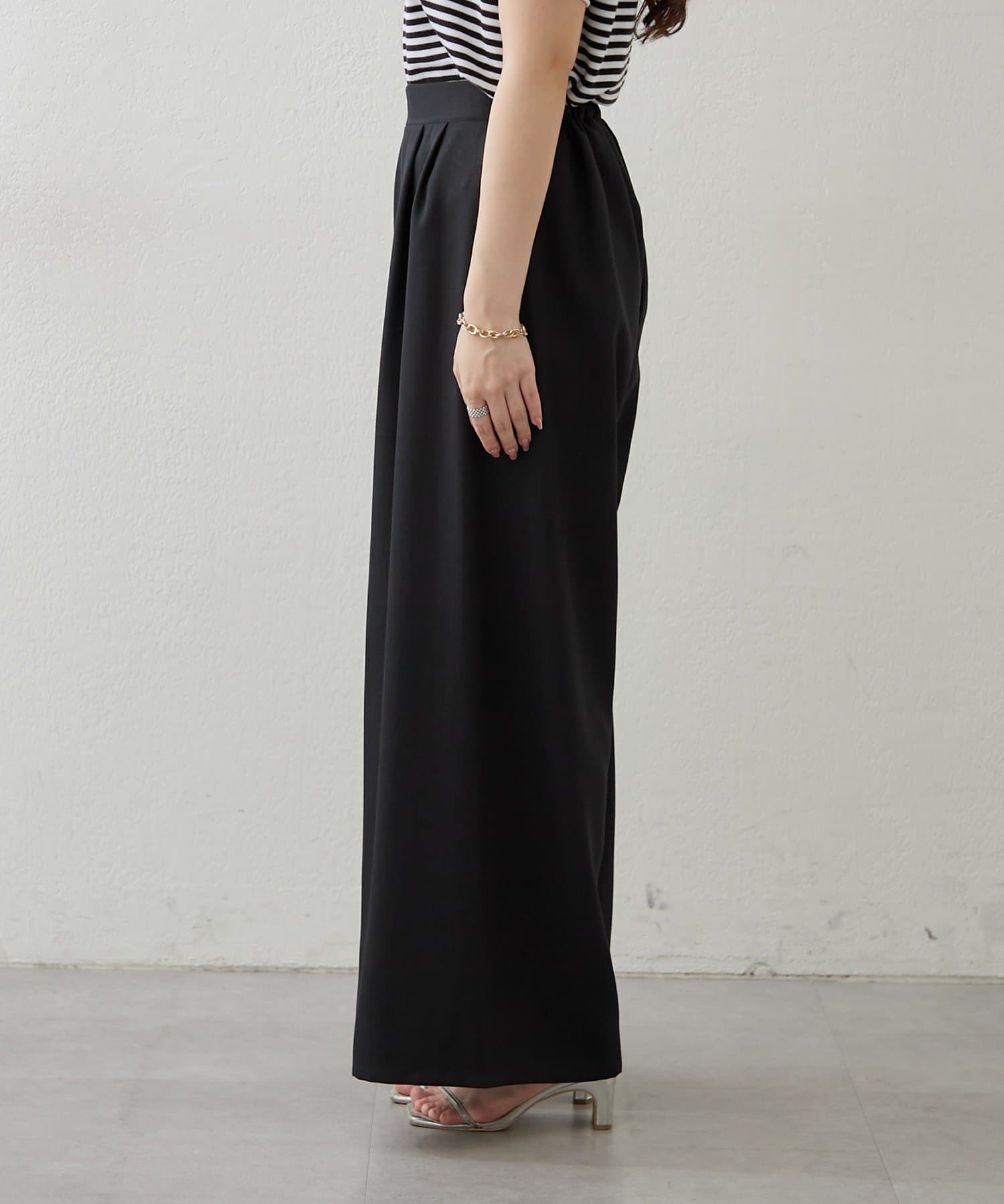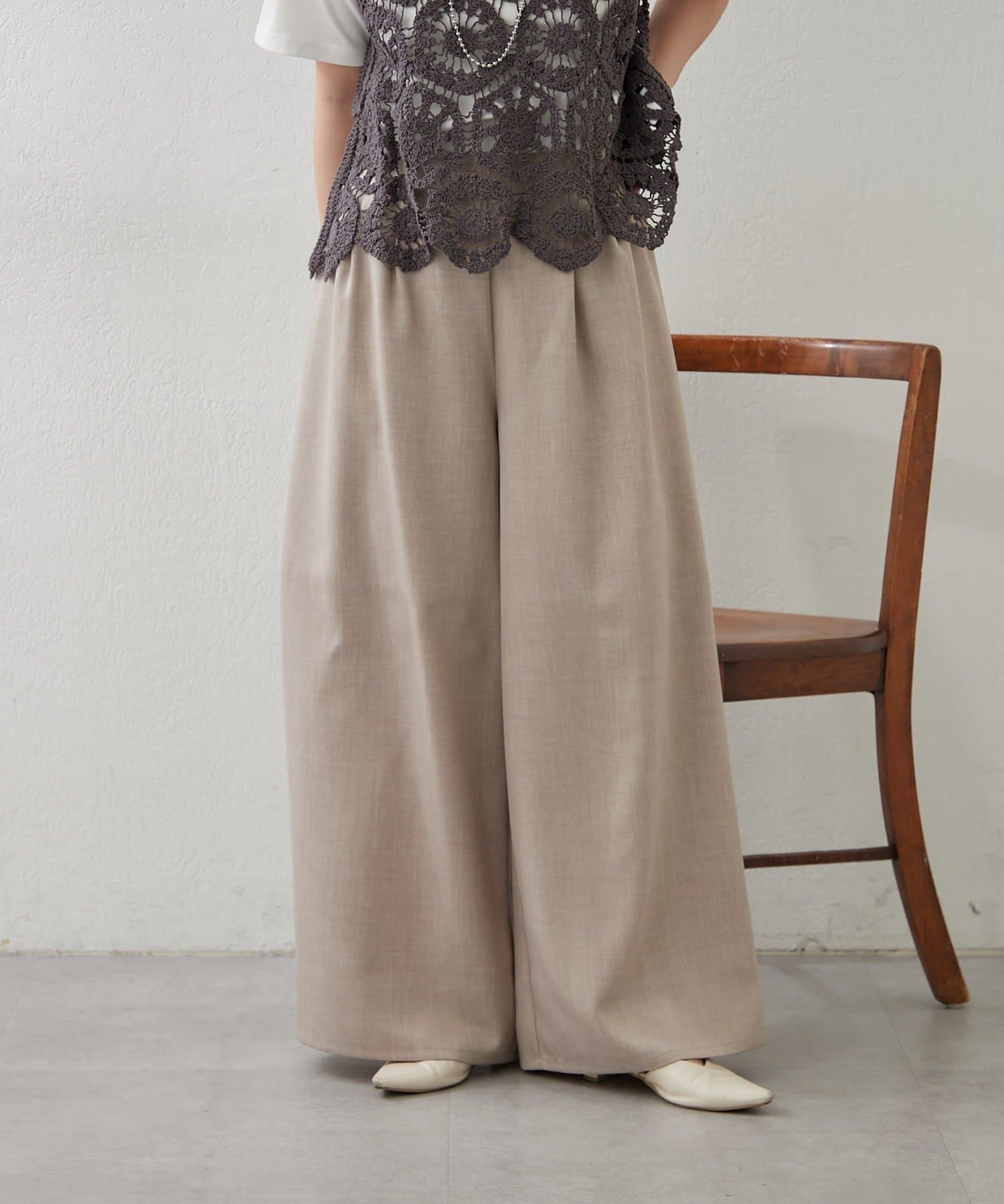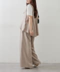 ・ボトムスは足のラインを拾いにくいワイドシルエットのスラックスパンツ