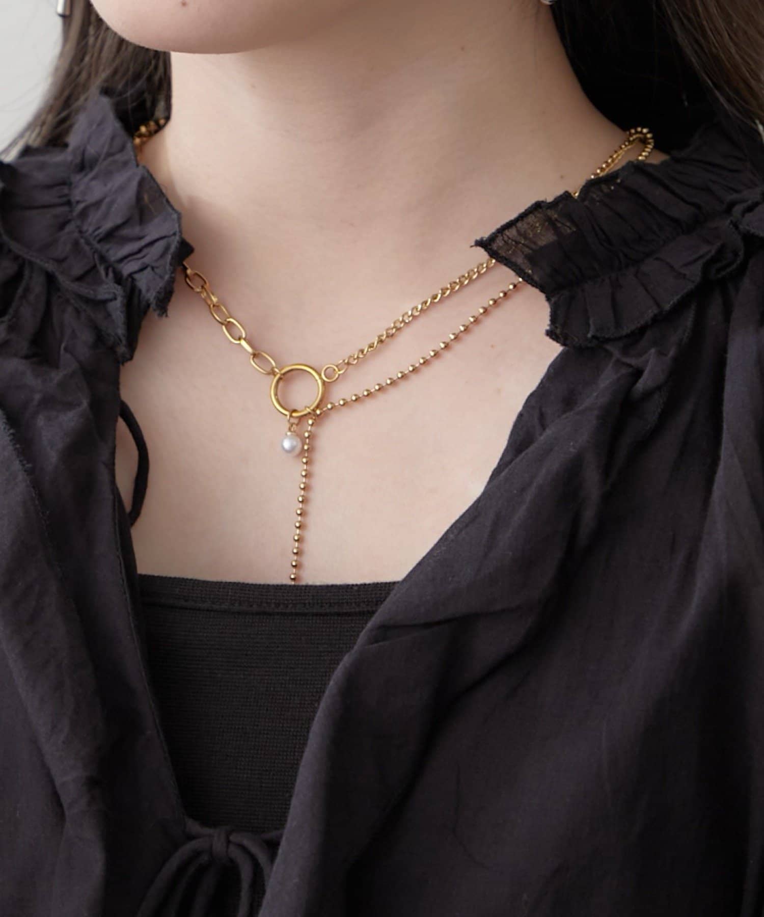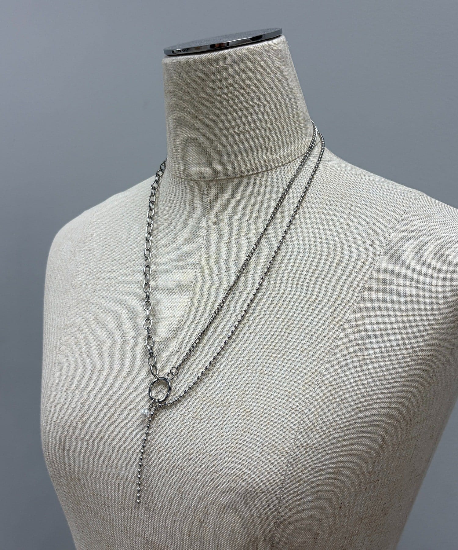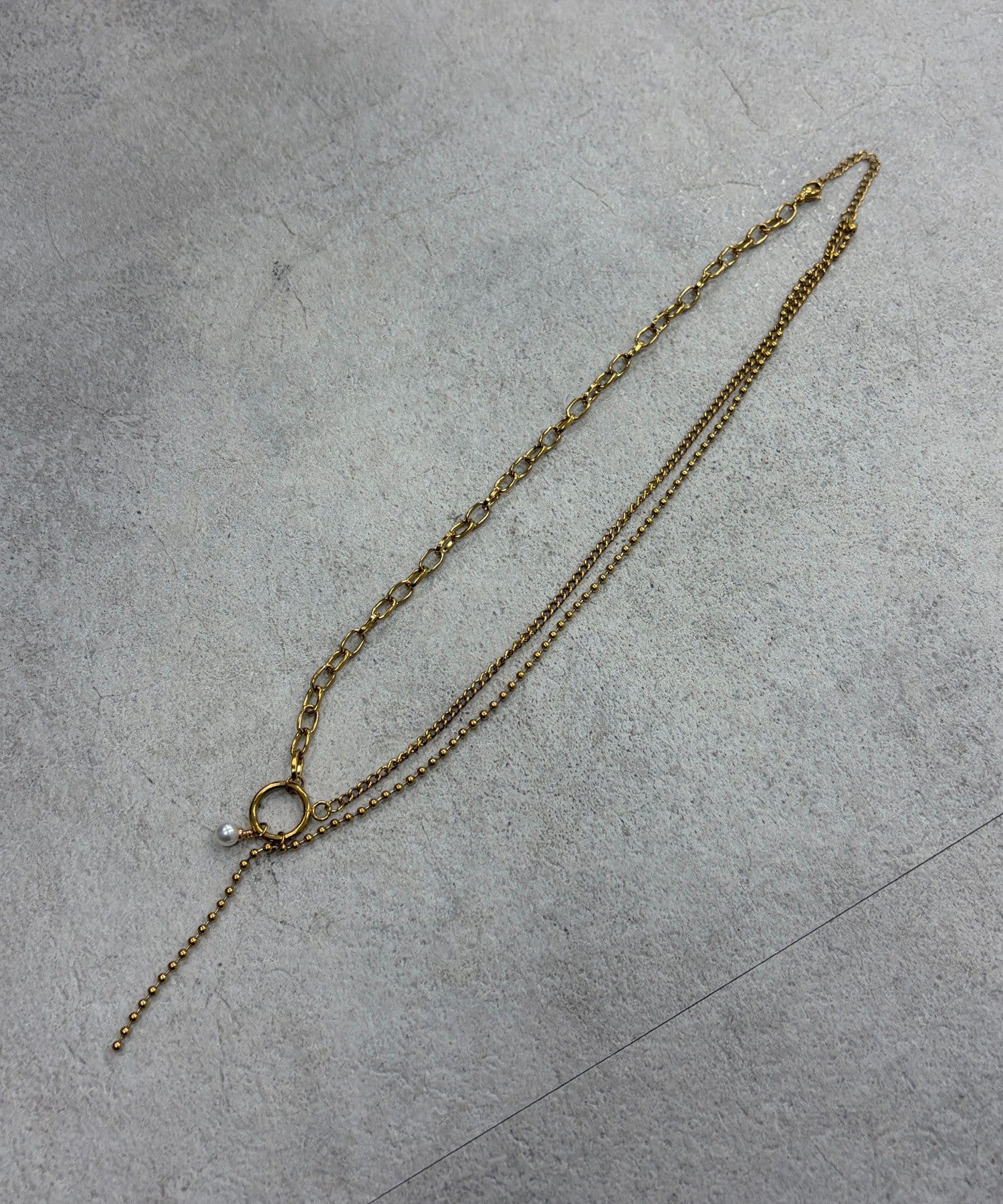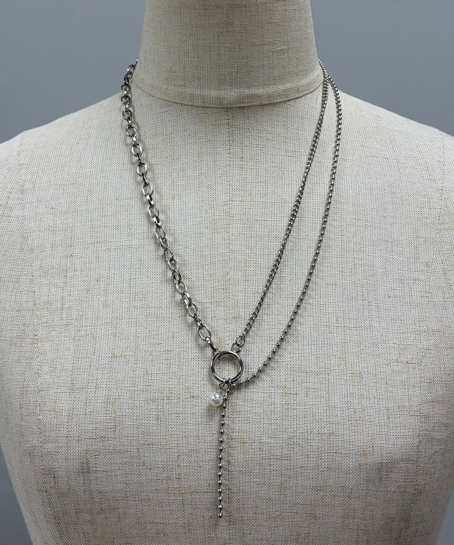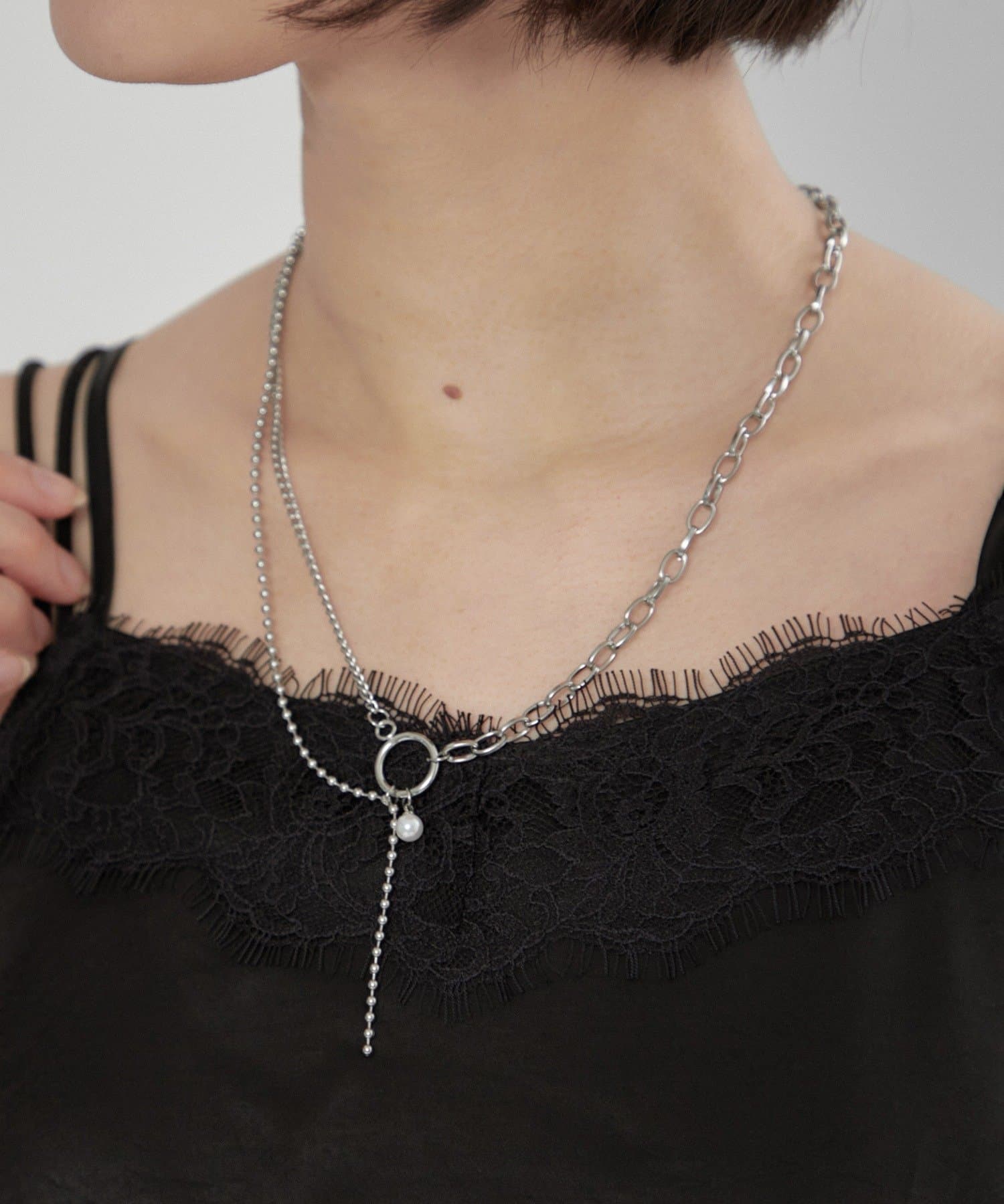 ・異なるチェーンを組み合わせた、アシンメトリーデザインのネックレス。
