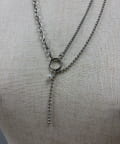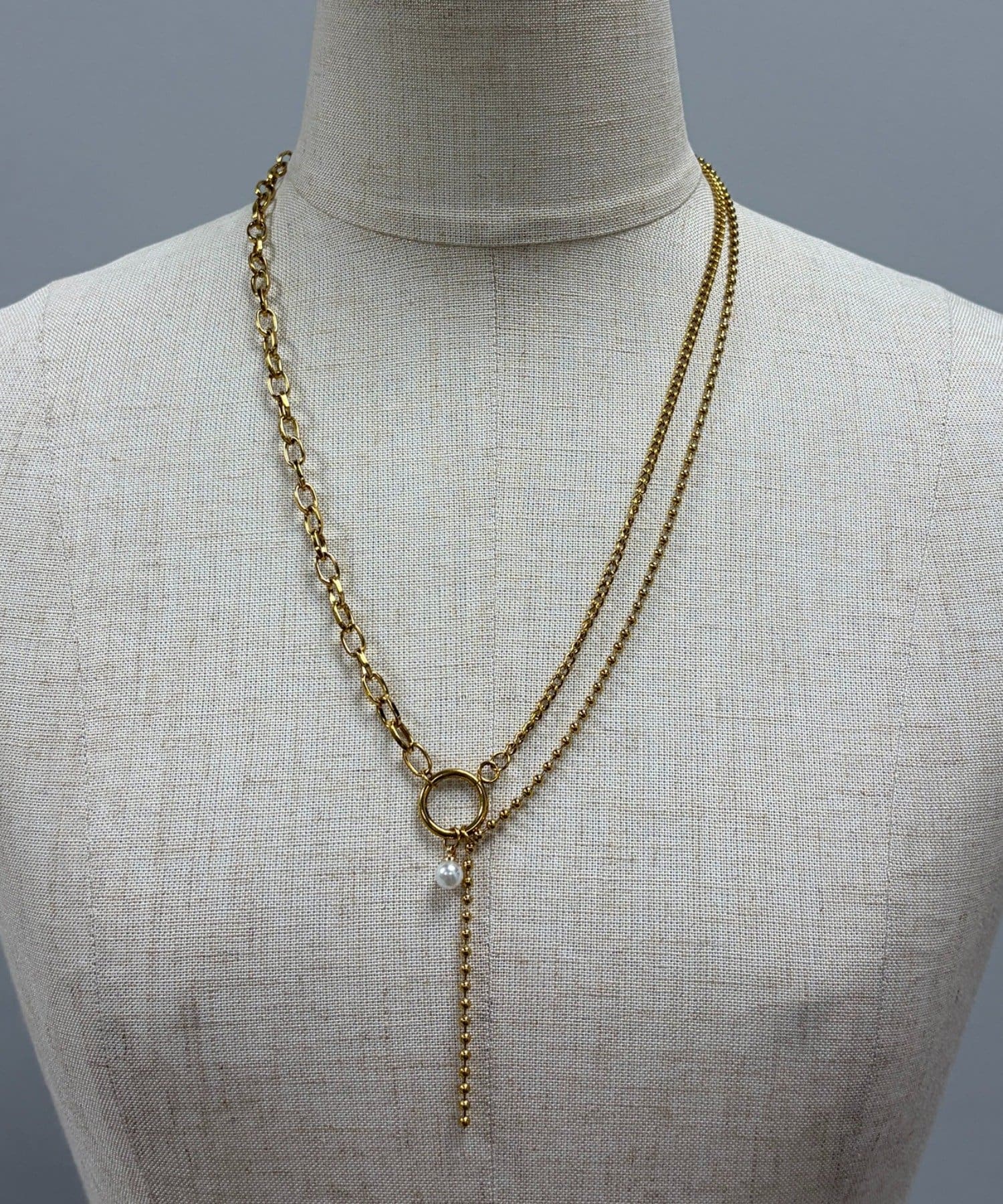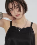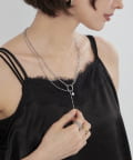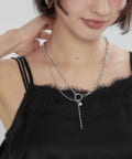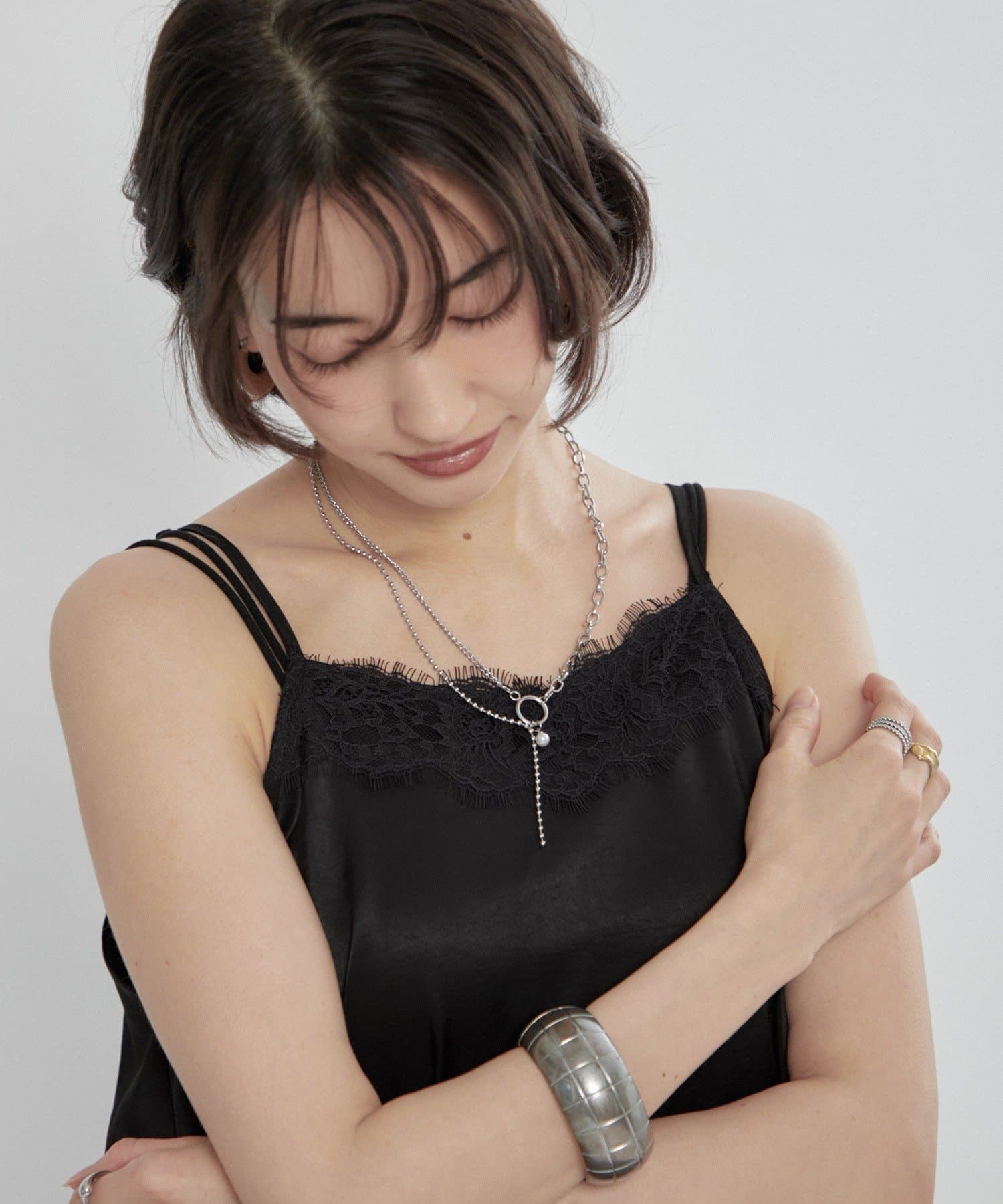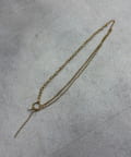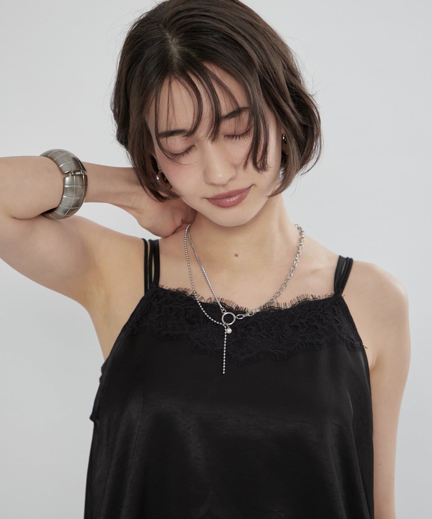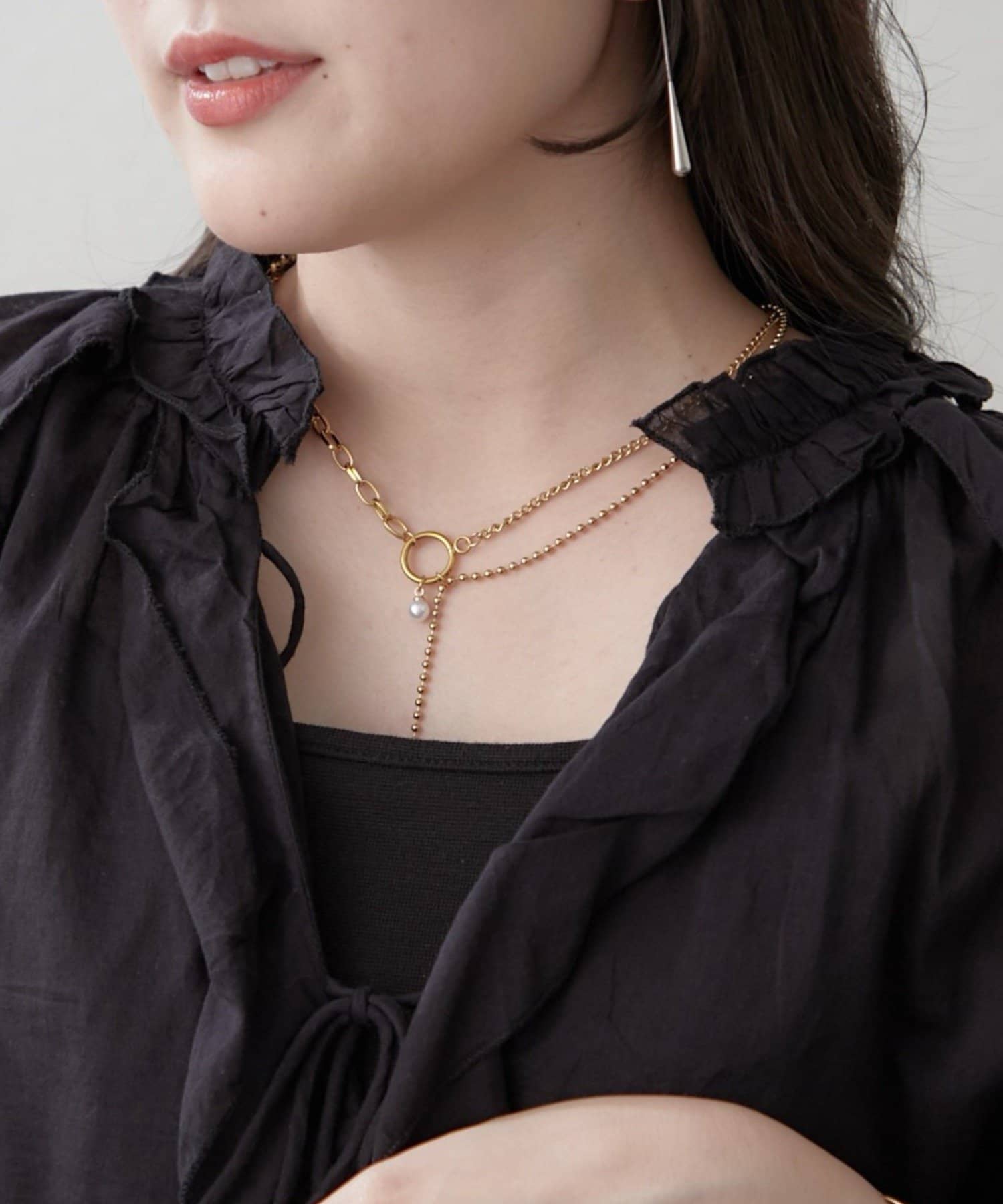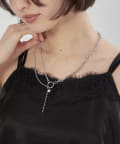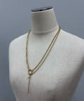 ・異なるチェーンを組み合わせた、アシンメトリーデザインのネックレス。