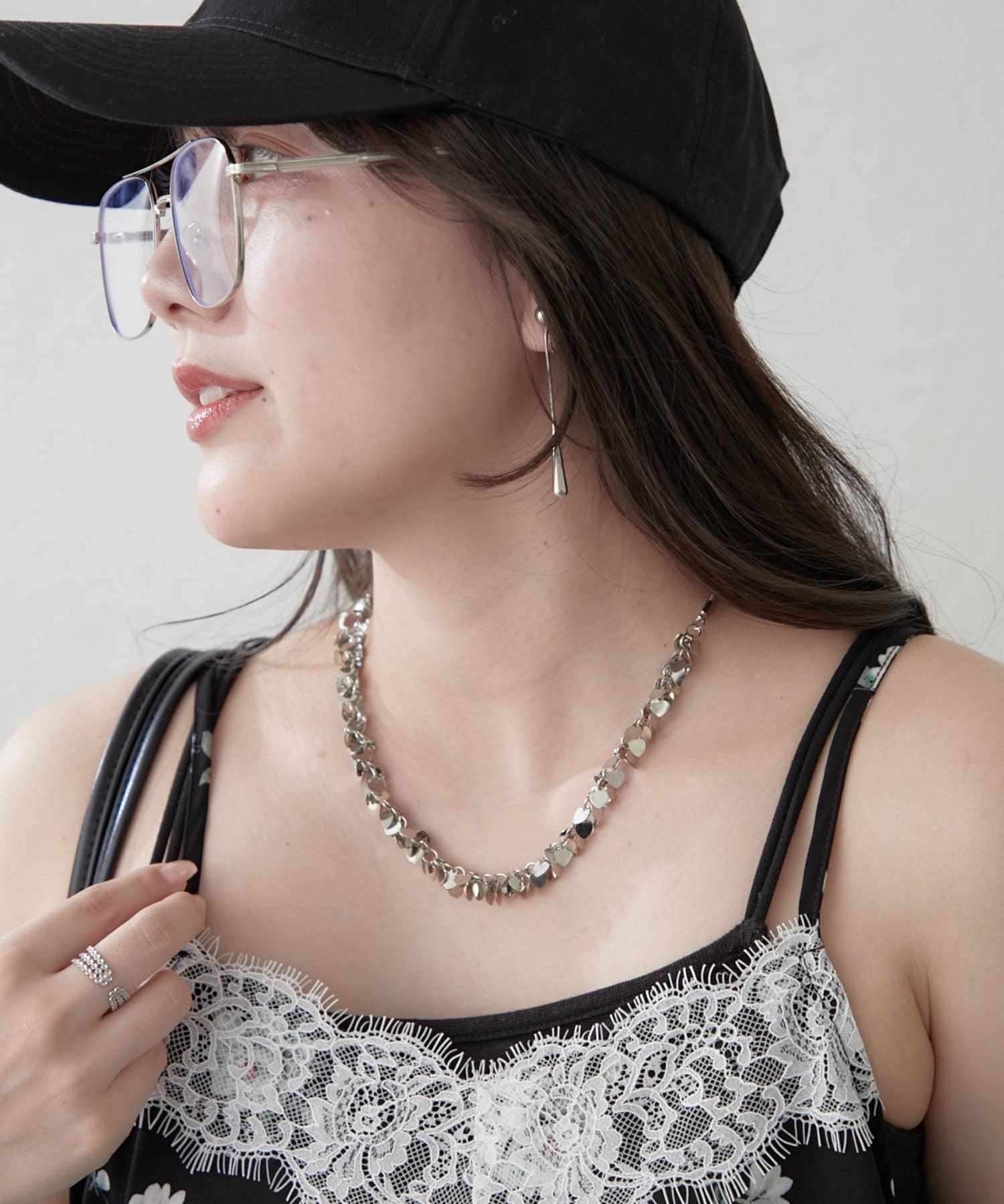 ・首元に沿うデザインでデコルテを美しく見せ、シンプルなコーディネートにも華やかさをプラス。