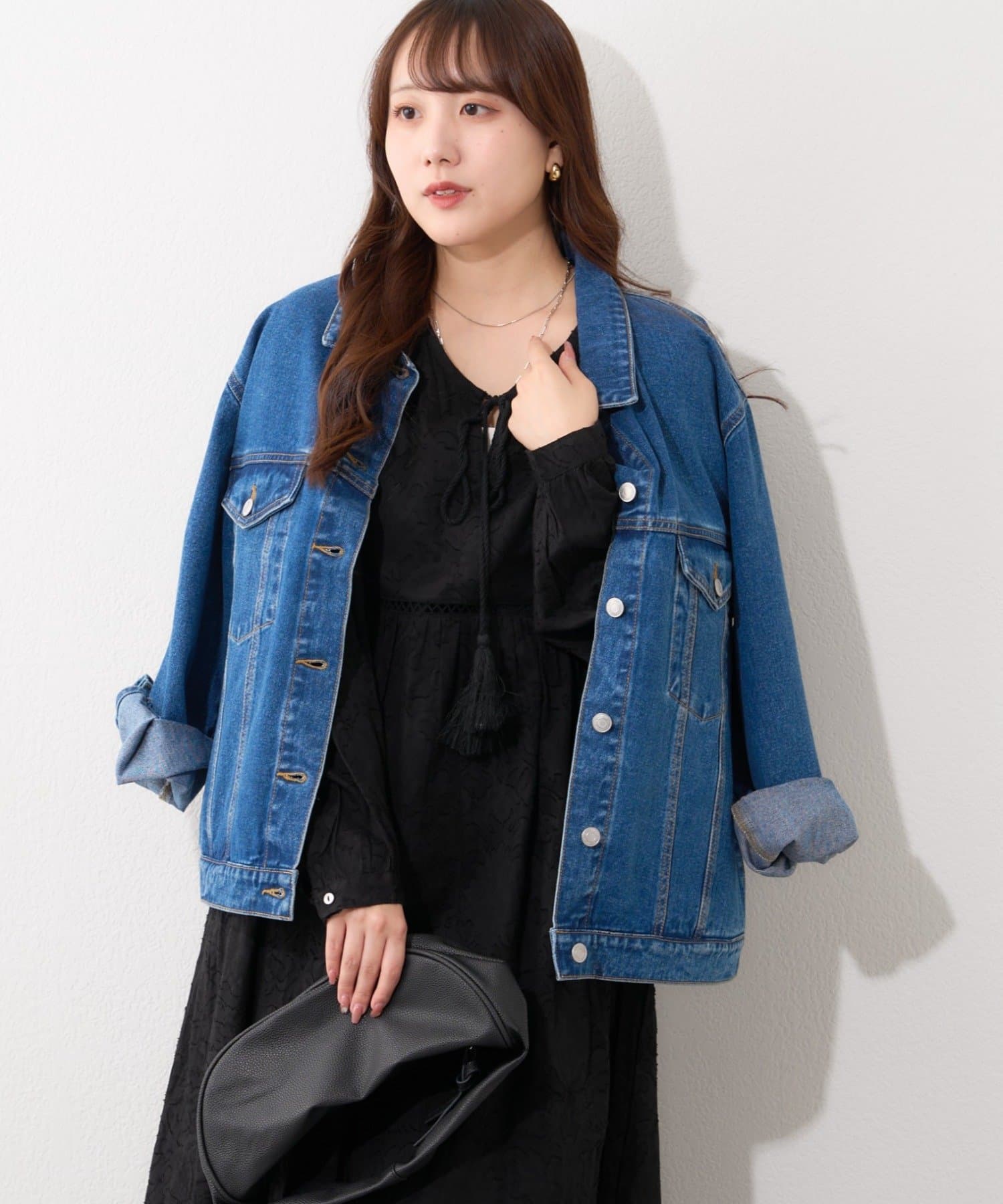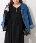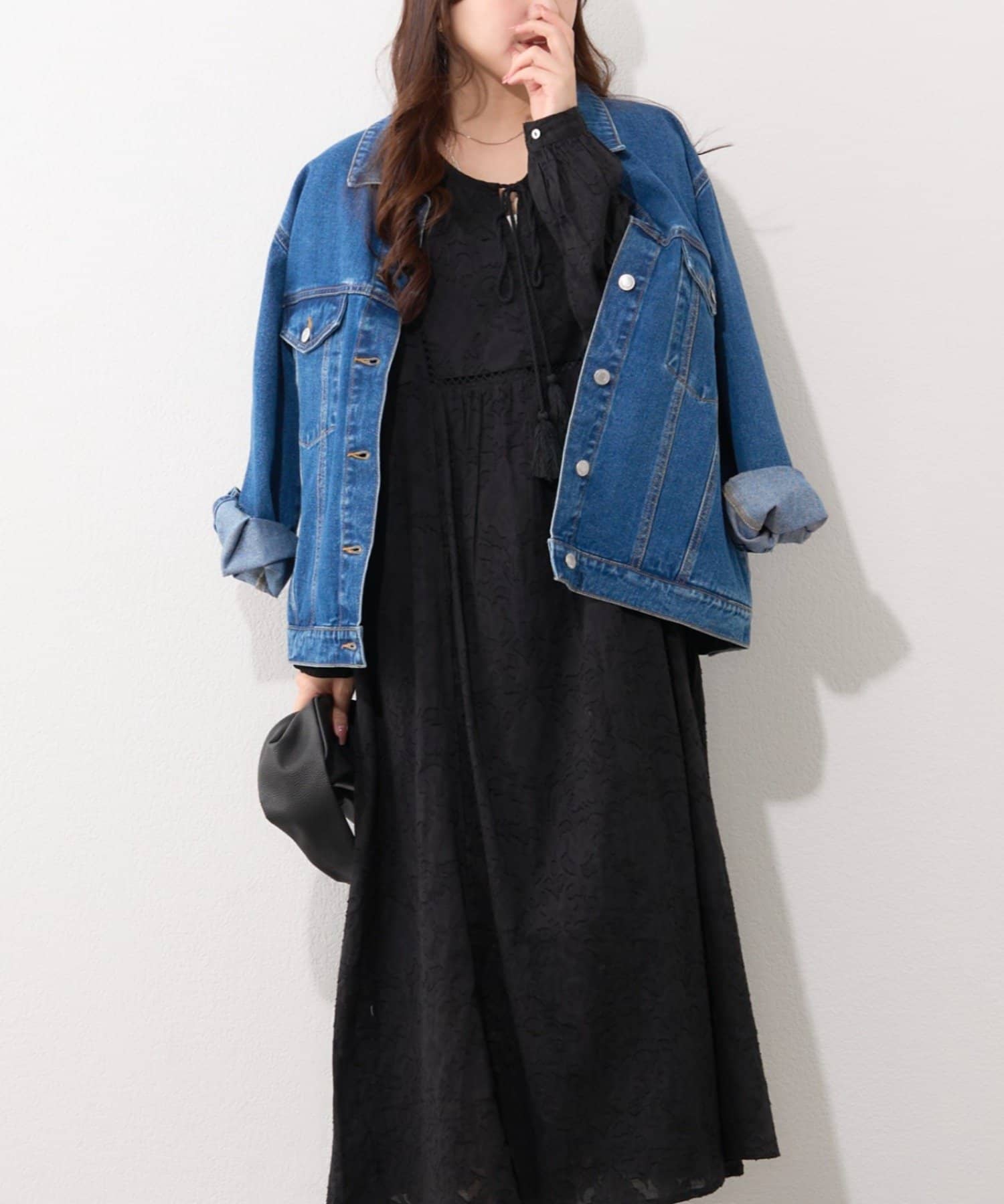 ・ワンピースにデニムジャケットを羽織り、足元はスニーカーでカジュアルダウン