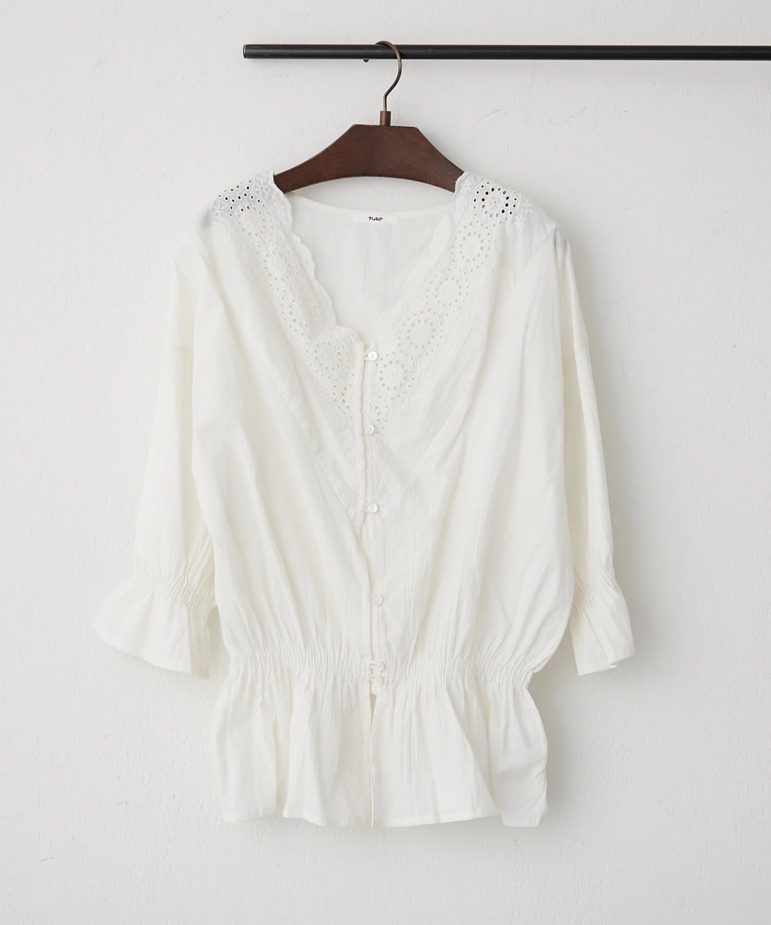 ・ネックラインの繊細なレースが、顔まわりを華やかに彩るブラウス