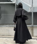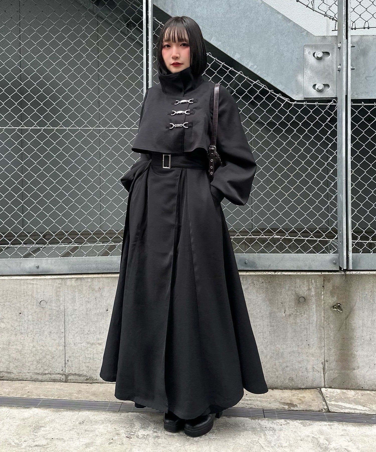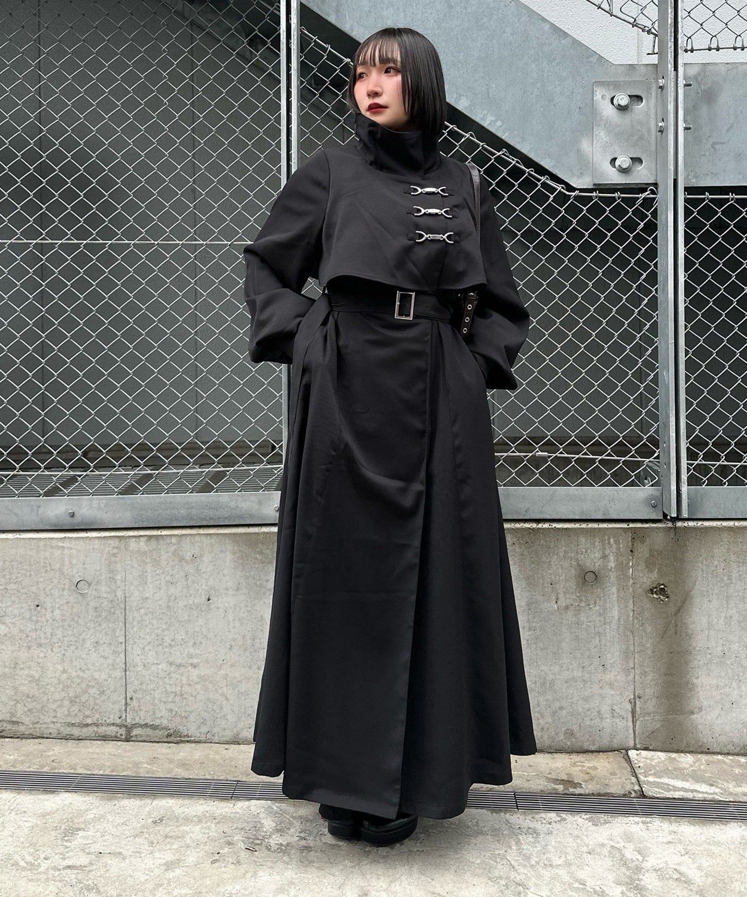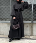 ・たっぷりと生地分量を持たせたフレアシルエットに、胸元のビット金具とベルトのバックルが映える、モードなエッセンスを効かせたデザインです。