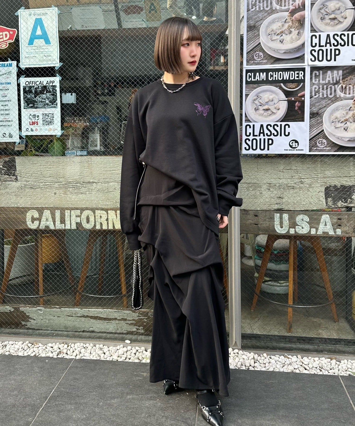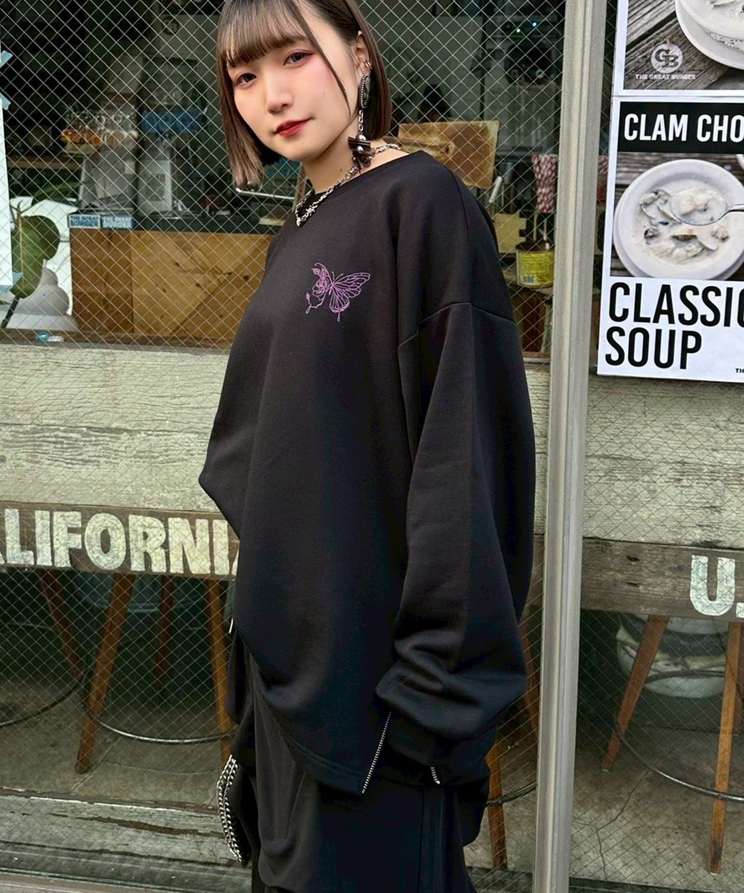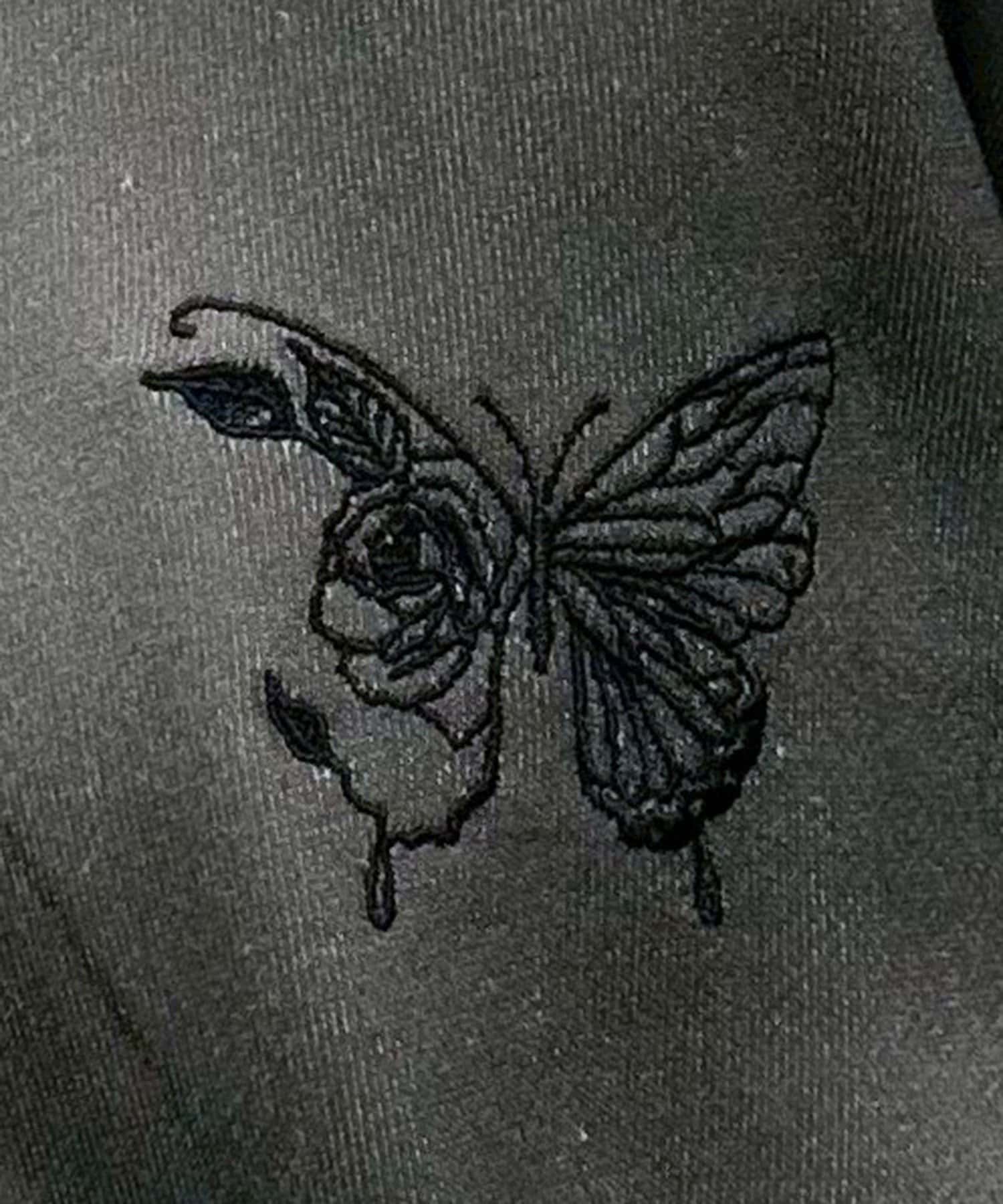 ・色違いのブラックは無地ベースに、胸元のパープルのちょうちょ刺繍がアクセント。