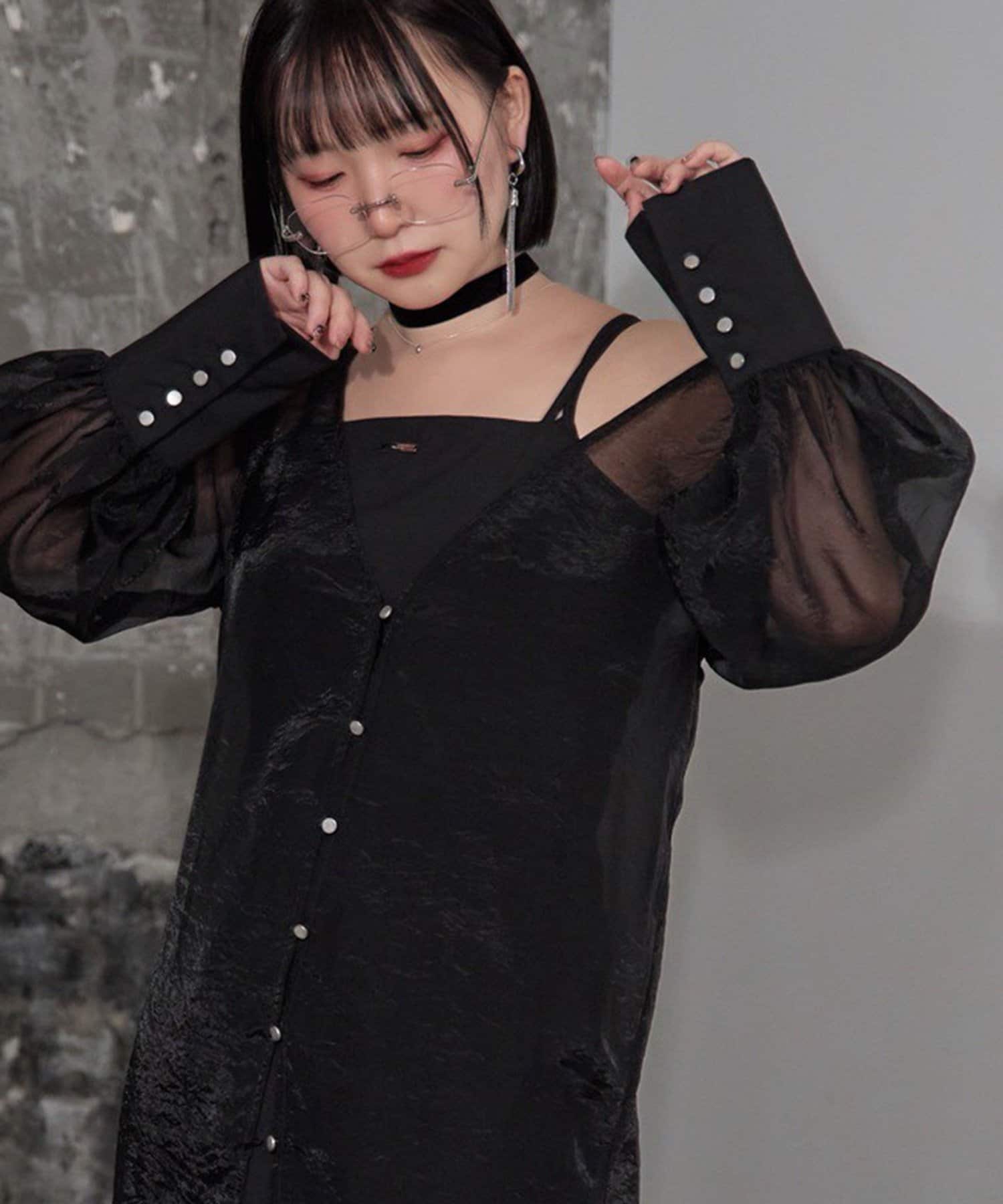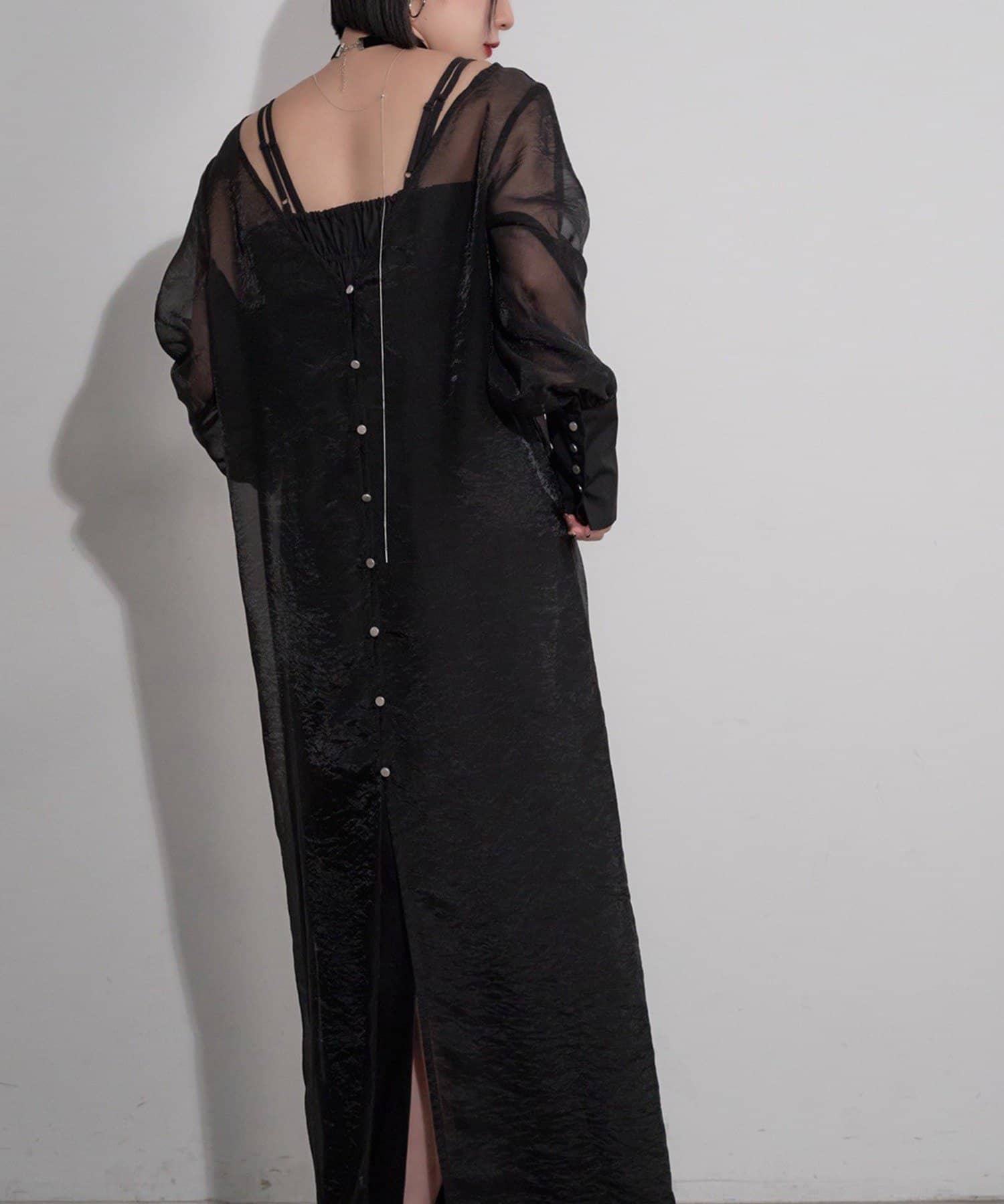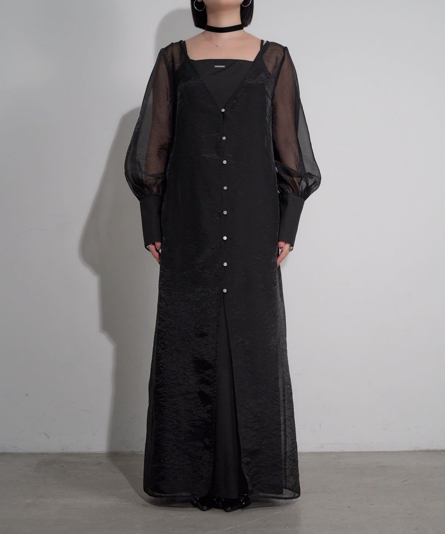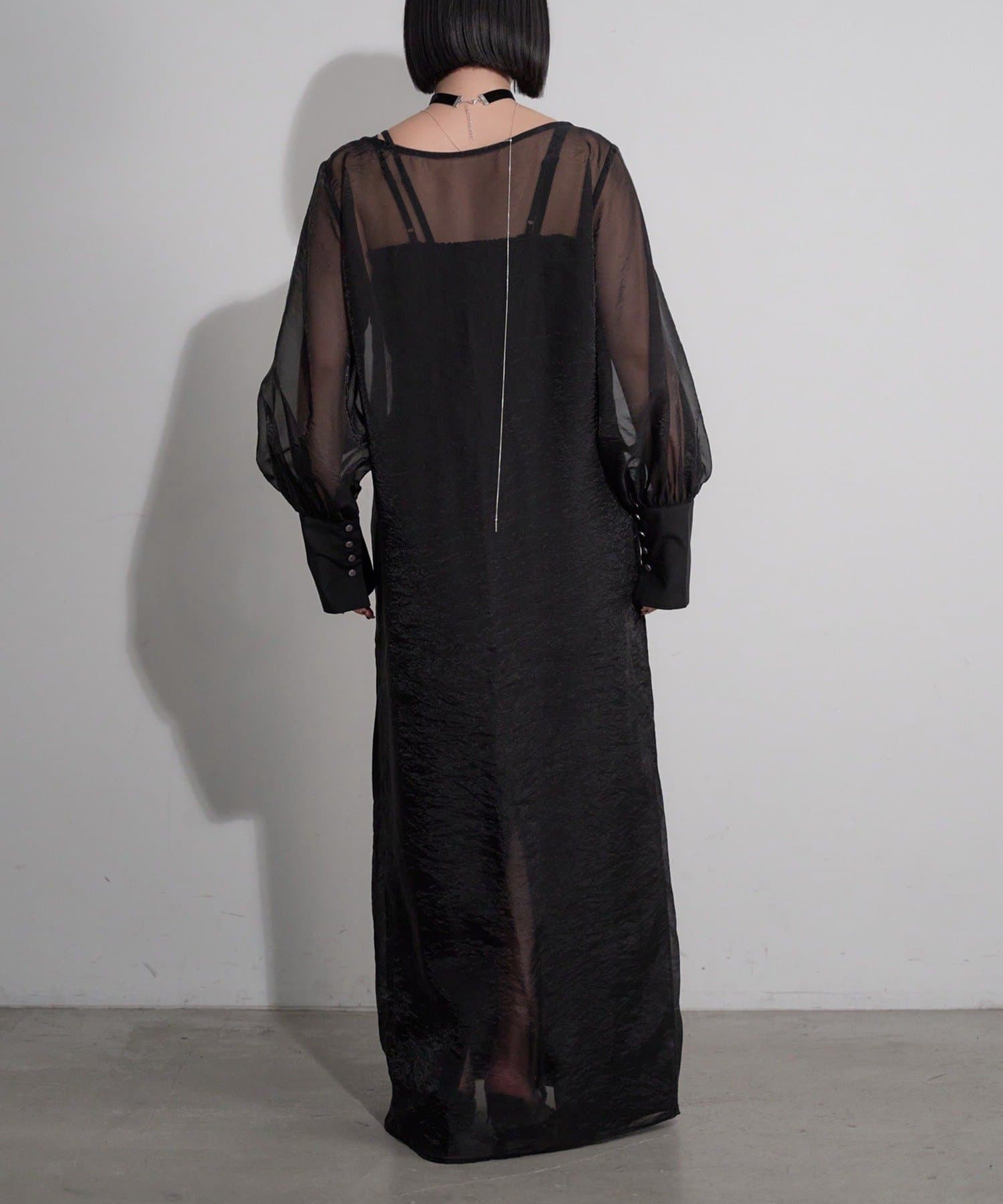 ・透け感のあるシアーワンピースと、シンプルなキャミワンピースがセットになったレイヤードアイテム。