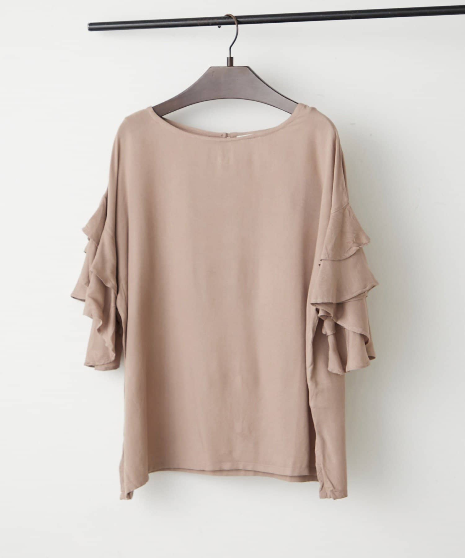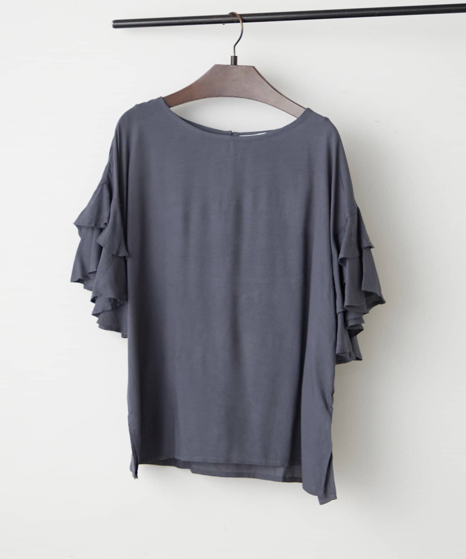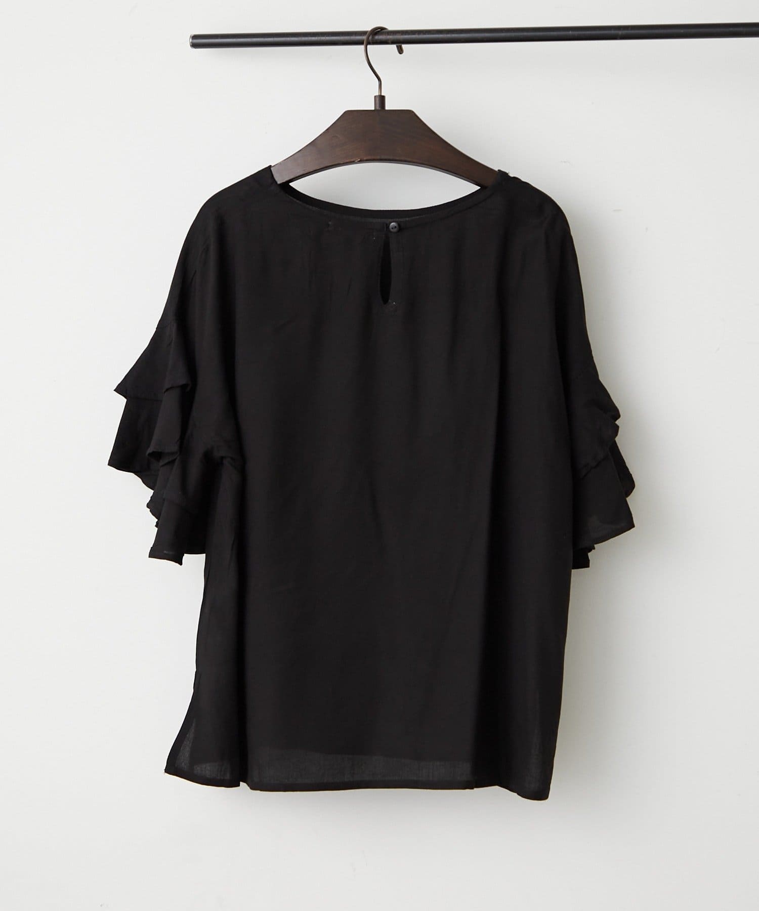 ・シンプルなシルエットながらも、袖のフリルが華やかさをプラスし、普段使いはもちろん、ちょっとしたお出かけにもぴったりです