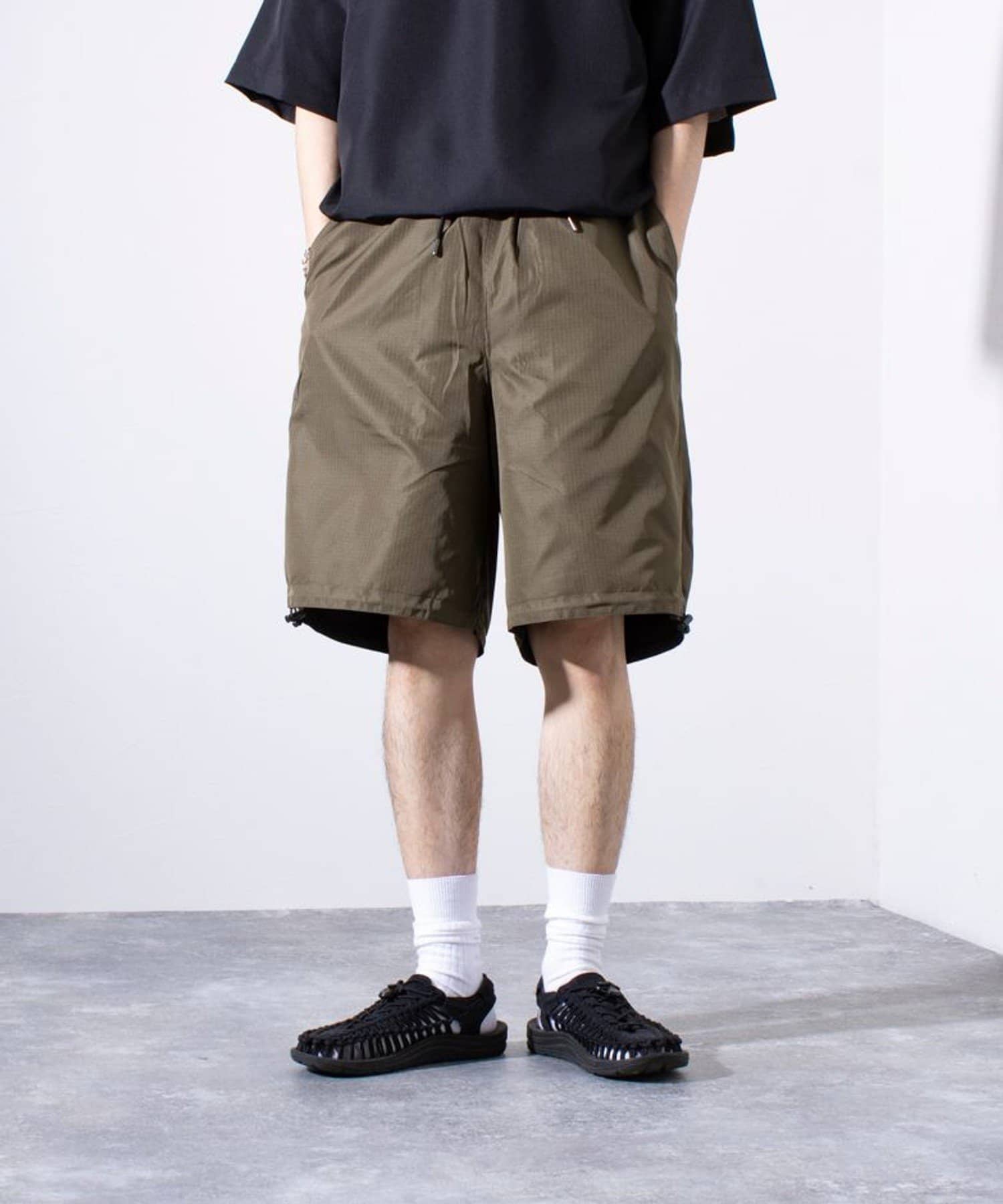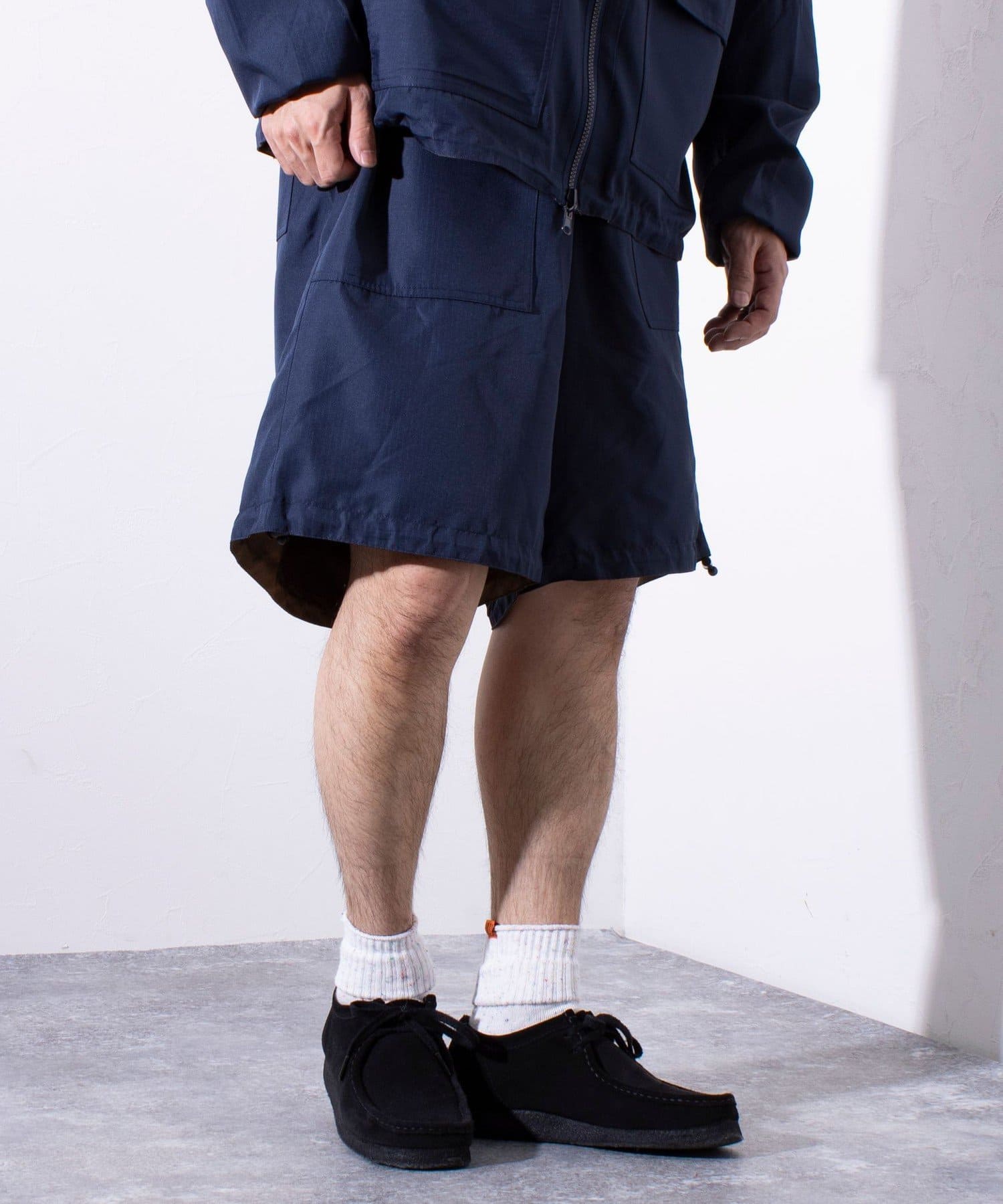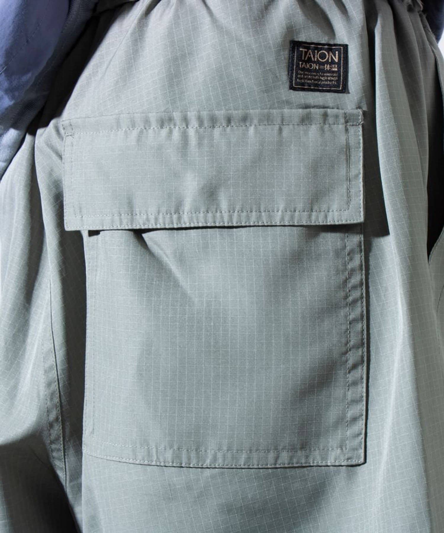 ダウン用のミリタリーライン生地を使用することで軽量で防汚性も担保した、ミリタリーリバーシブルショーツです。(ダウンは入りません)