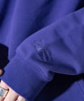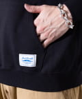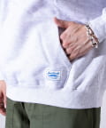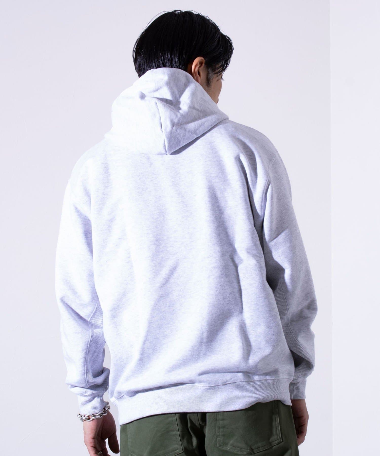カンガルーポケット部分にブランドロゴのアクセント、袖部分にさりげないロゴ刺繍もあり。