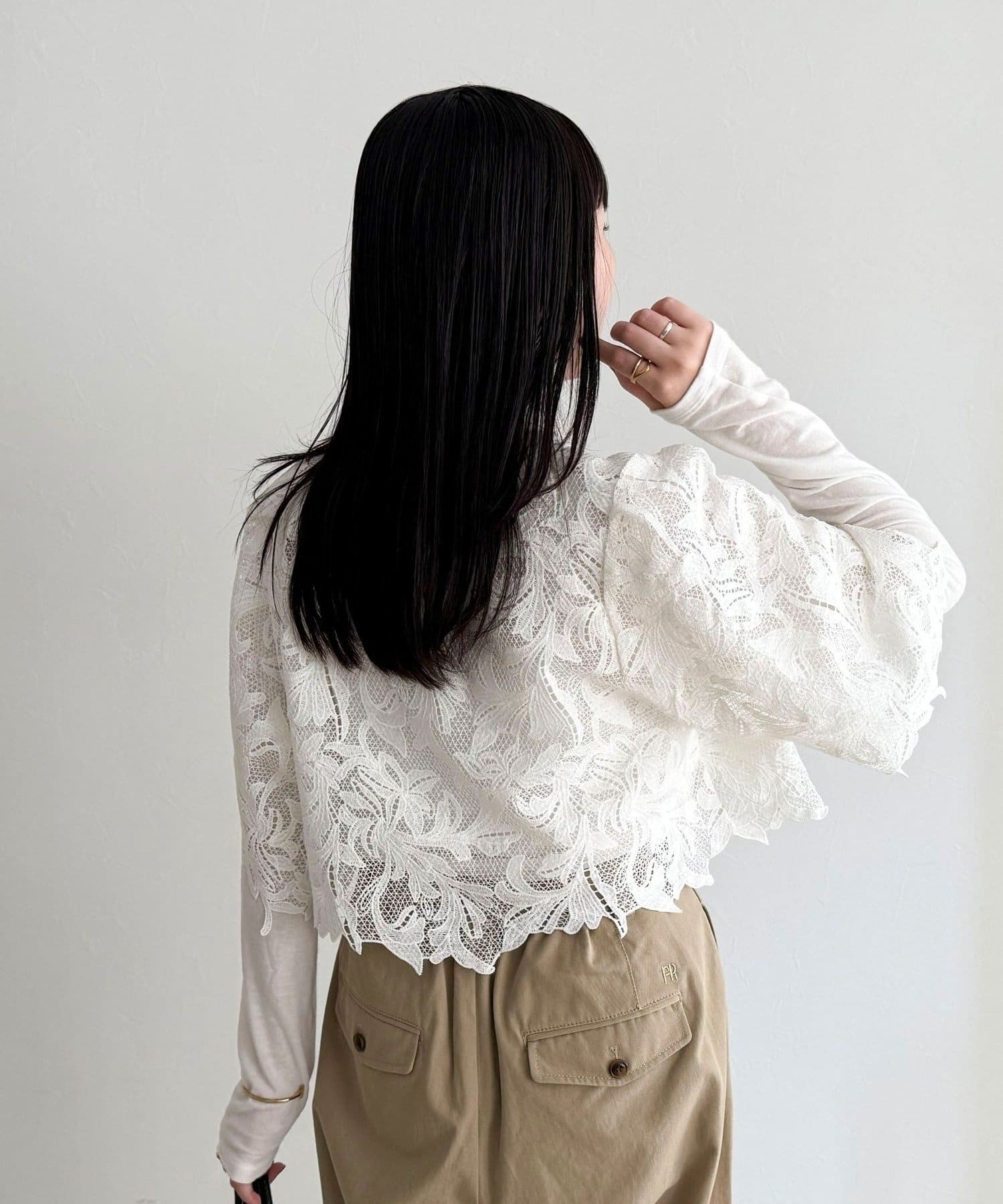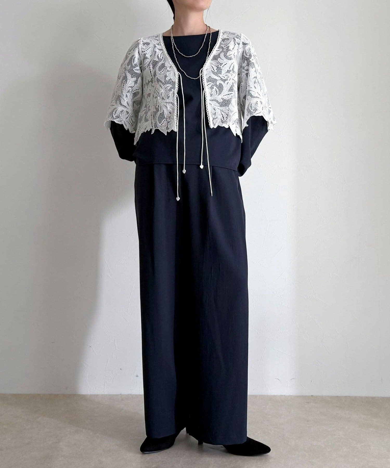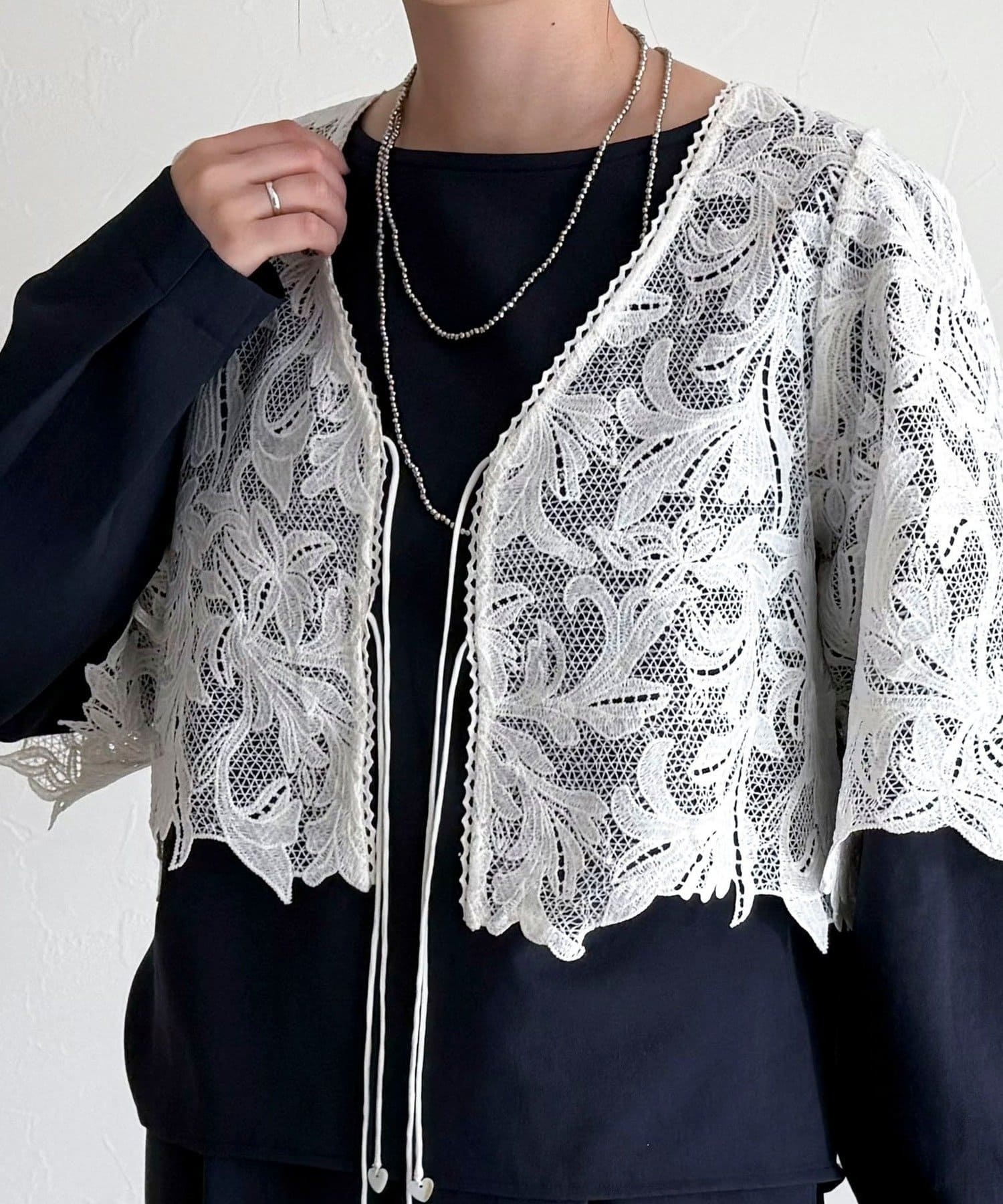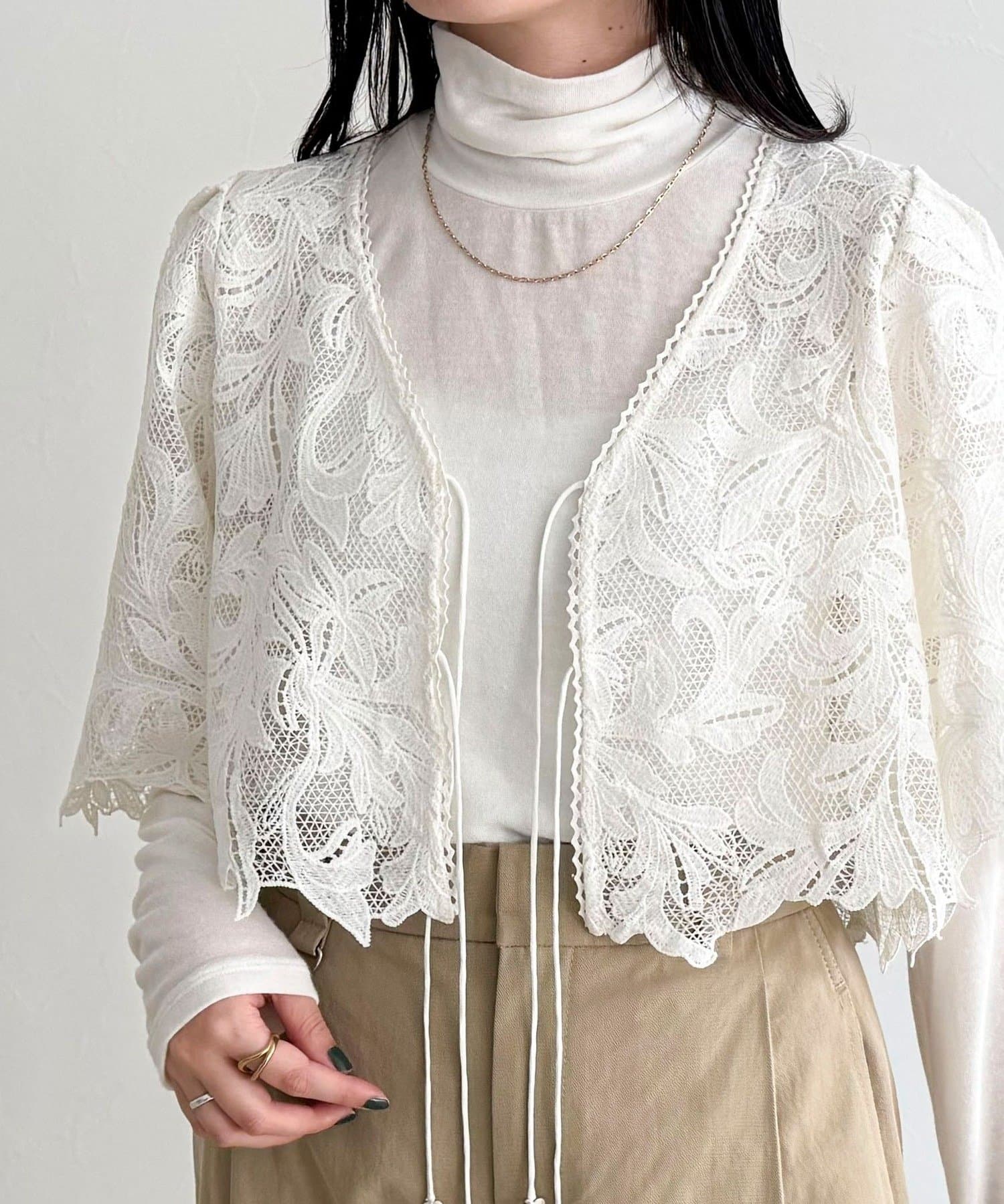 ・いつものスタイリングにプラスするだけで、ぐっと垢抜けた印象に仕上がるレースボレロ