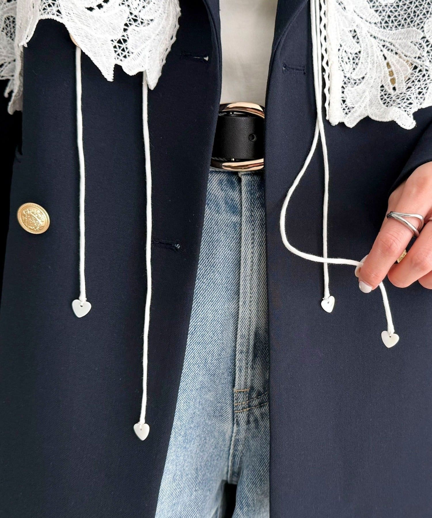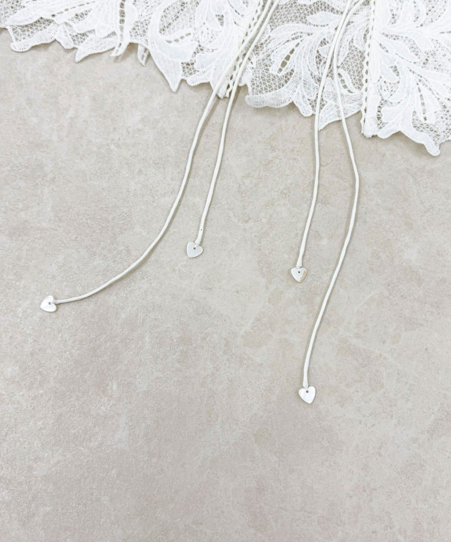 ・紐の先端にはハート型の釦をあしらい、さりげない可愛さをプラス