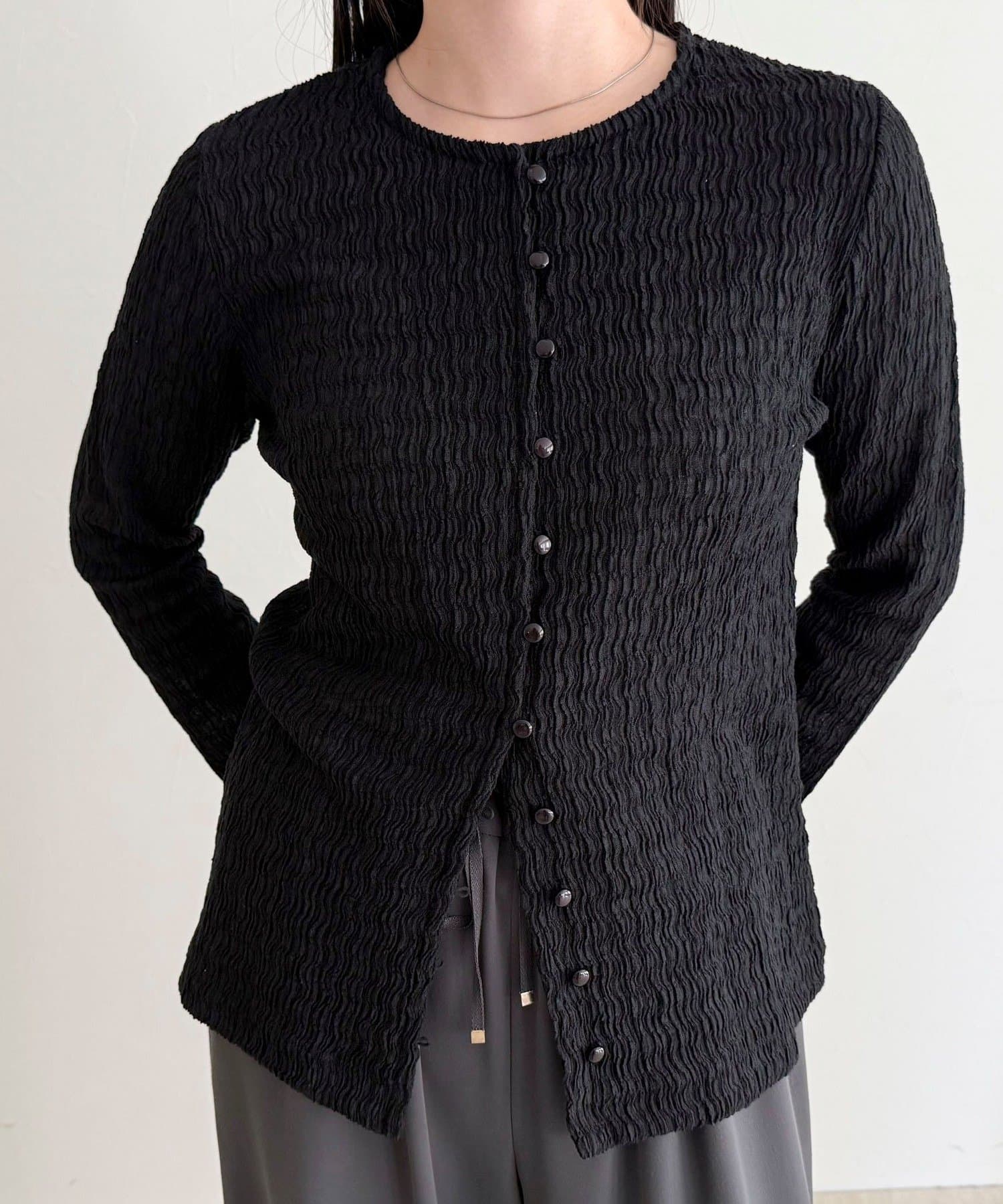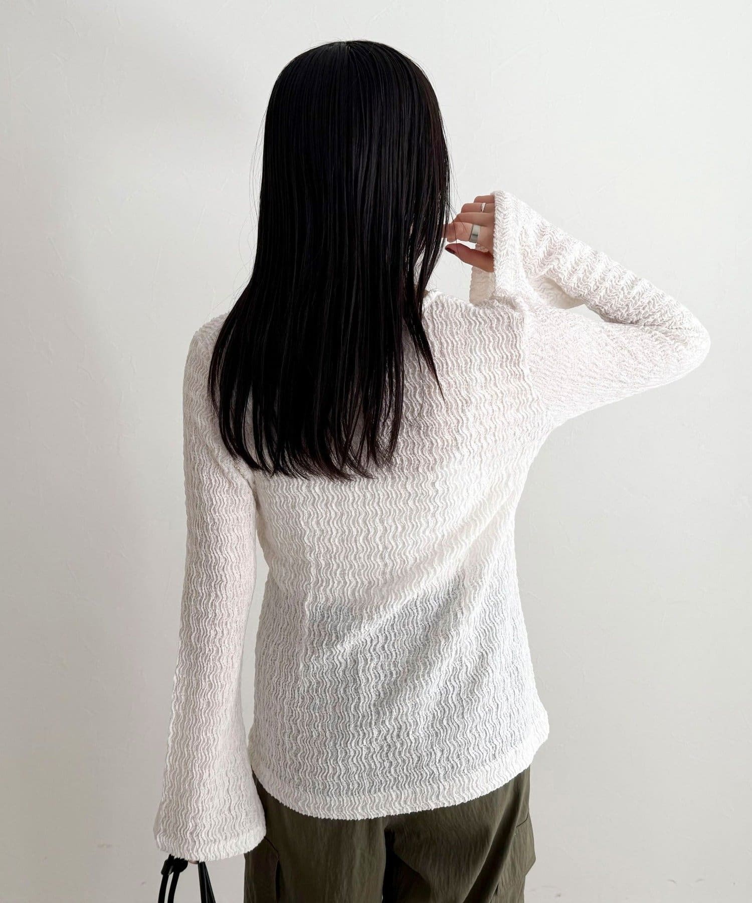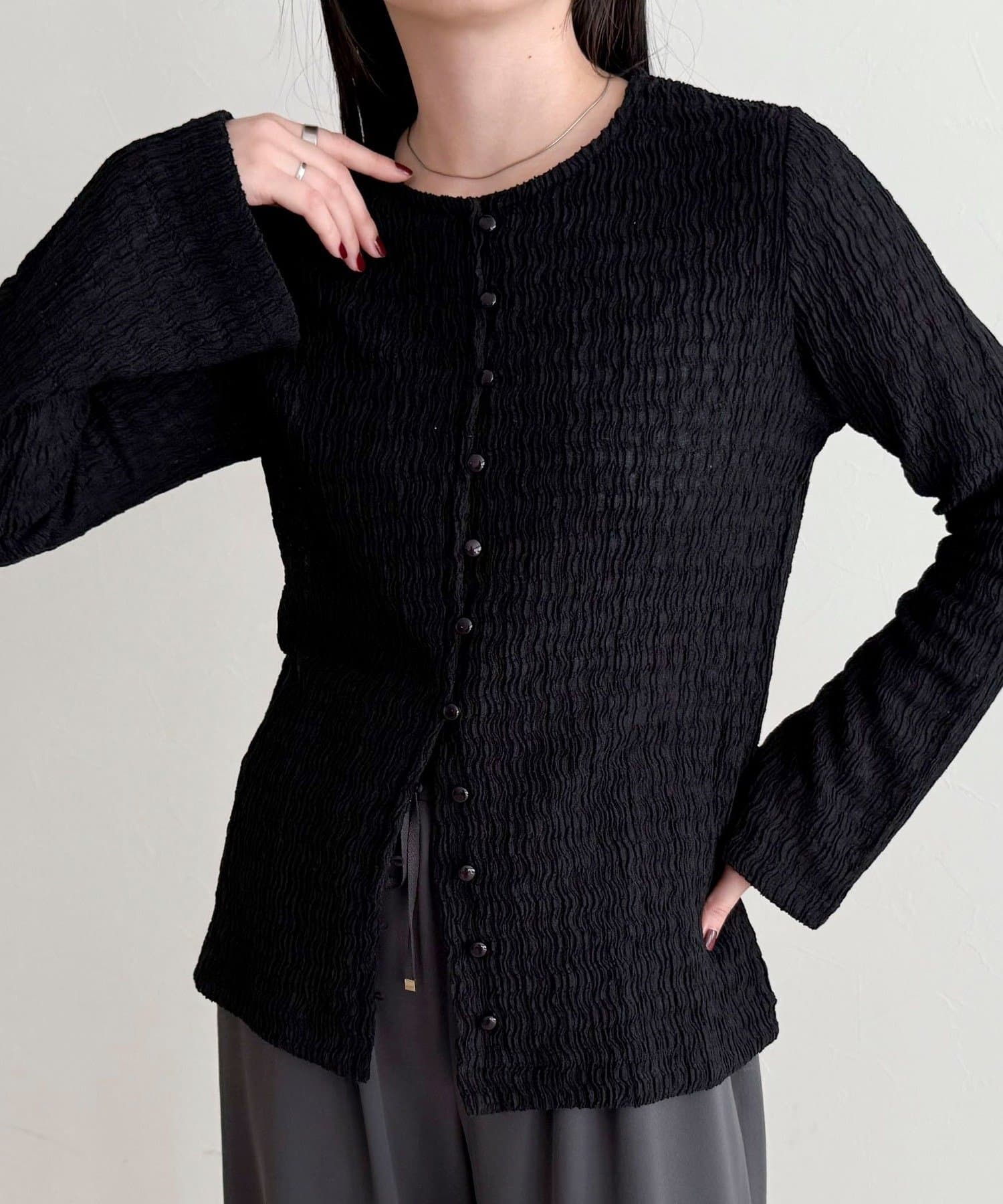 ・表面感のある素材を使用した、1枚で着映えするカットブラウス