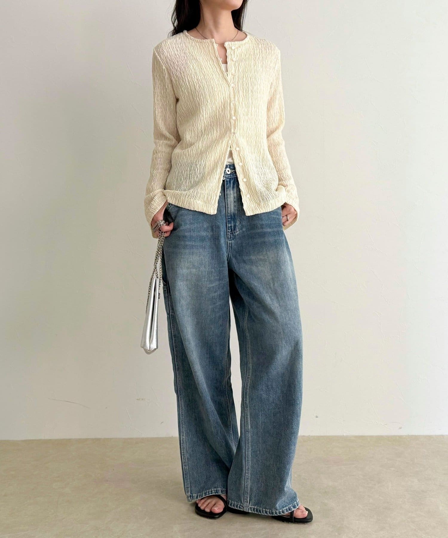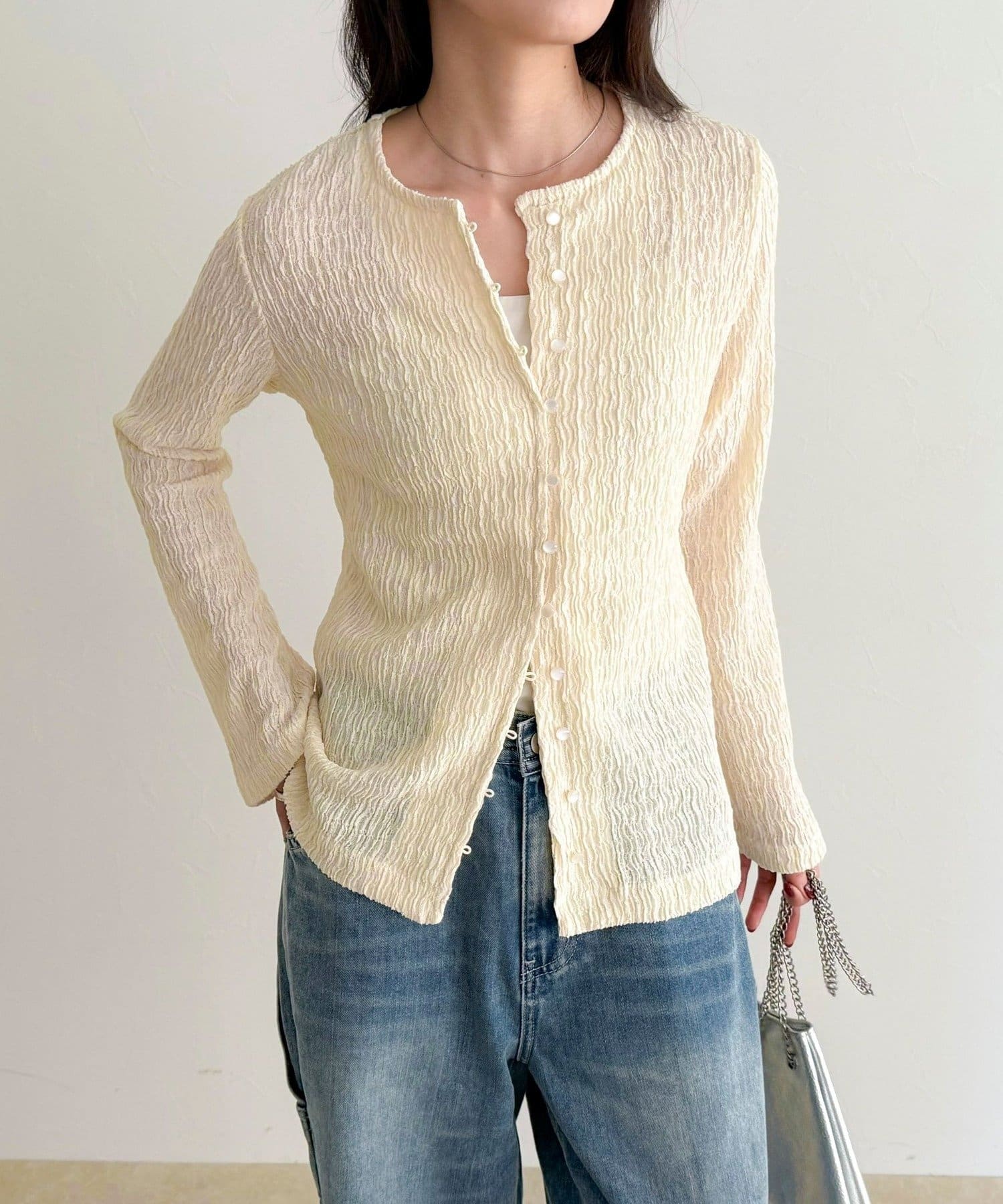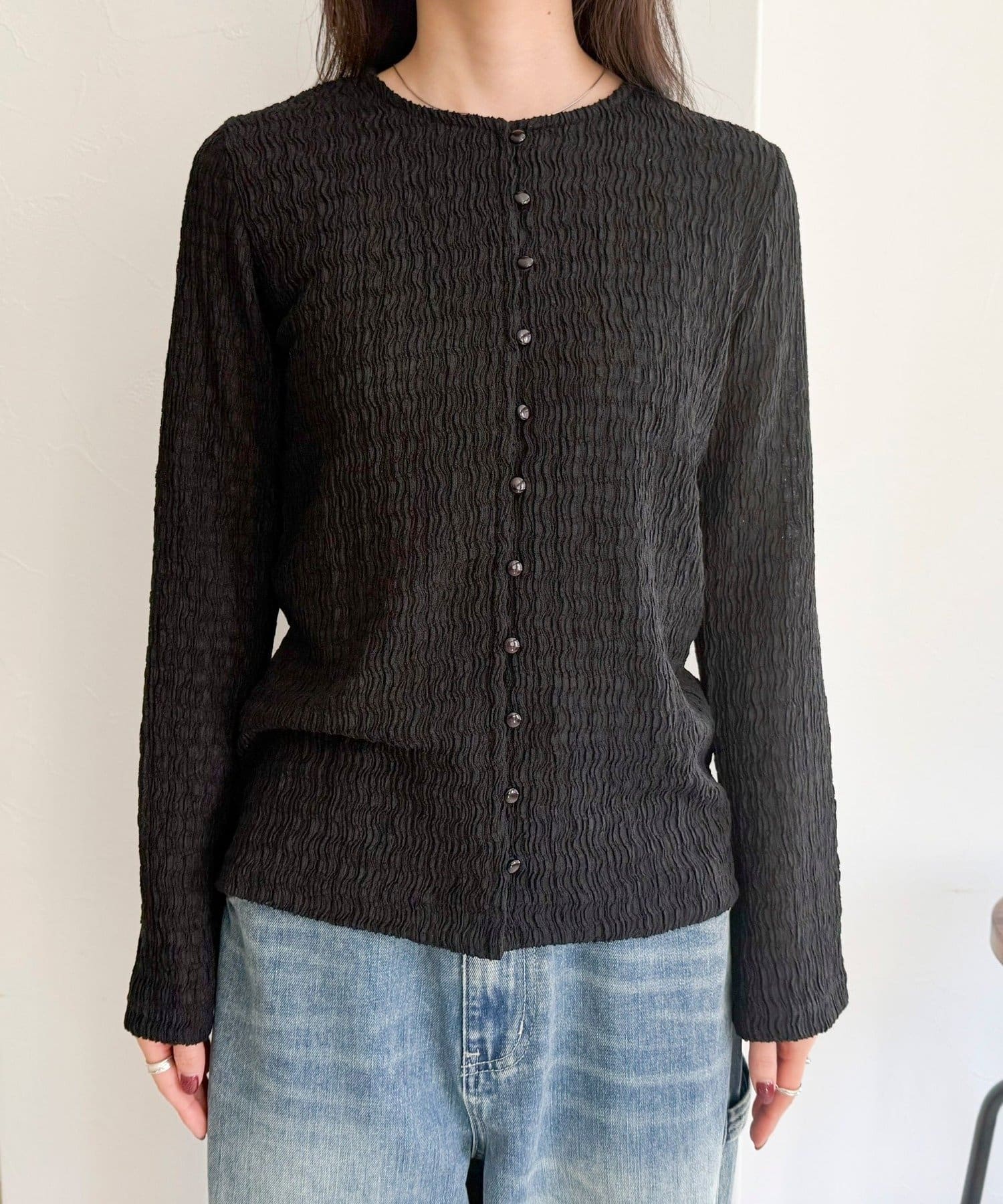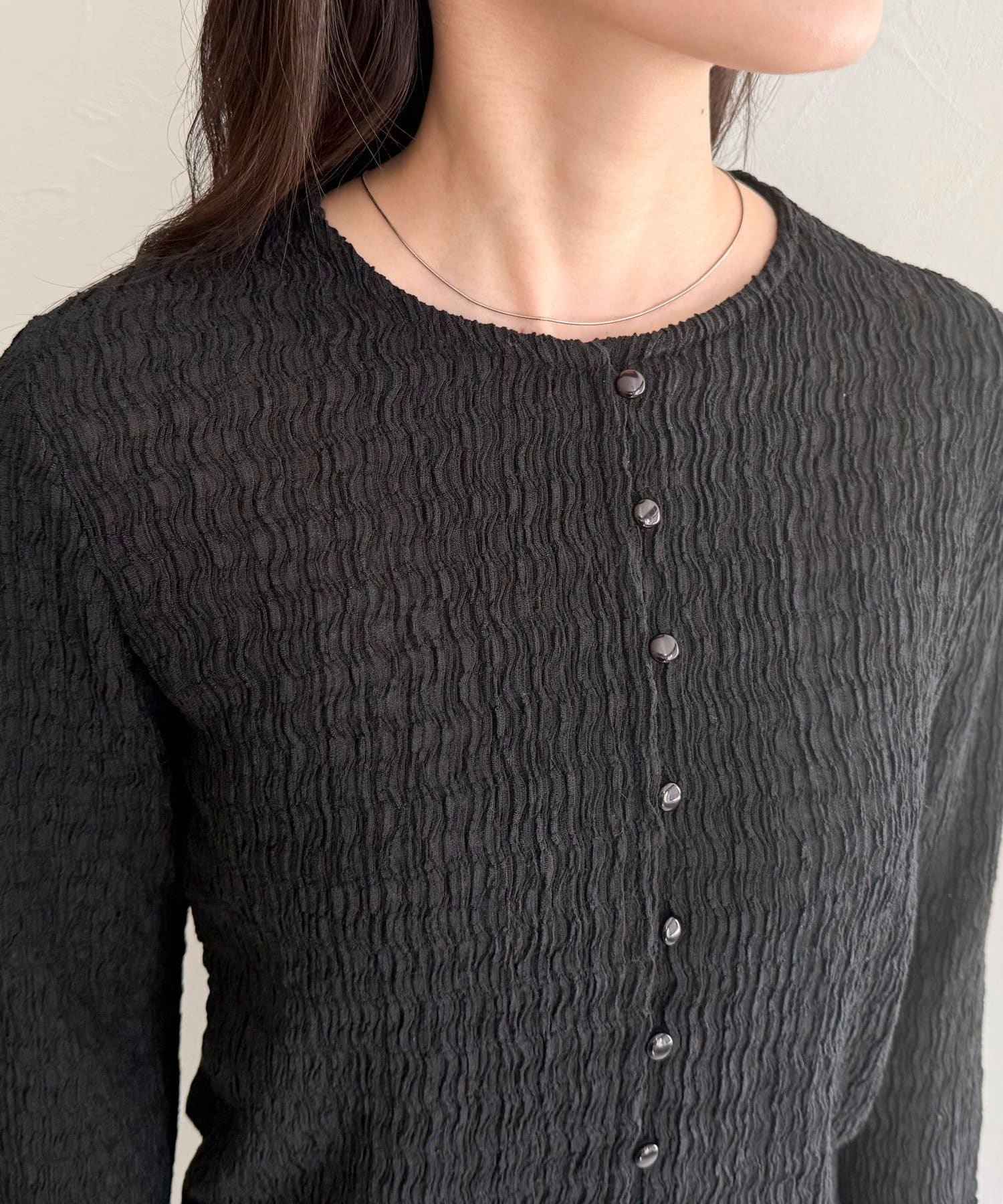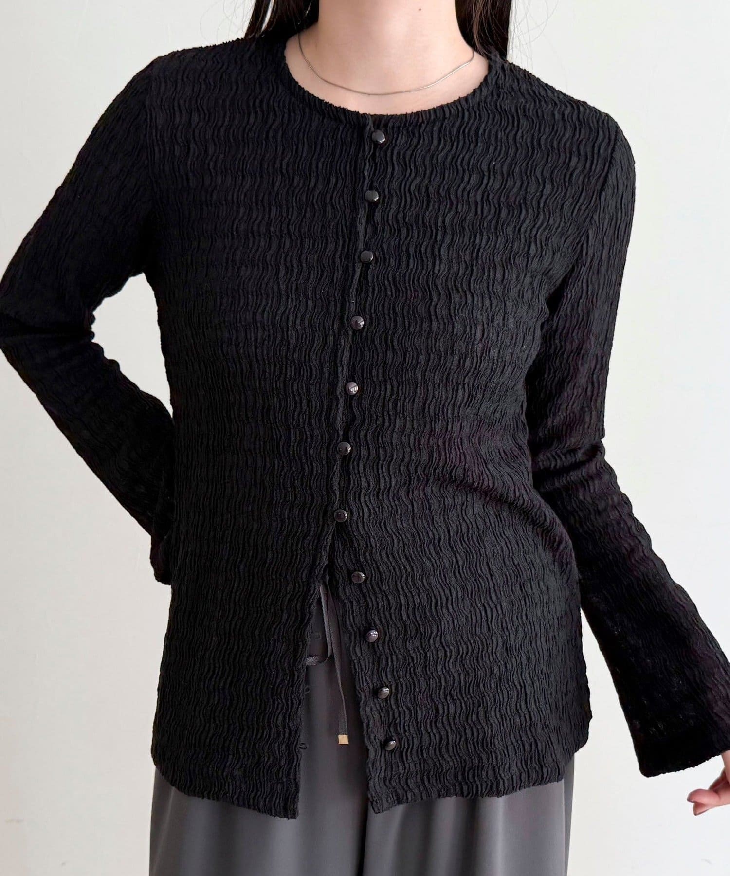 シャーリングの表面感で、一枚でもしっかり映えます。