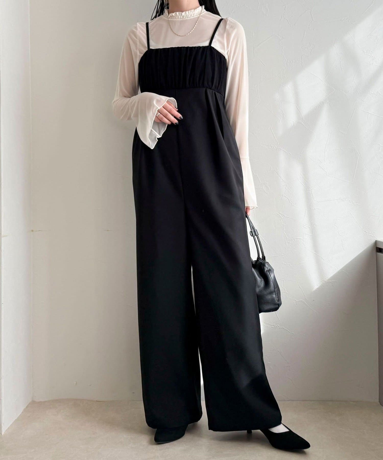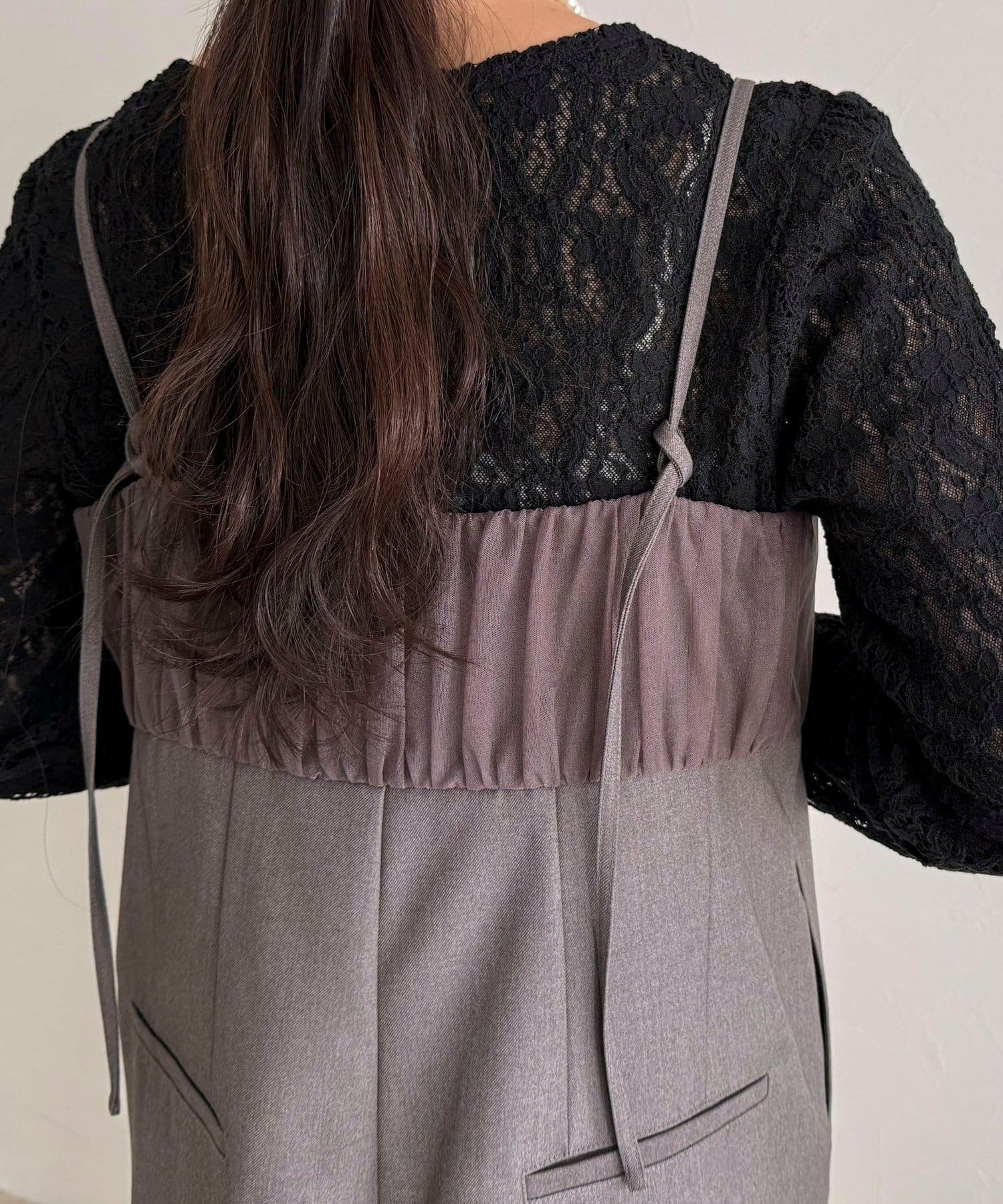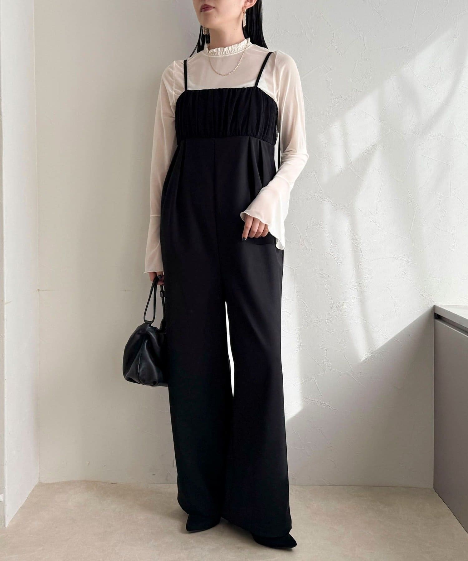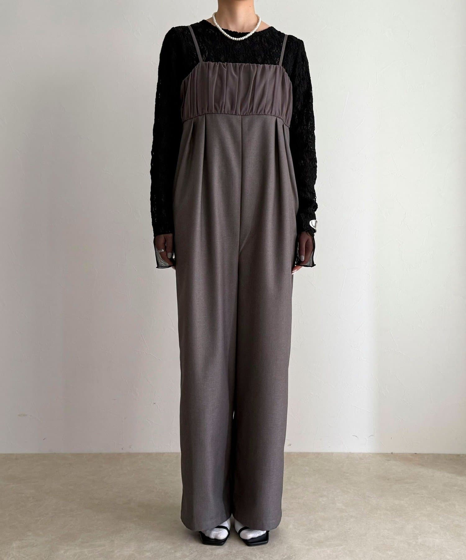・チュールを重ねた切替デザインがポイントのオールインワン