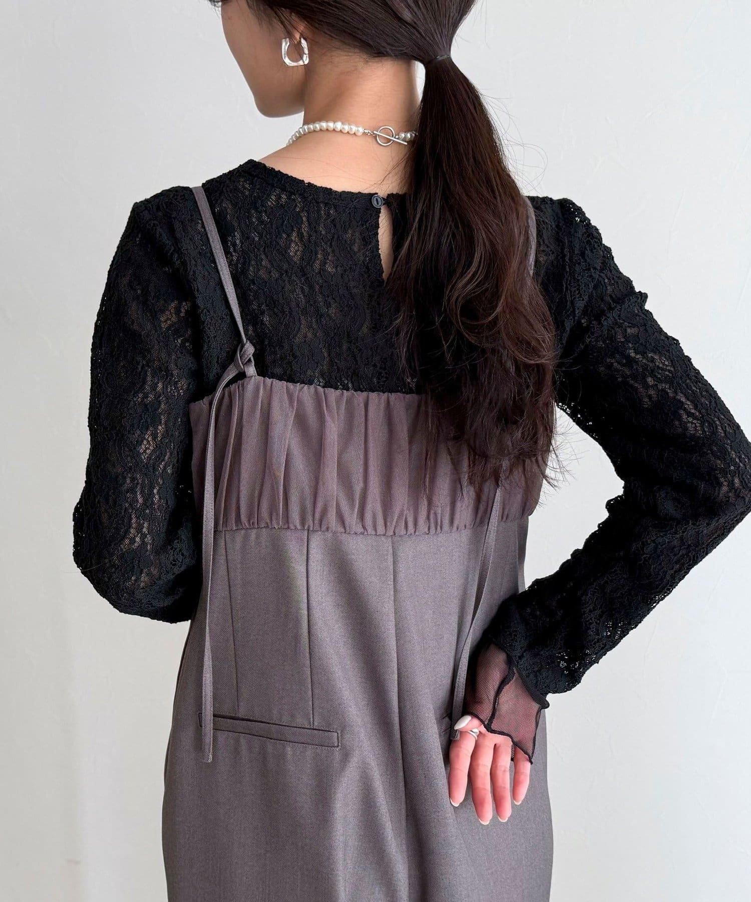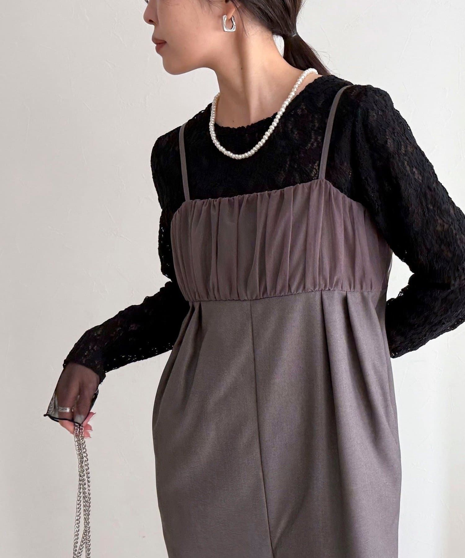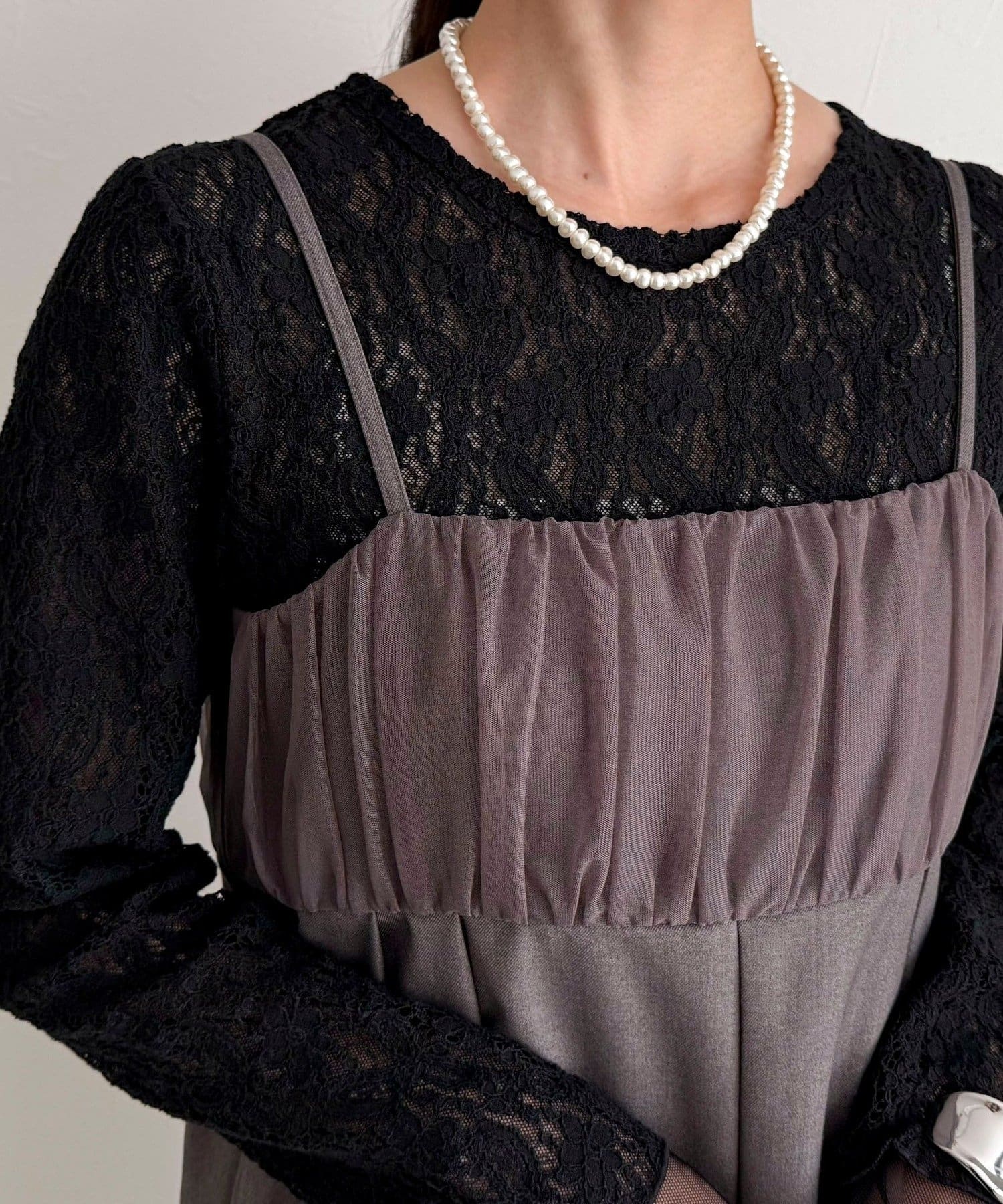・さらっと一枚でスタイルが決まり、胸元のチュールがさりげなく甘さをプラス