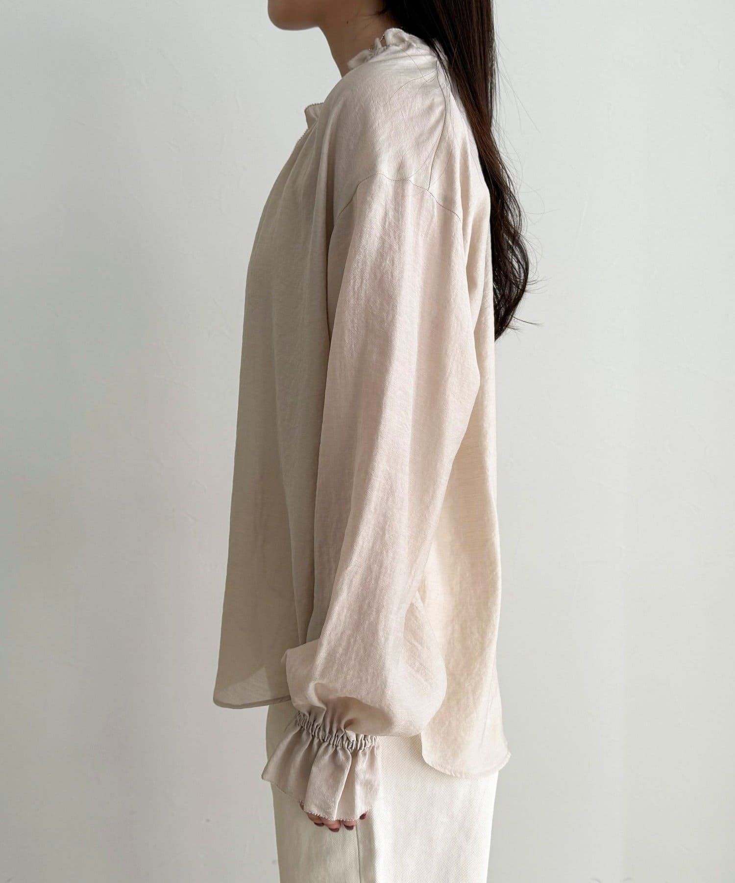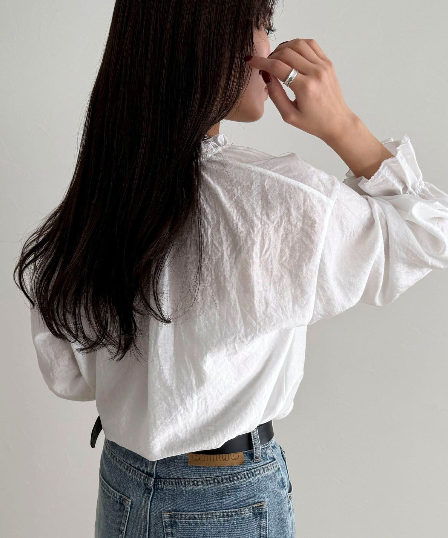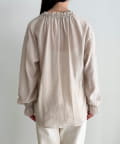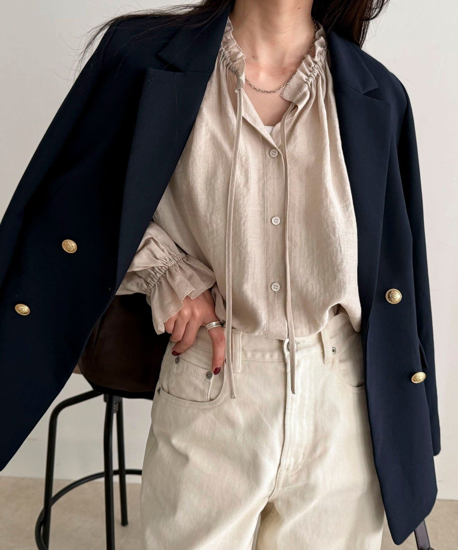 ・襟元や袖にギャザーをたっぷり施し、ふんわりとした立体感のあるシルエットに