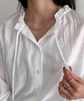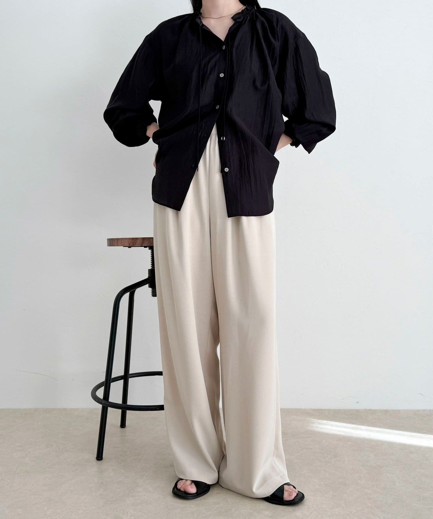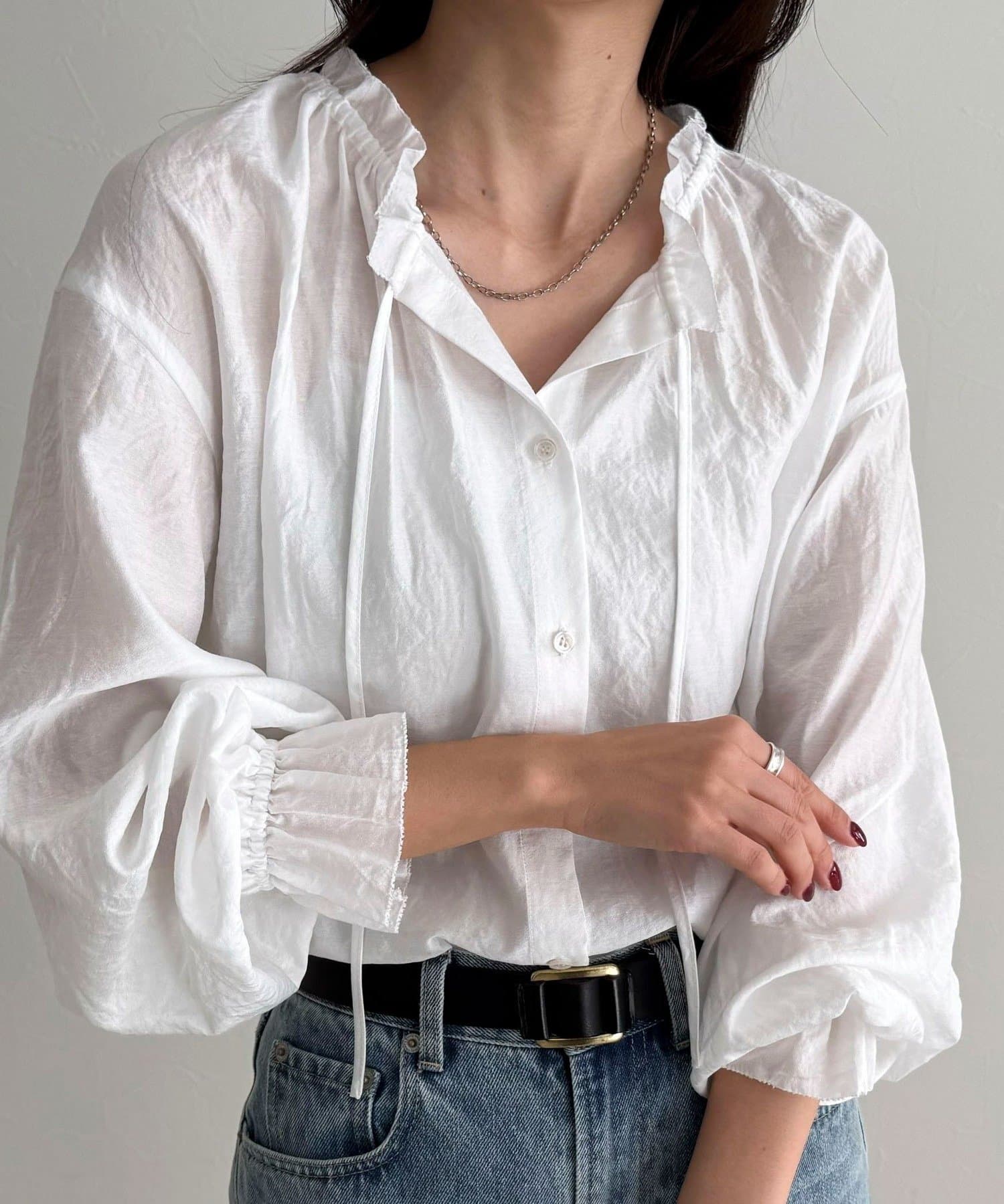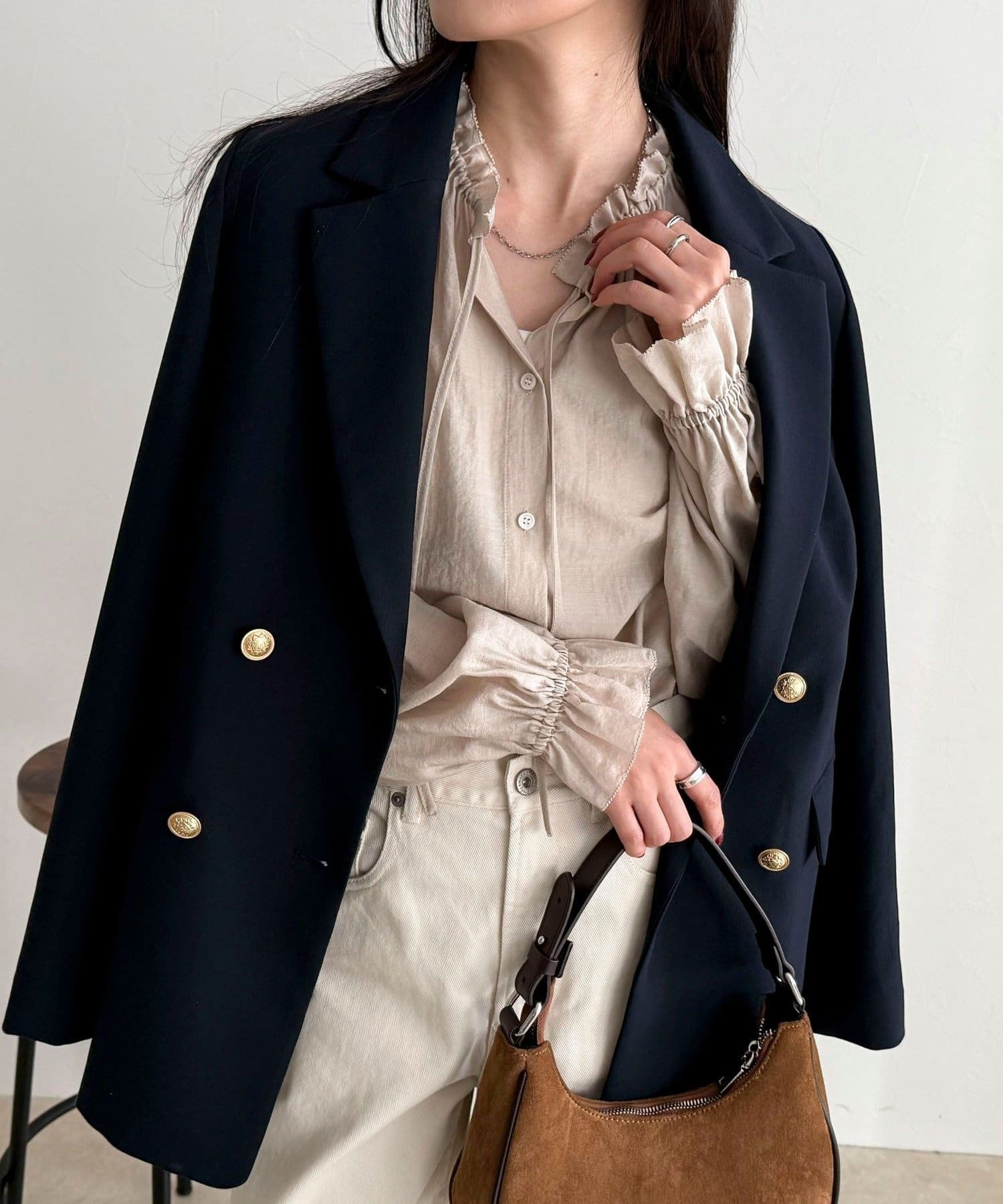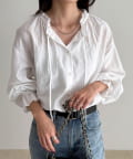 ・襟元や袖にギャザーをたっぷり施し、ふんわりとした立体感のあるシルエットに
