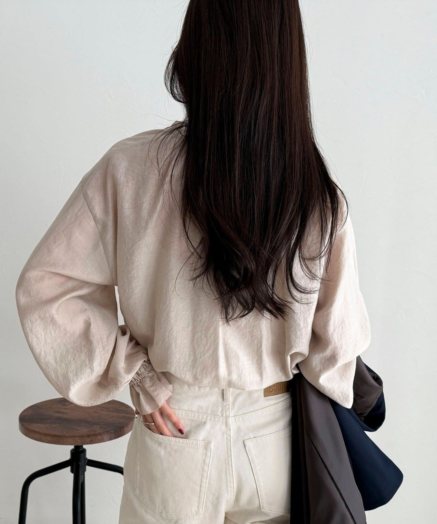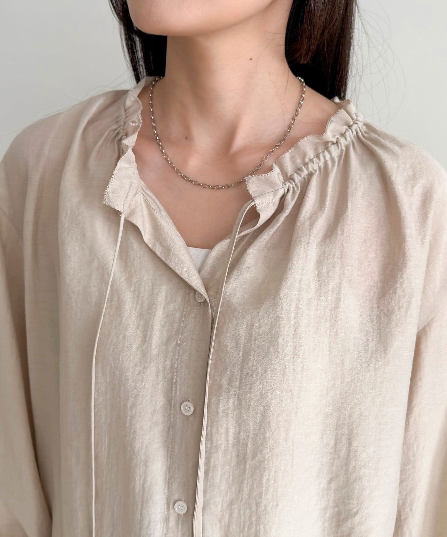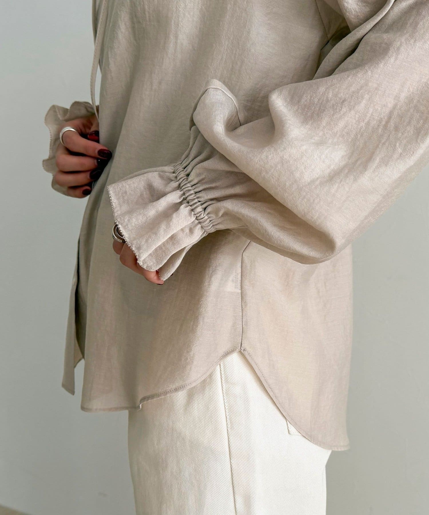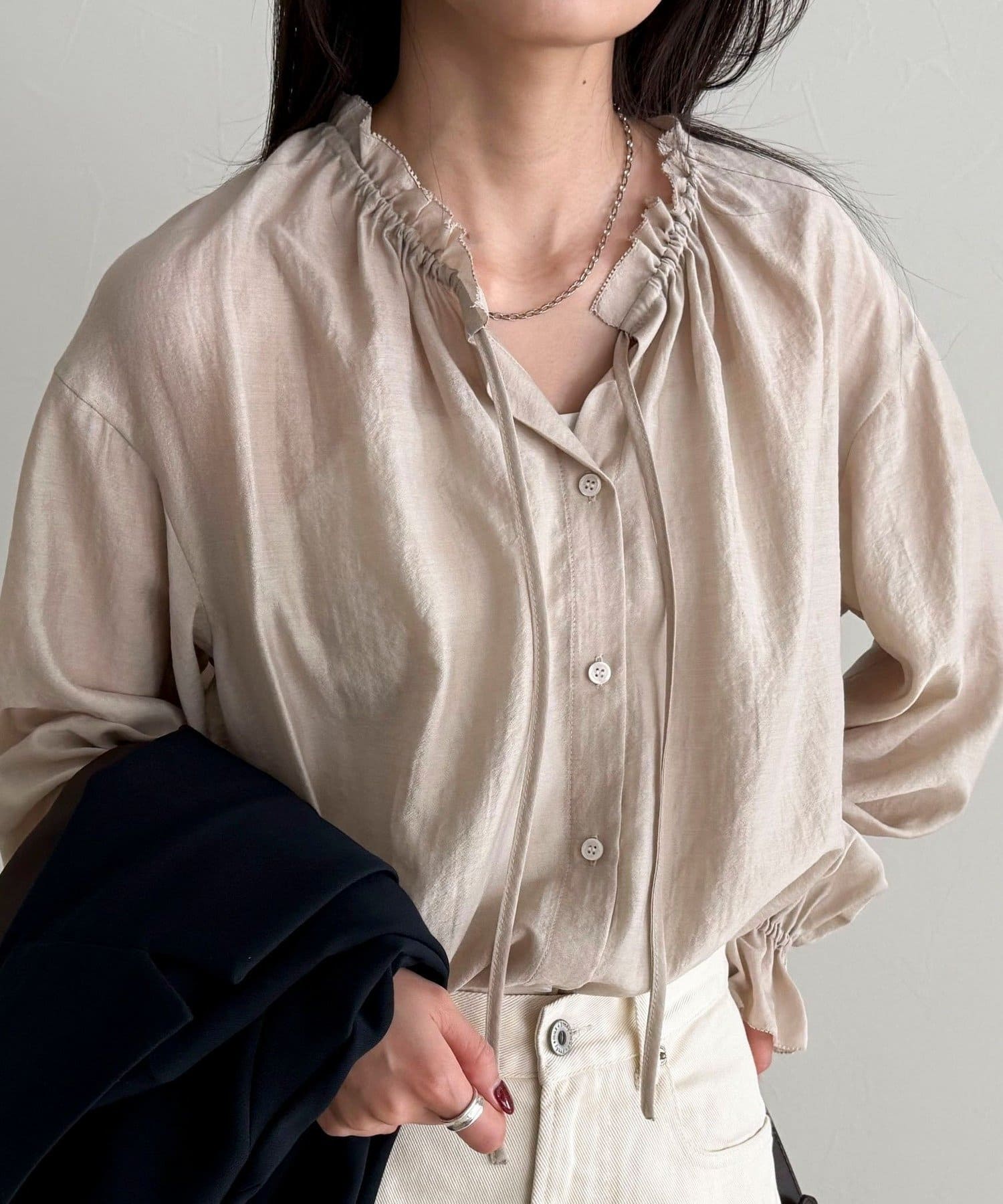 ・ほんのりとしたシャイニー感とシアー素材が軽やかで女性らしい印象を演出するブラウス