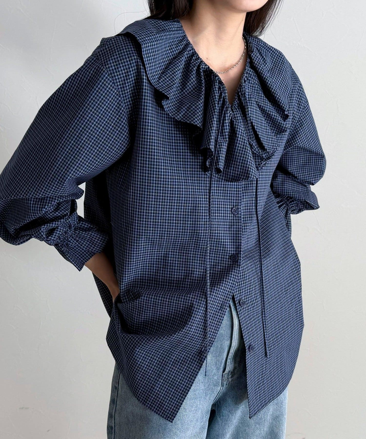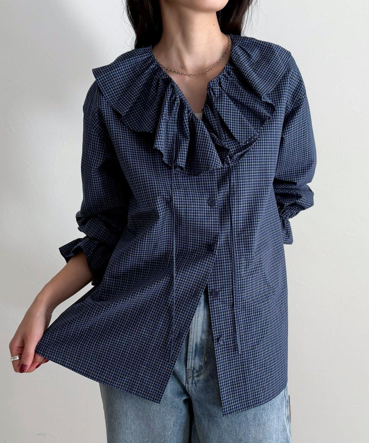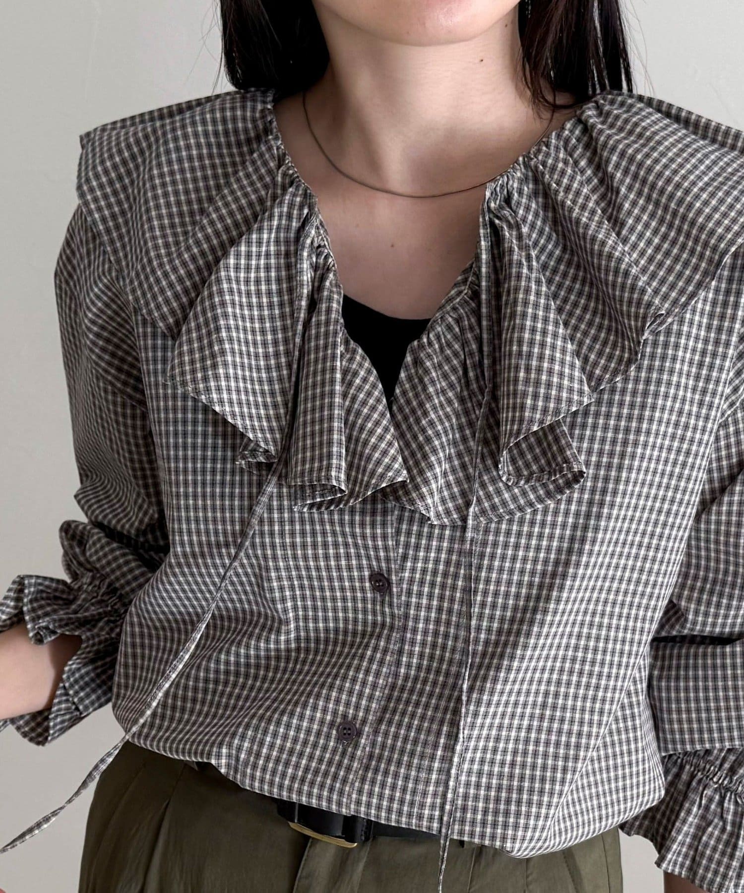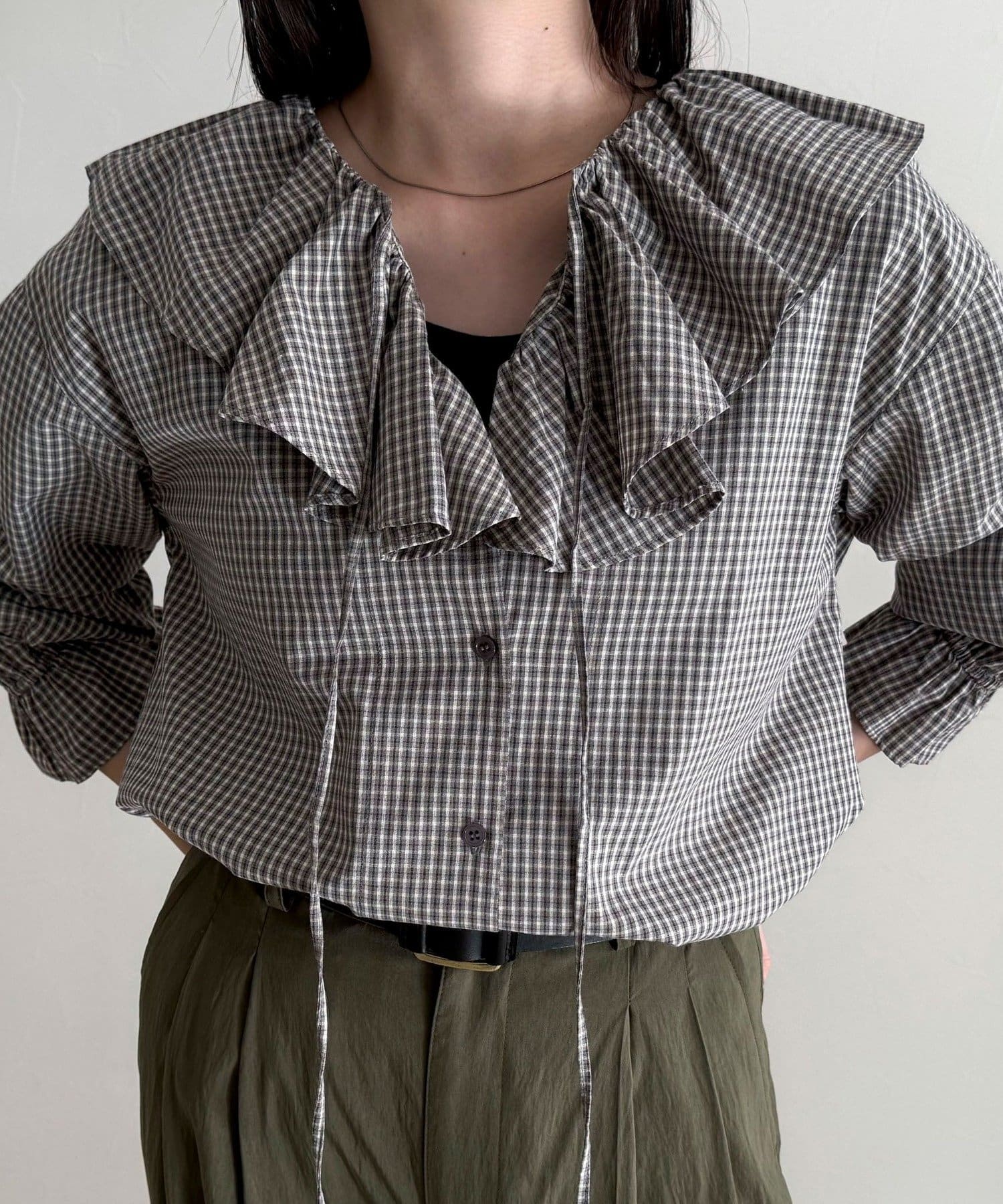 顔まわりを華やかに彩る、チェックフリルカラーブラウス