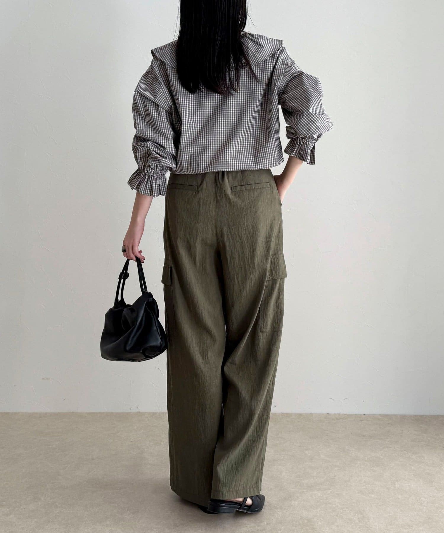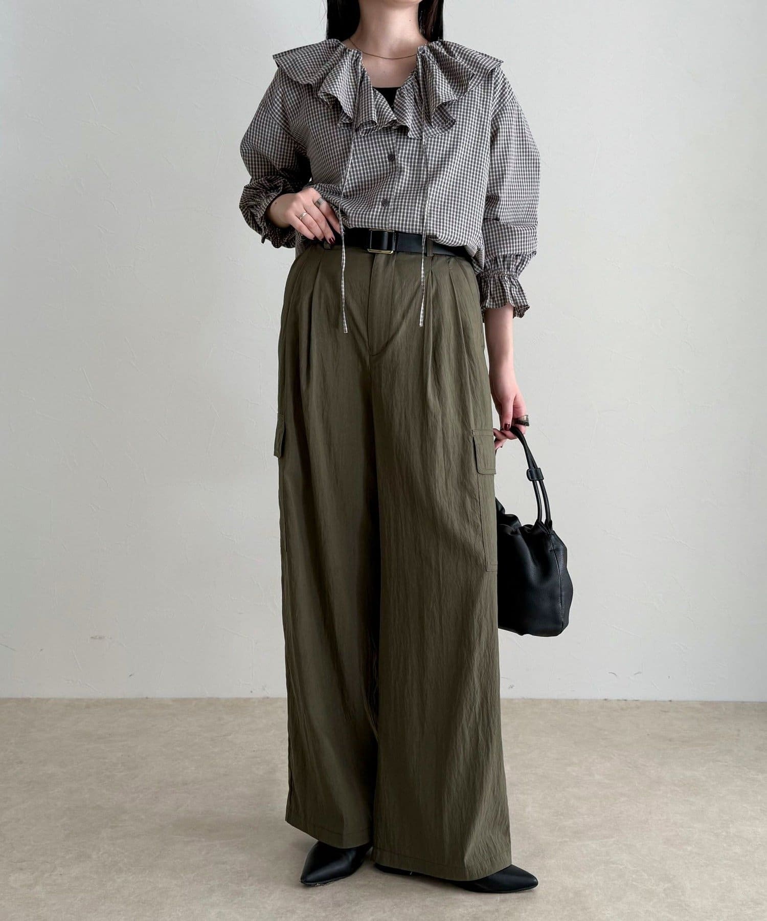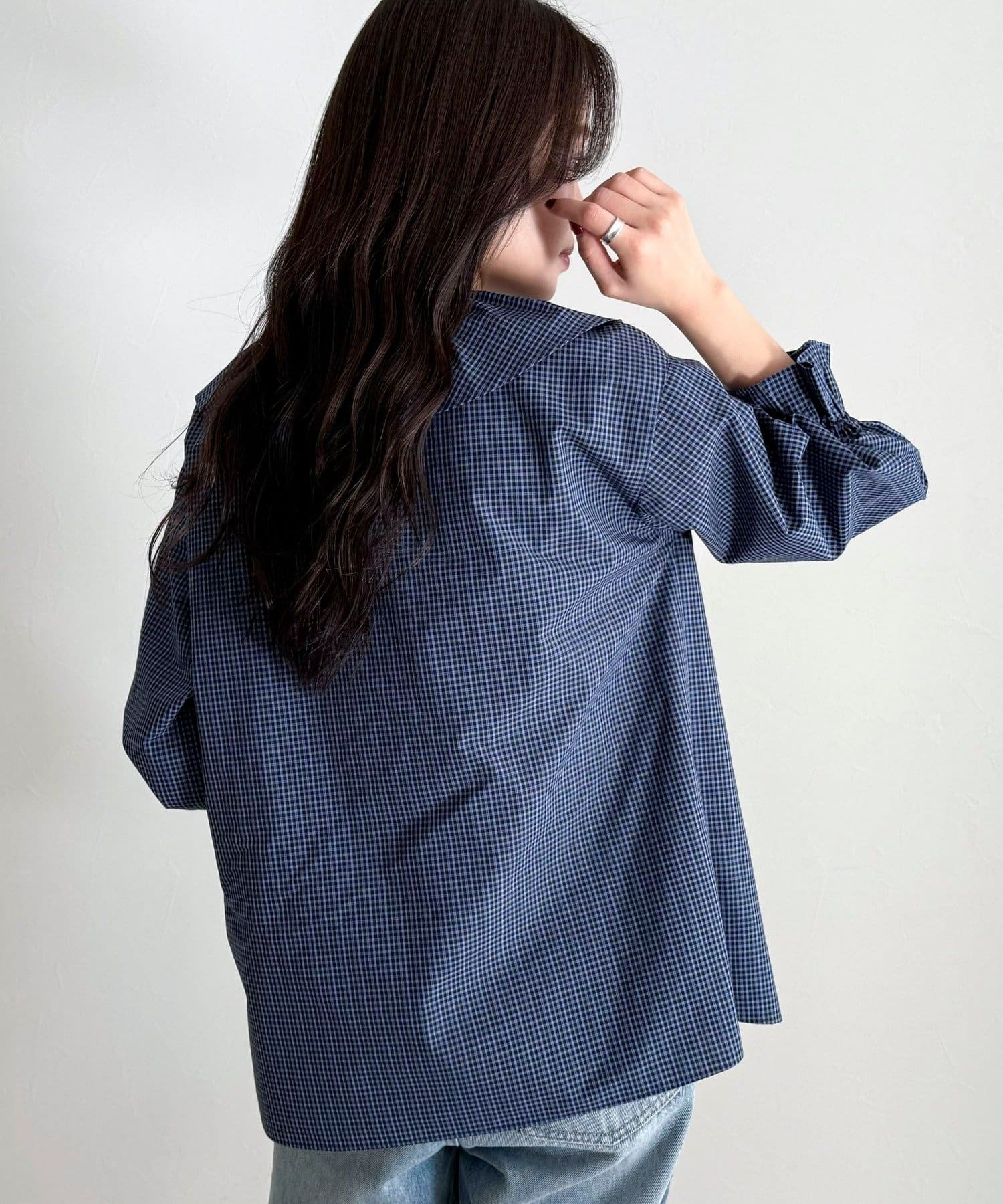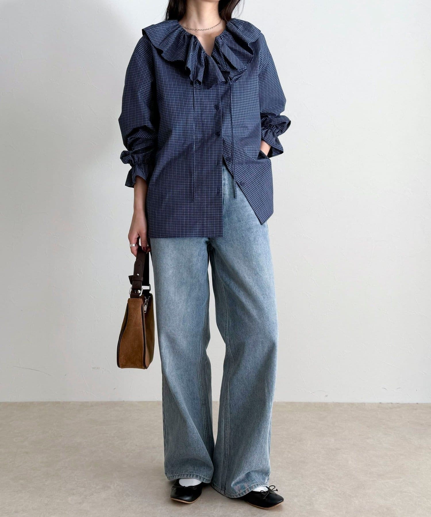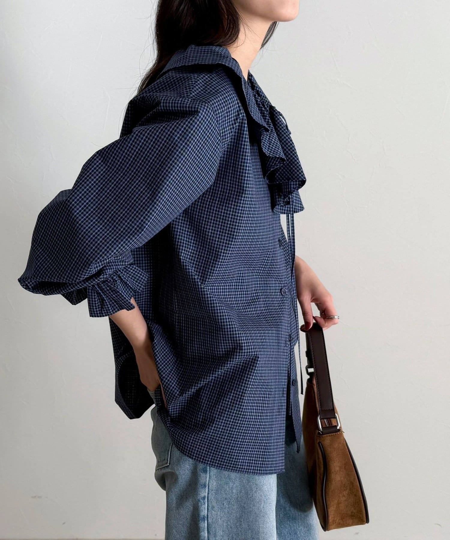 顔まわりを華やかに彩る、チェックフリルカラーブラウス
