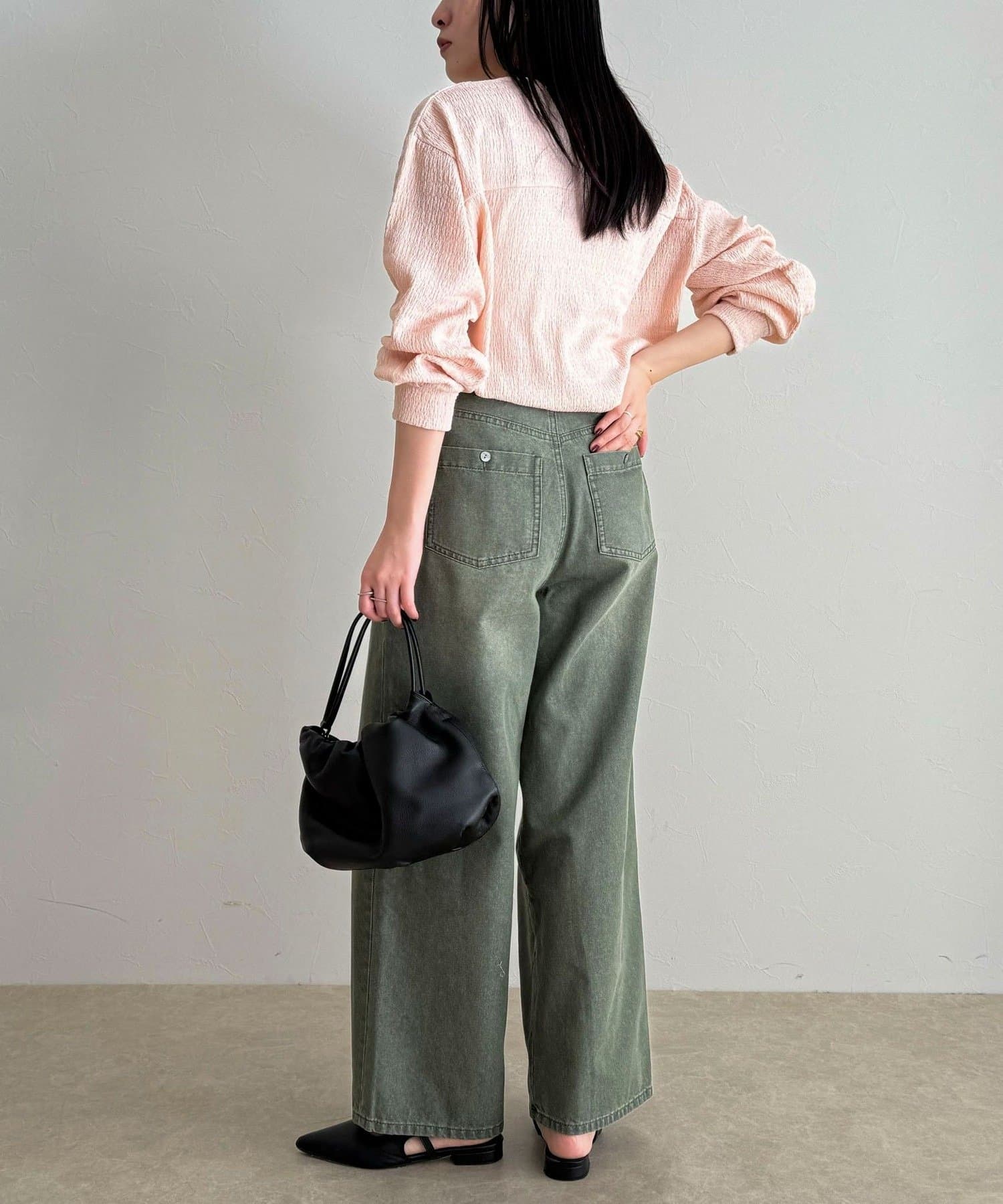 *この製品は、生地の特性上引っかかると糸が飛び出しやすい傾向があります。着用時にはベルトやバック、周囲の壁など表面の粗いものとの摩擦や引っかかりにご注意ください。