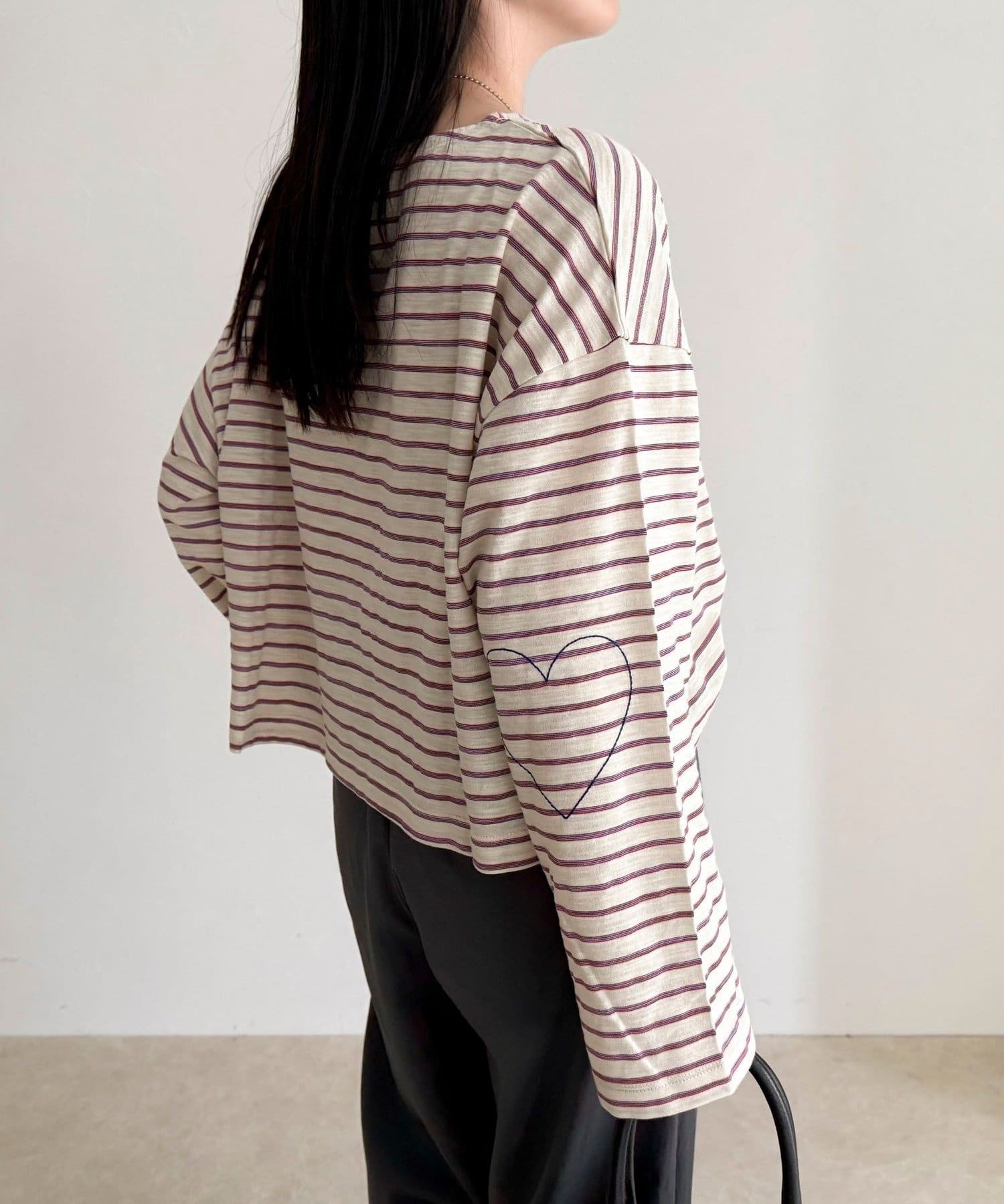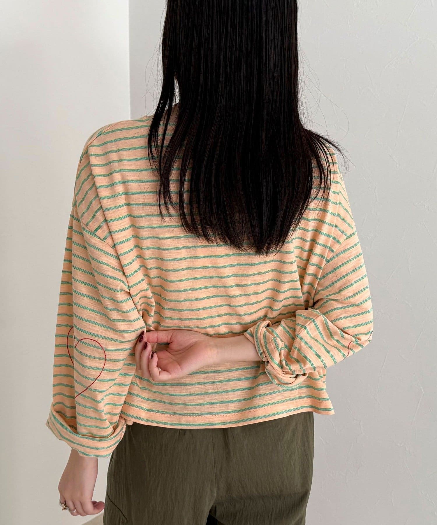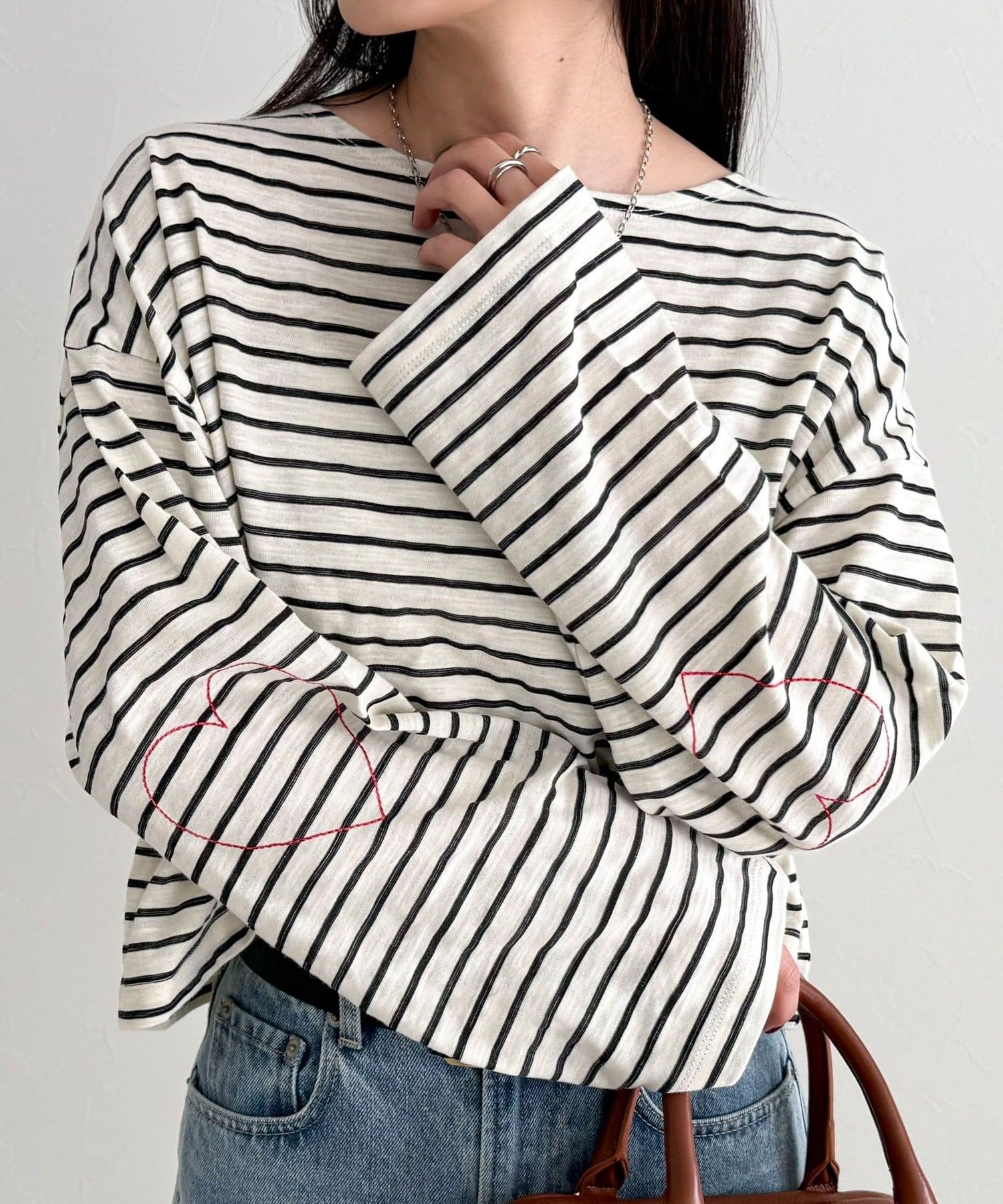 【人気商品の新型】ボーダーハートステッチルーズロンTシャツ
