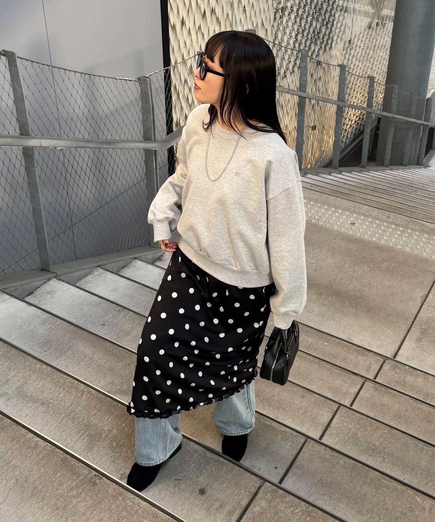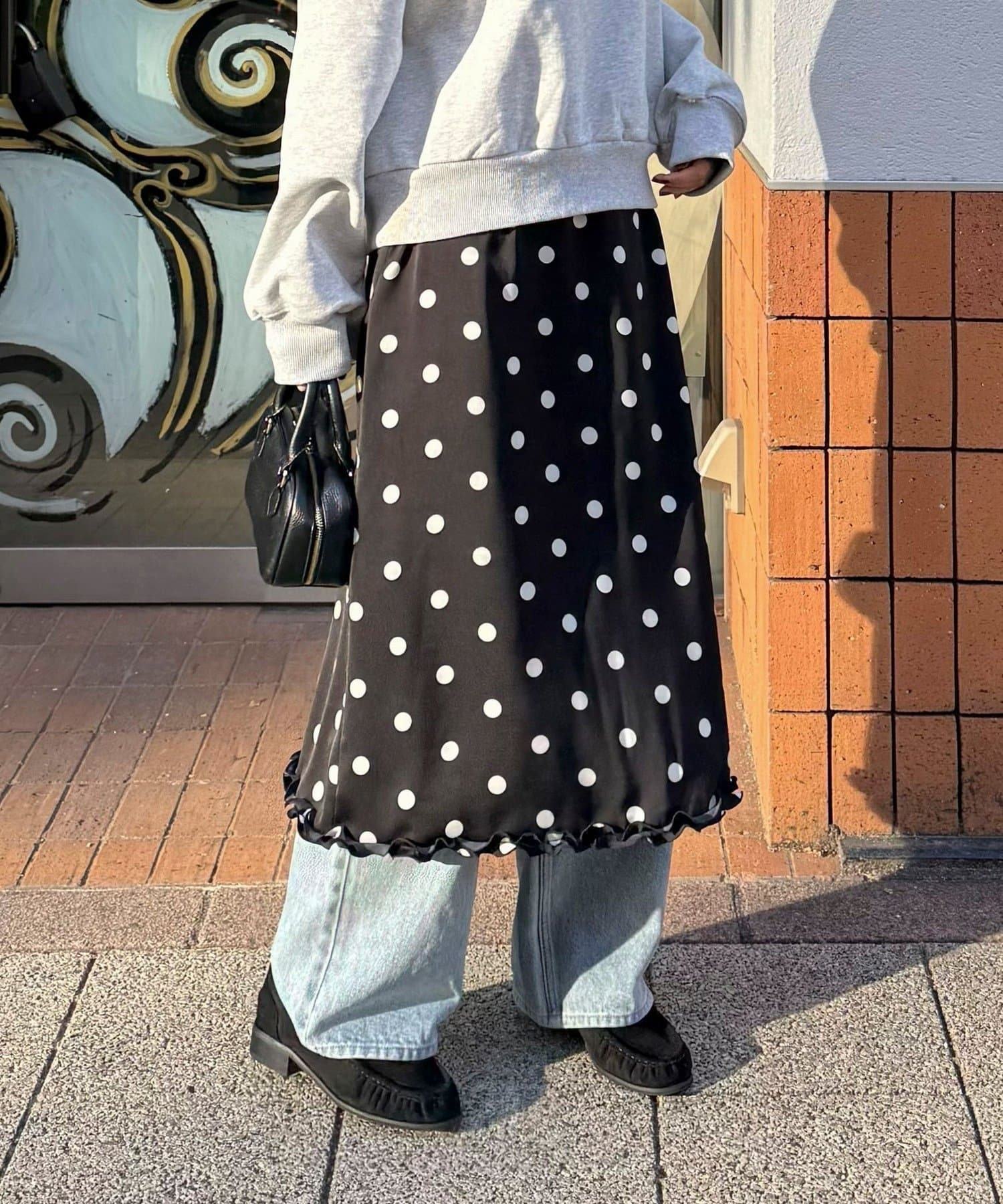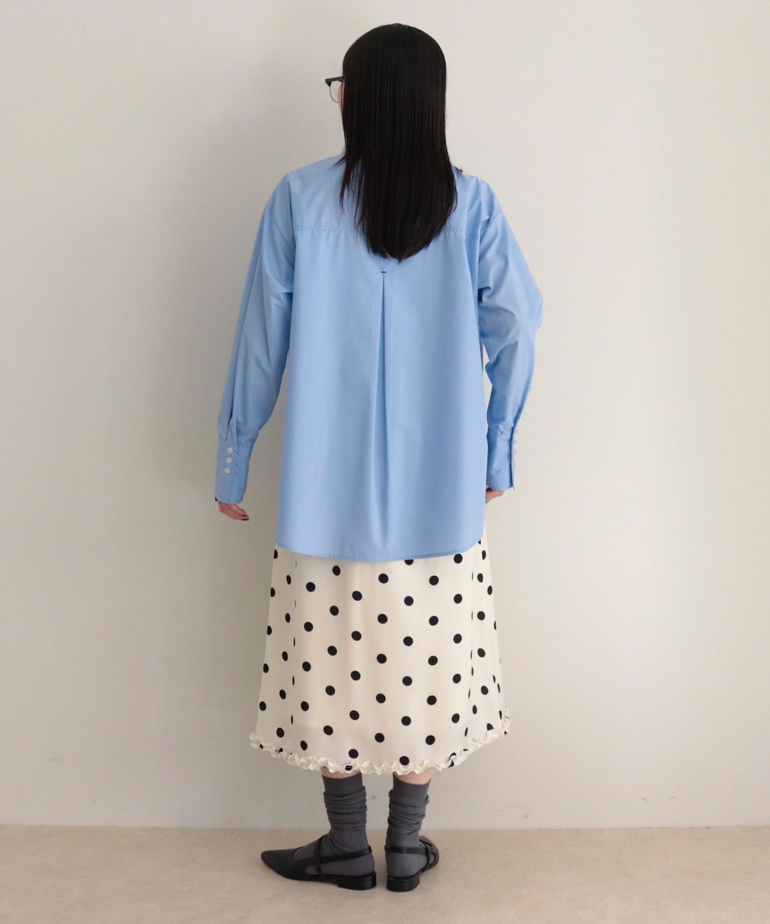 ・サテン素材にドット柄をあしらったミディ丈スカート
