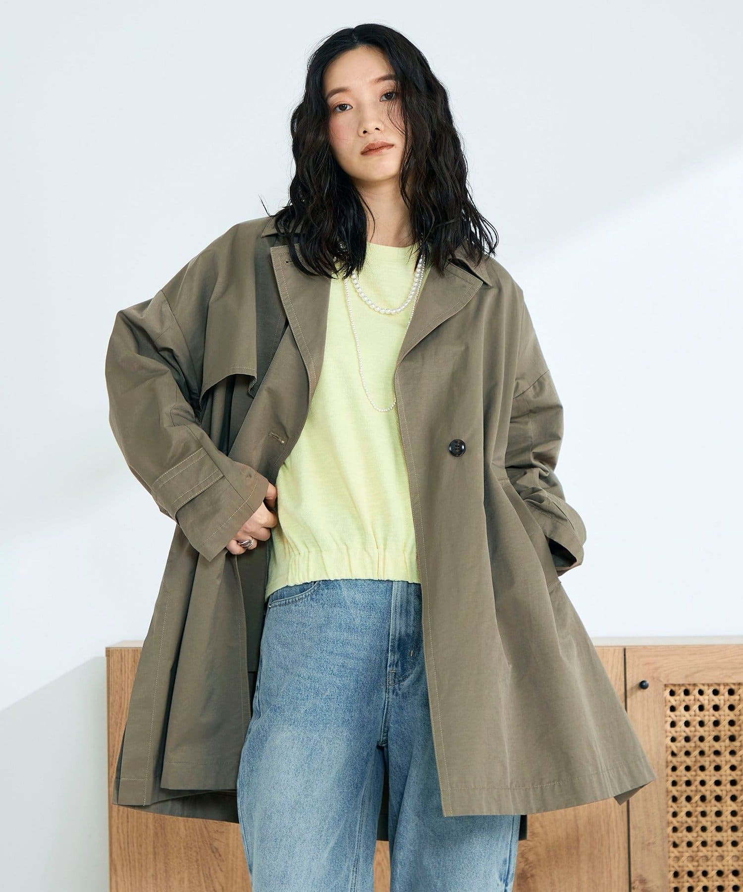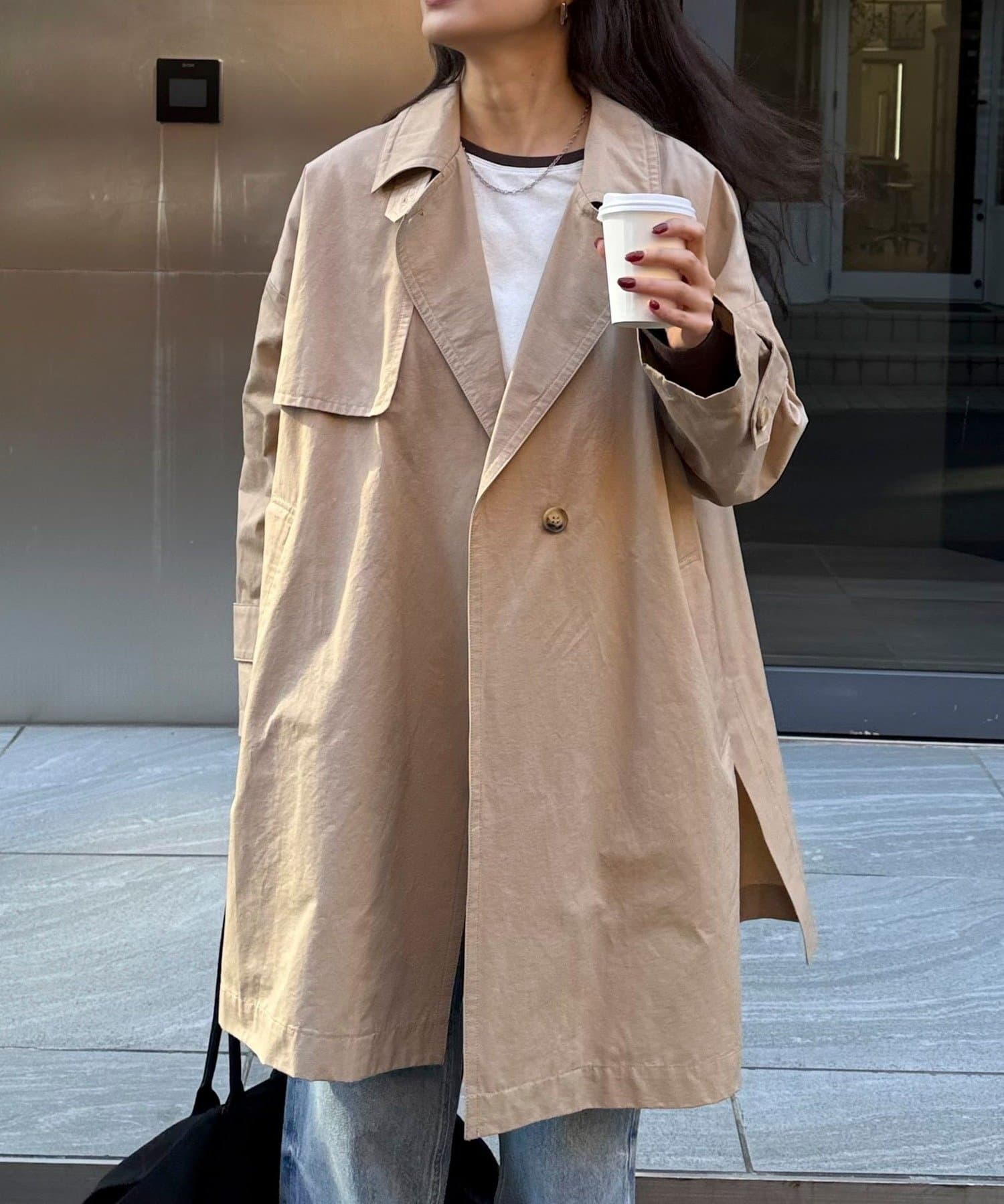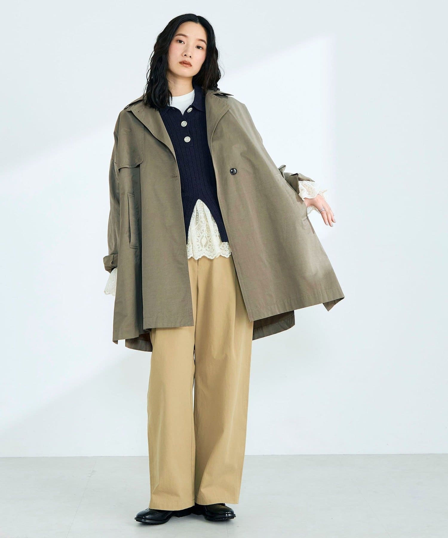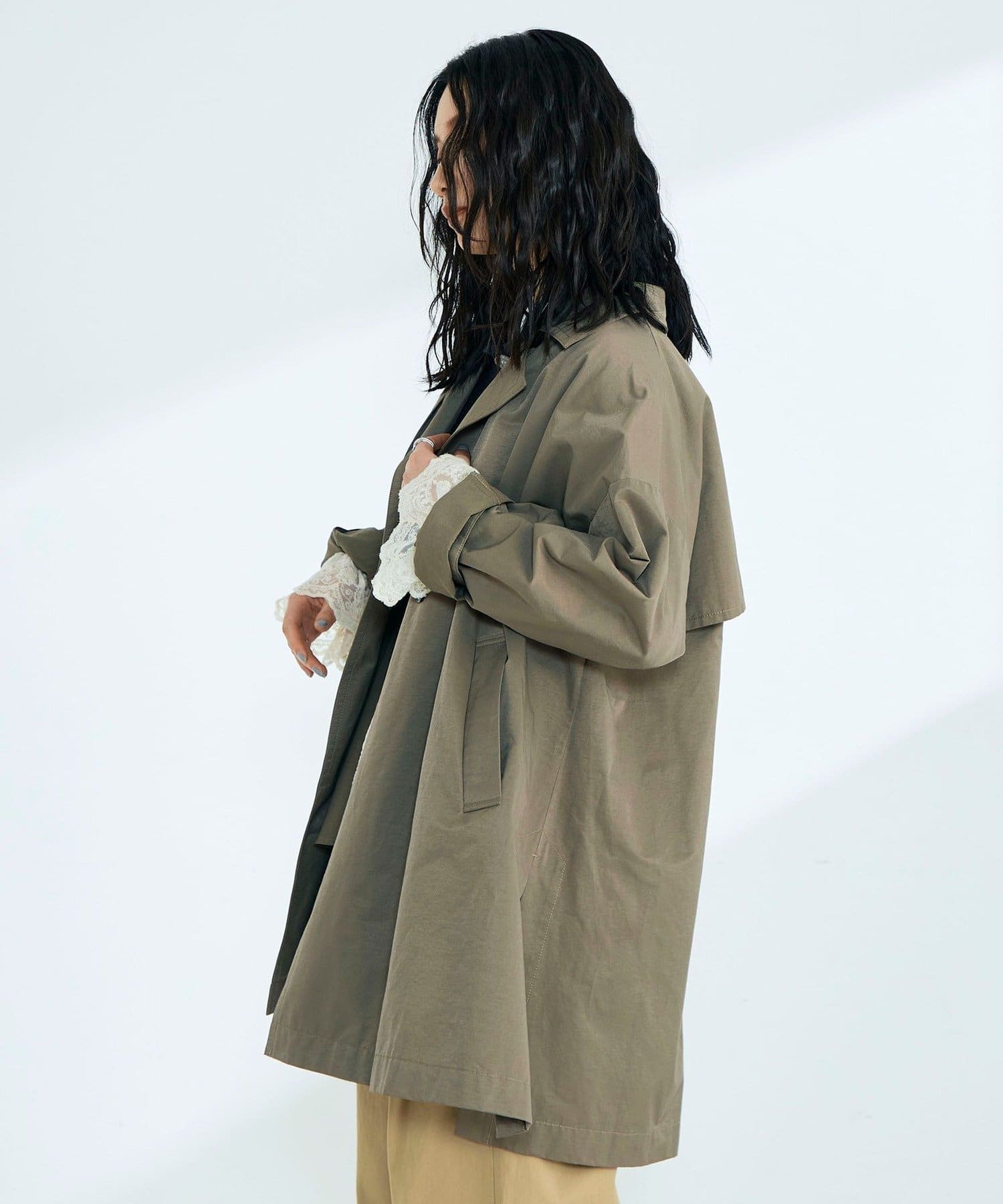 ・程よくゆとりのあるオーバーシルエットが今っぽいバランスを叶えるミドル丈トレンチコート