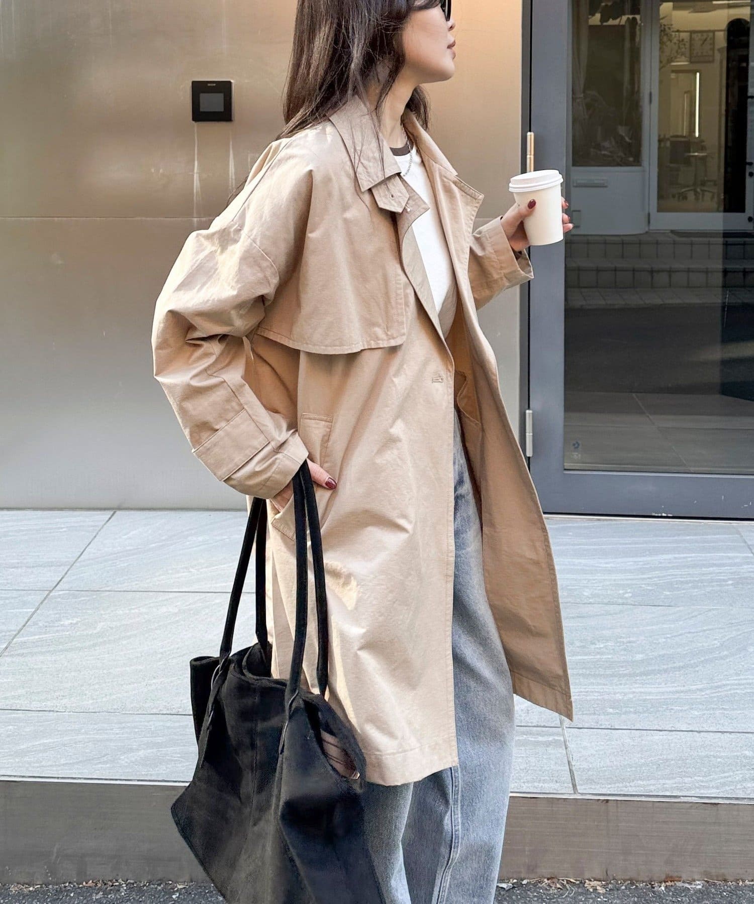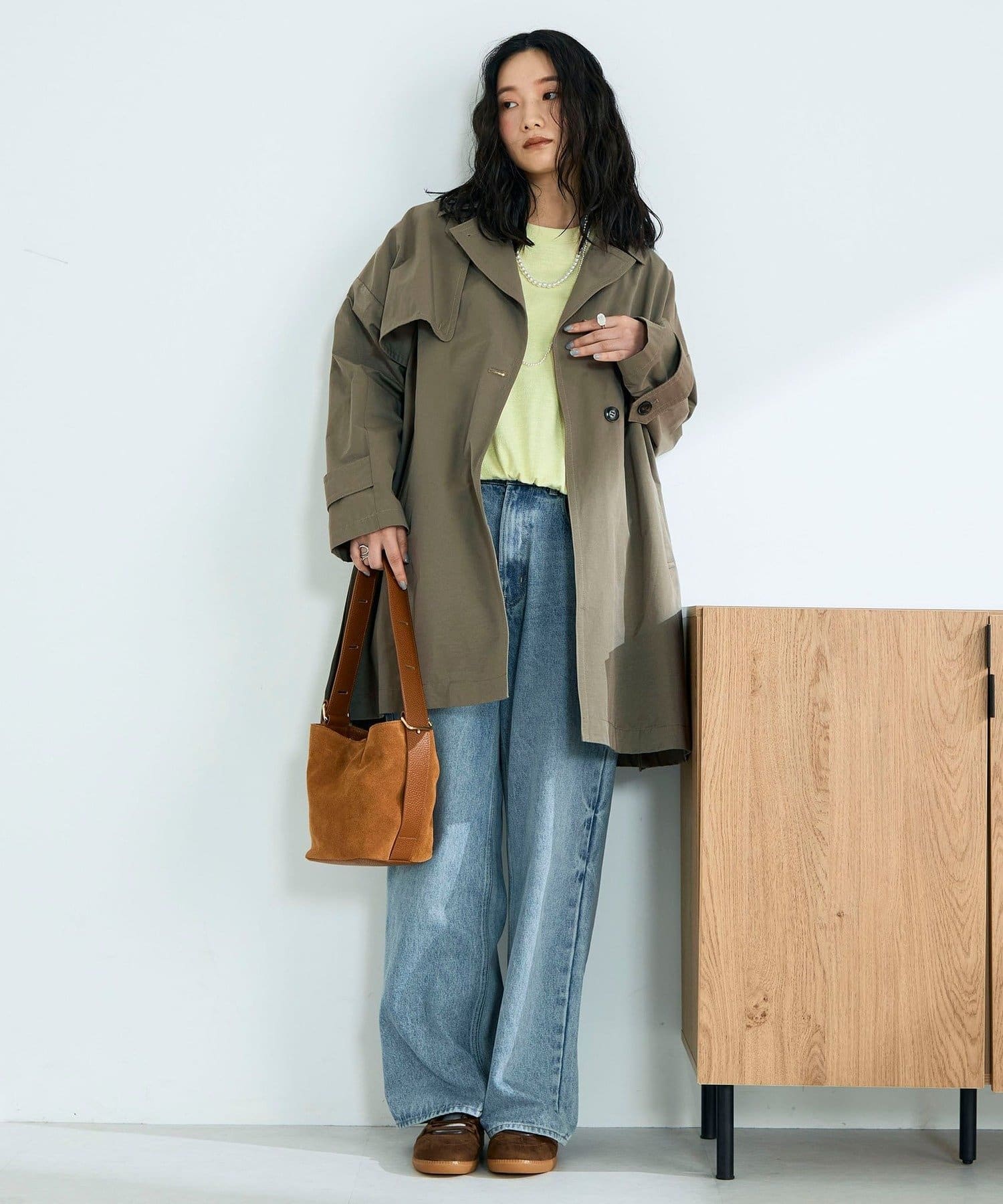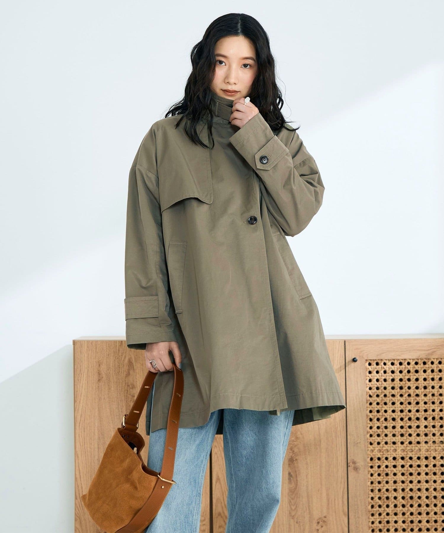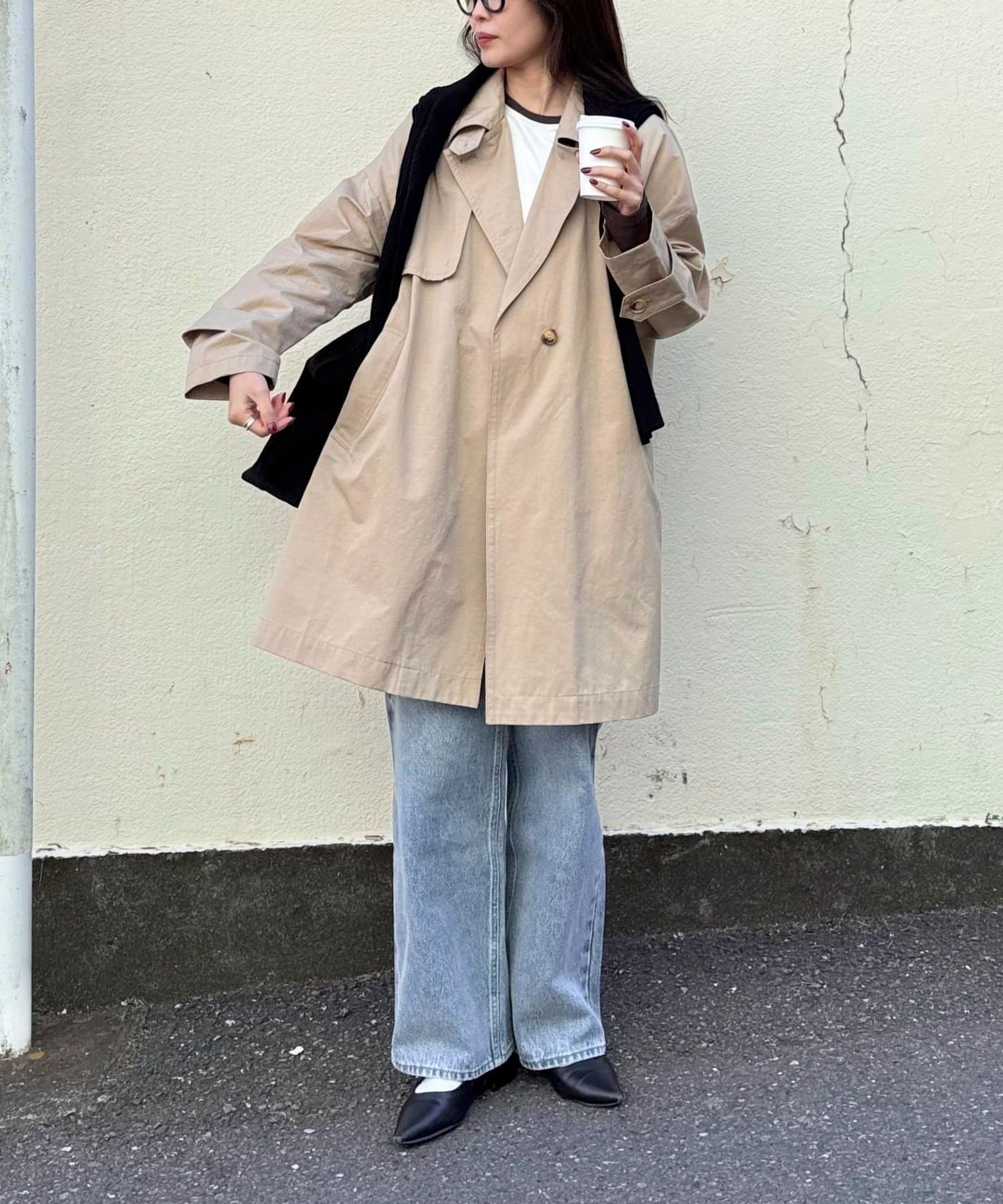 ・程よくゆとりのあるオーバーシルエットが今っぽいバランスを叶えるミドル丈トレンチコート
