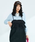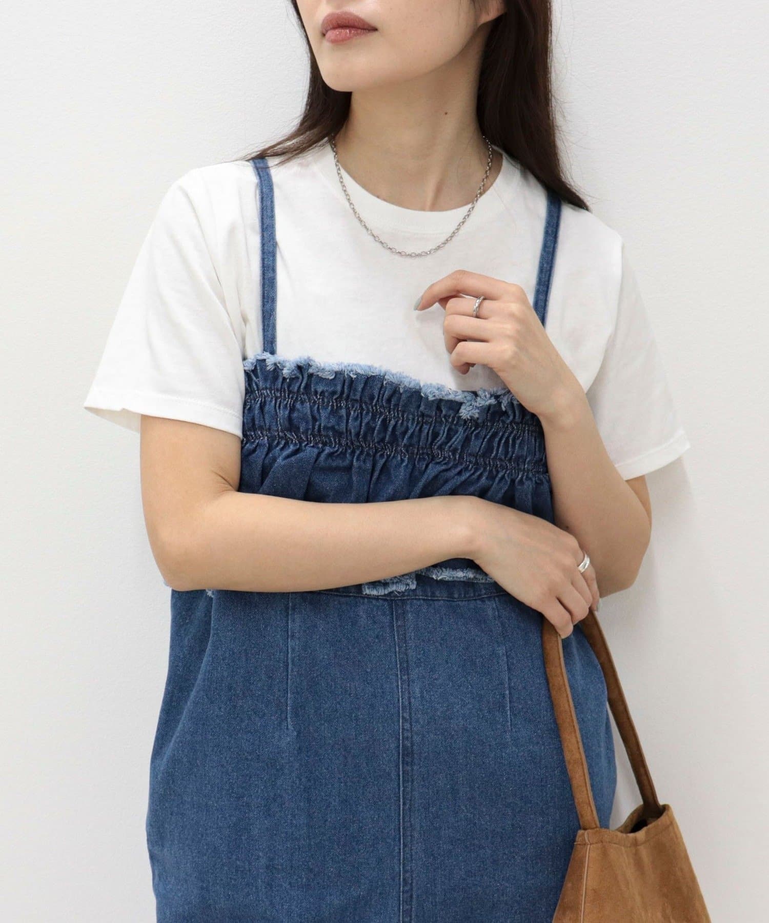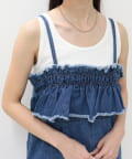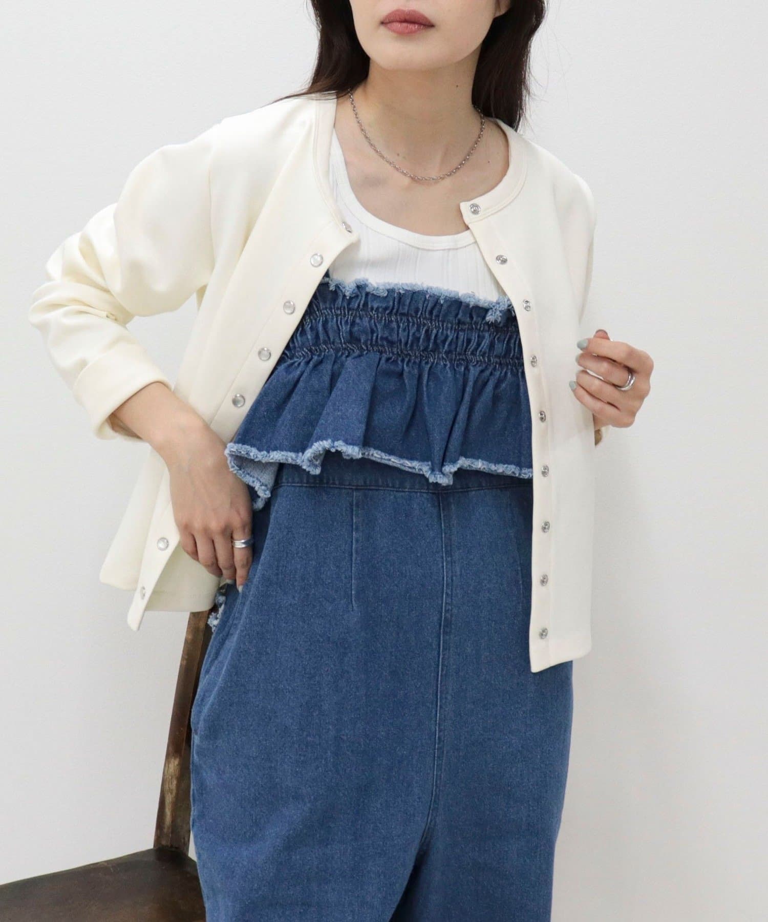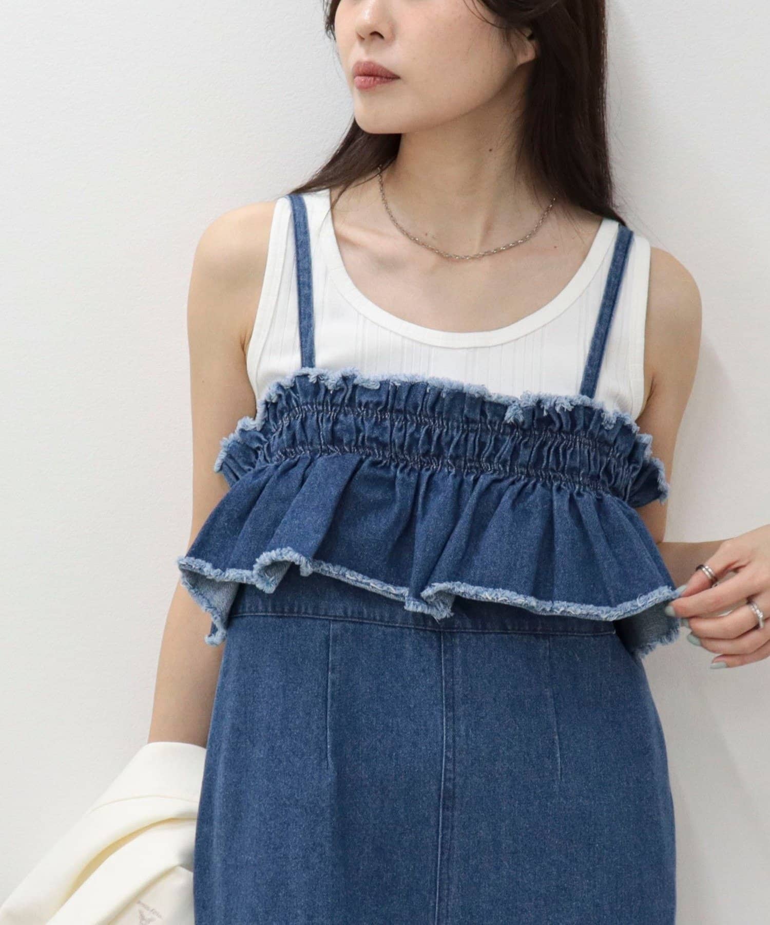 ・胸元にあしらったフリルが女性らしさを引き立てながら、デニム素材で程よい抜け感をプラス