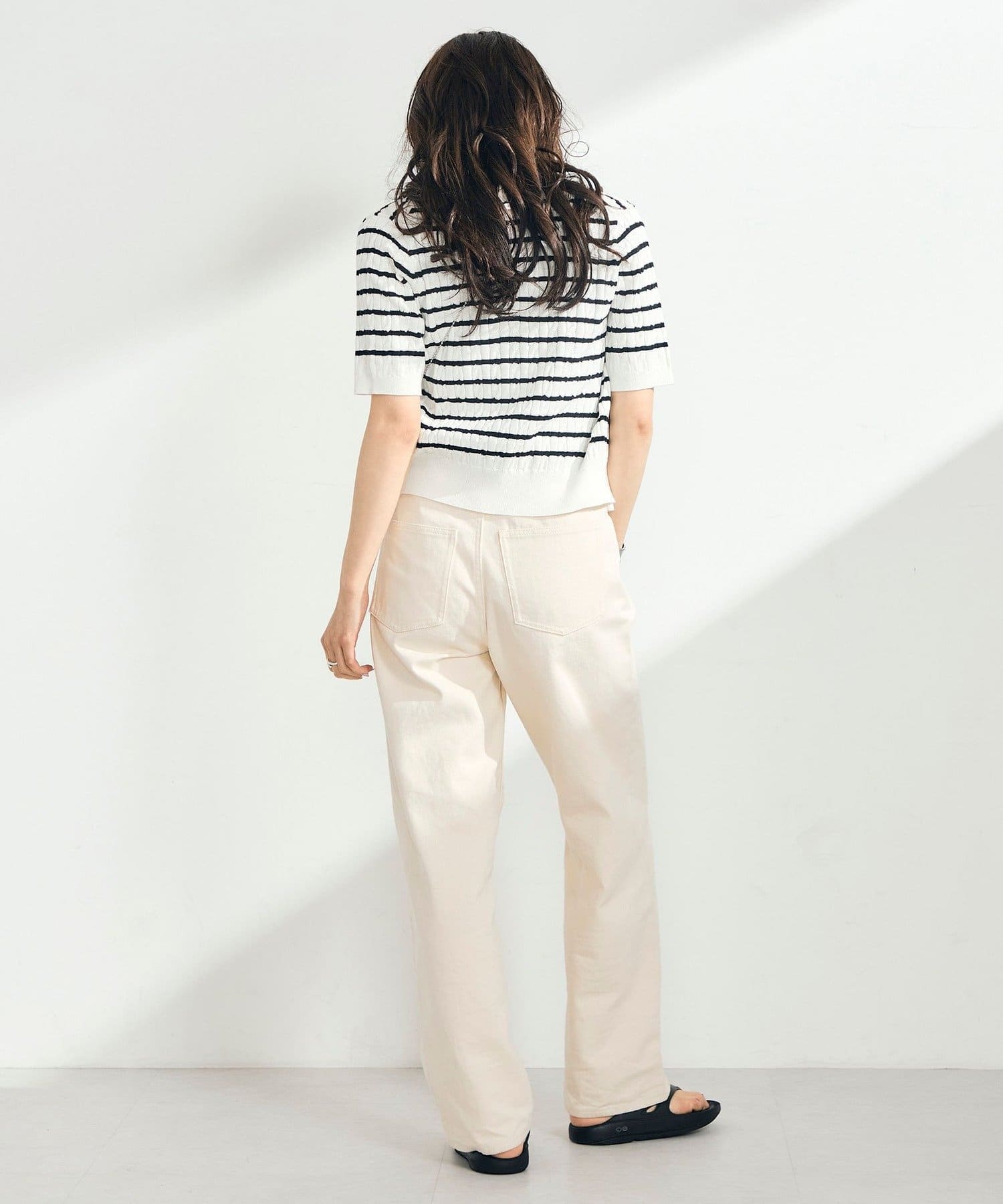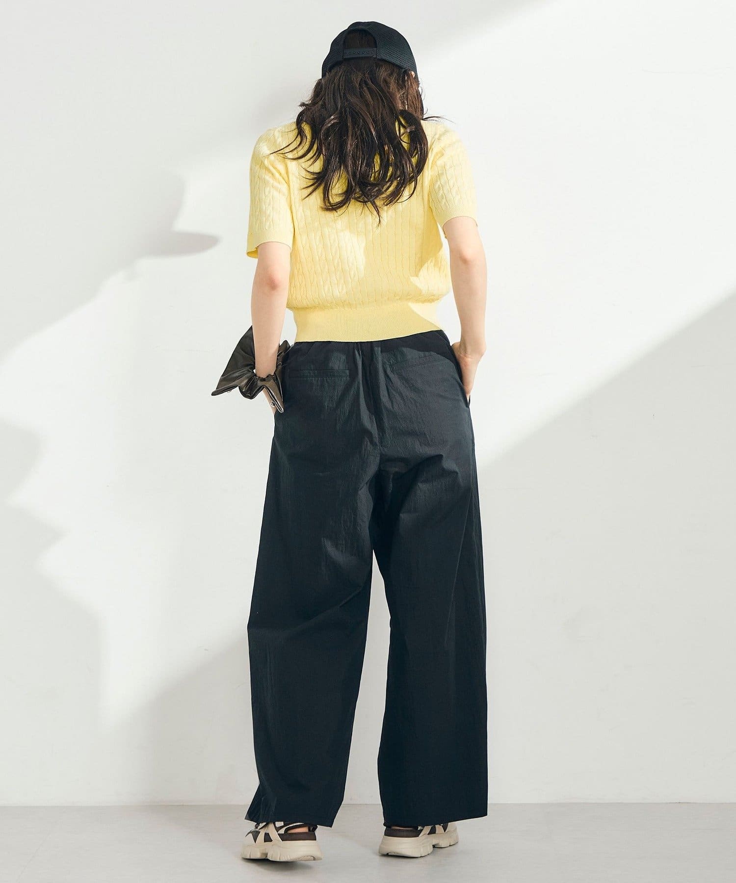 *この製品は、生地の特性上引っかかると糸が飛び出しやすい傾向があります。着用時にはベルトやバック、周囲の壁など表面の粗いものとの摩擦や引っかかりにご注意ください。