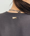 ・二の腕をカバーする5分袖丈や後ろのブランドロゴプレートもさりげないポイント