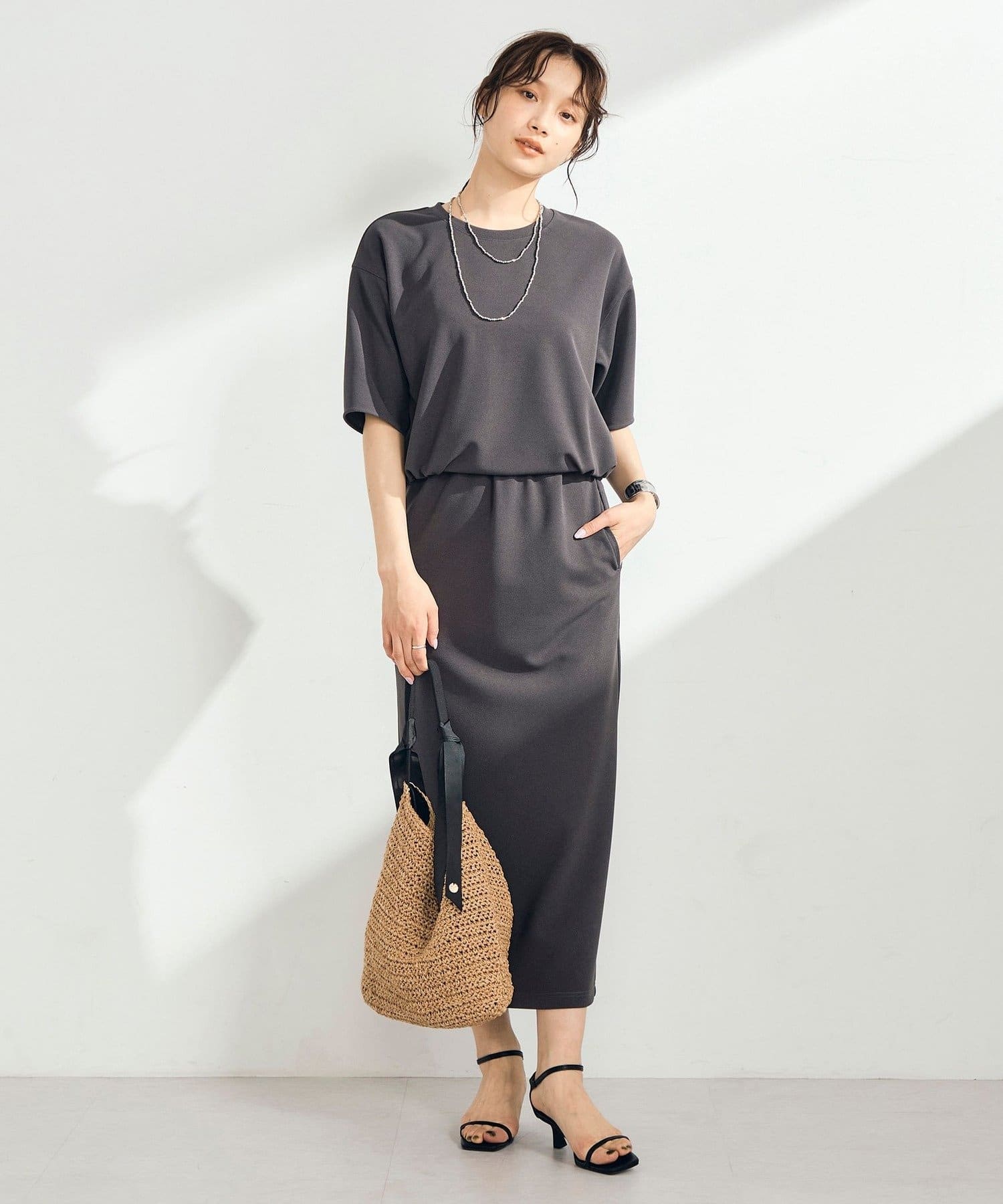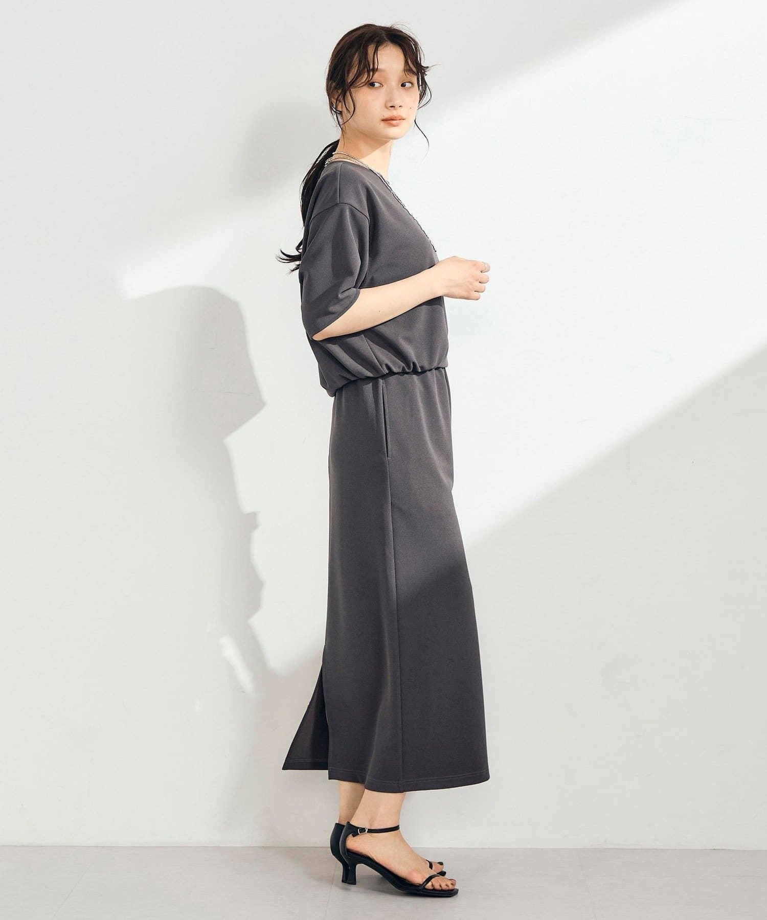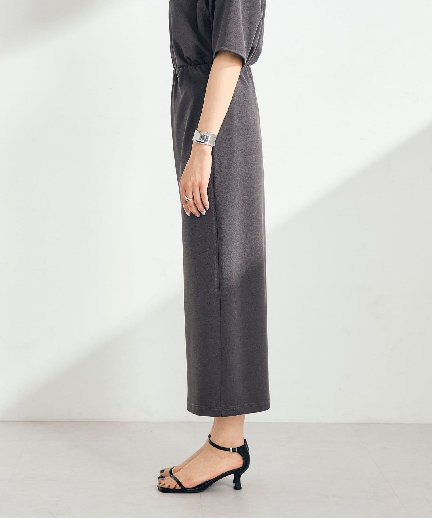 ウエストは程よくフィットし、ストンと落ちるIラインシルエットで全体をすっきり見せてくれます。身体のラインを拾いすぎず、リラックス感がありながらも上品な印象に。身長153cmで足首が見えるバランスの取りやすい丈感で、低身長の方にも取り入れやすい一枚です。