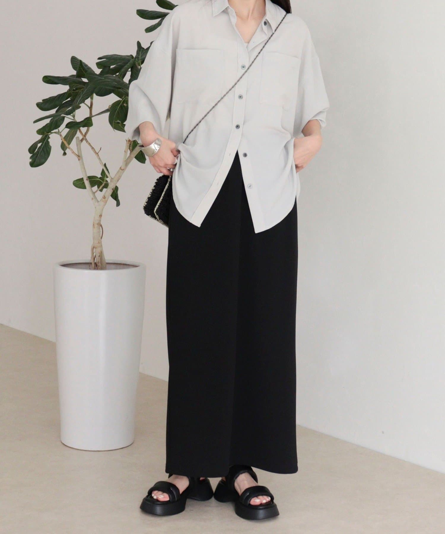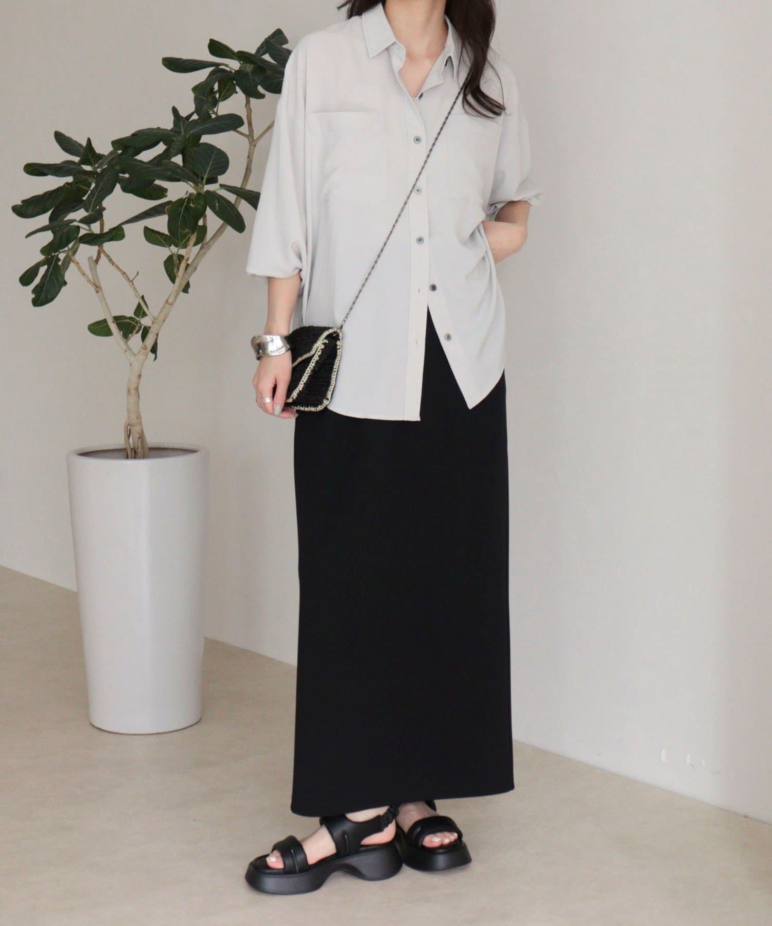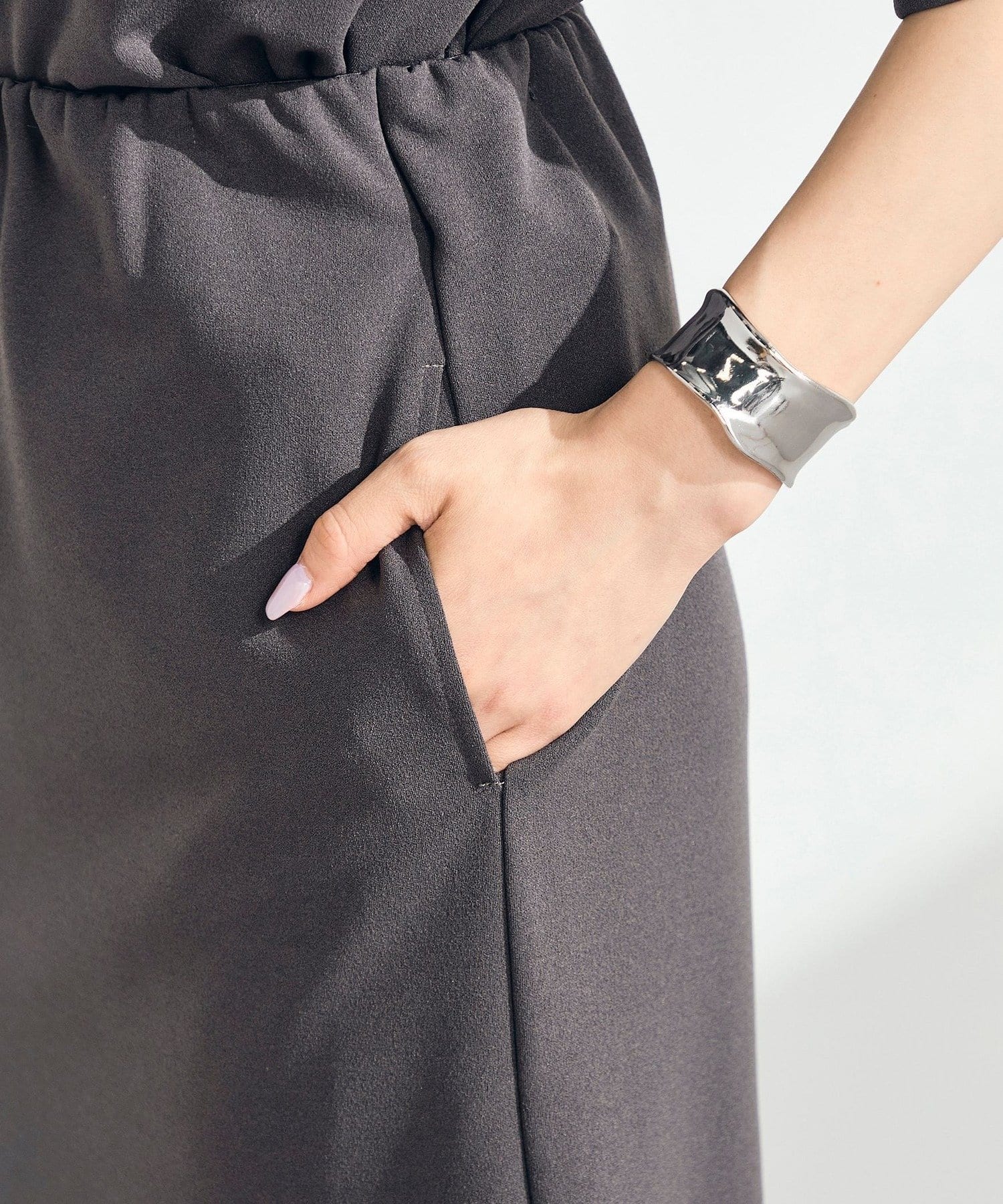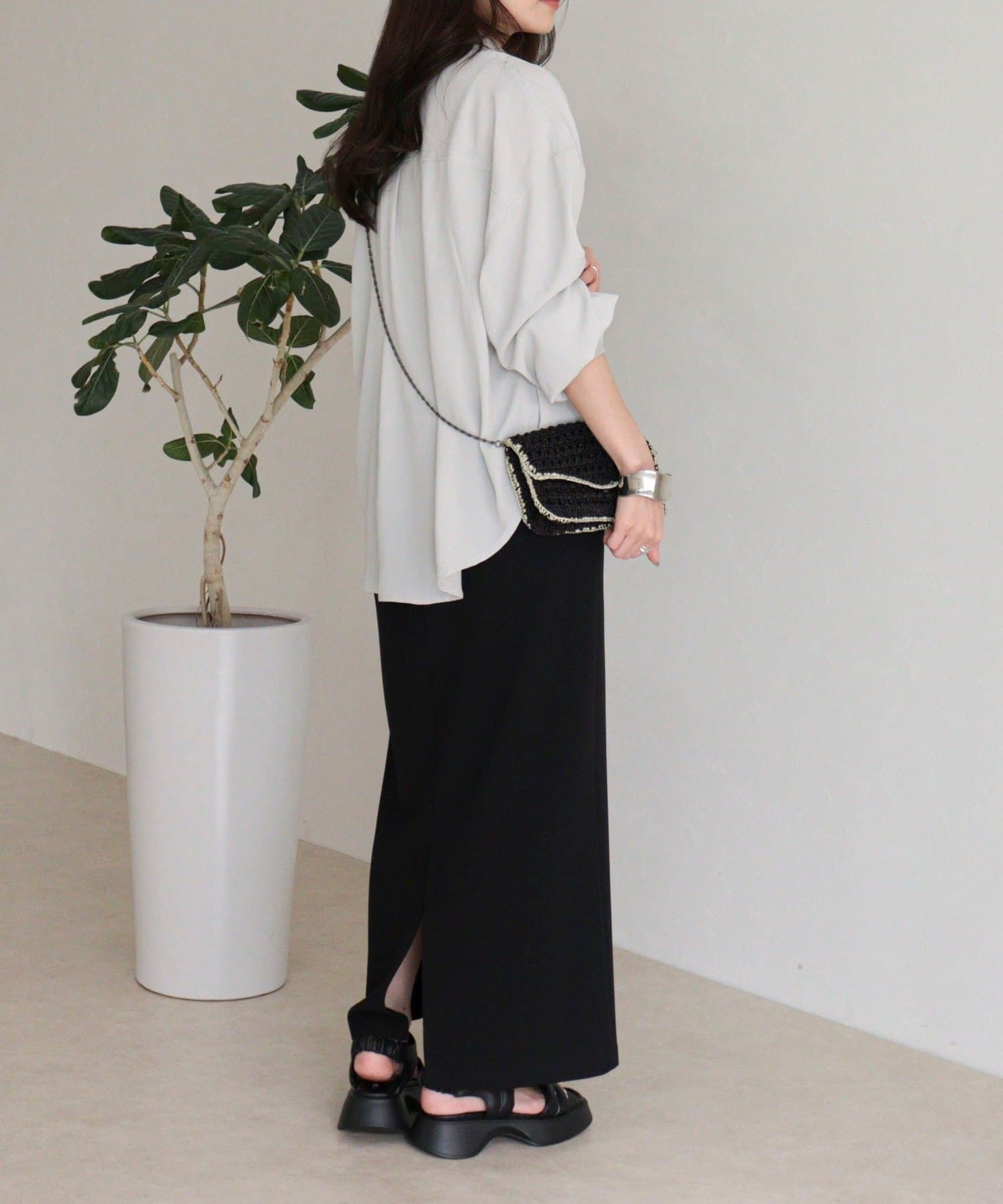 ウエストは程よくフィットし、ストンと落ちるIラインシルエットで全体をすっきり見せてくれます。身体のラインを拾いすぎず、リラックス感がありながらも上品な印象に。身長153cmで足首が見えるバランスの取りやすい丈感で、低身長の方にも取り入れやすい一枚です。