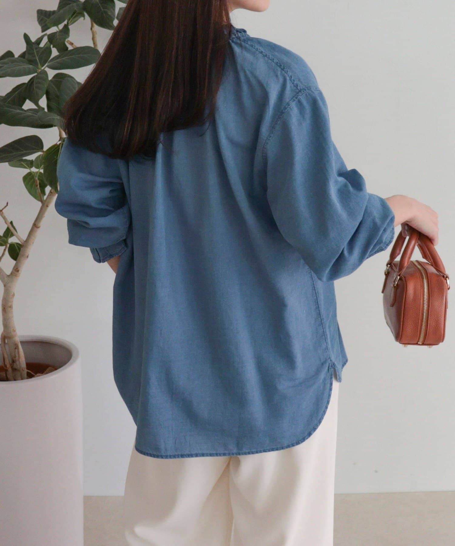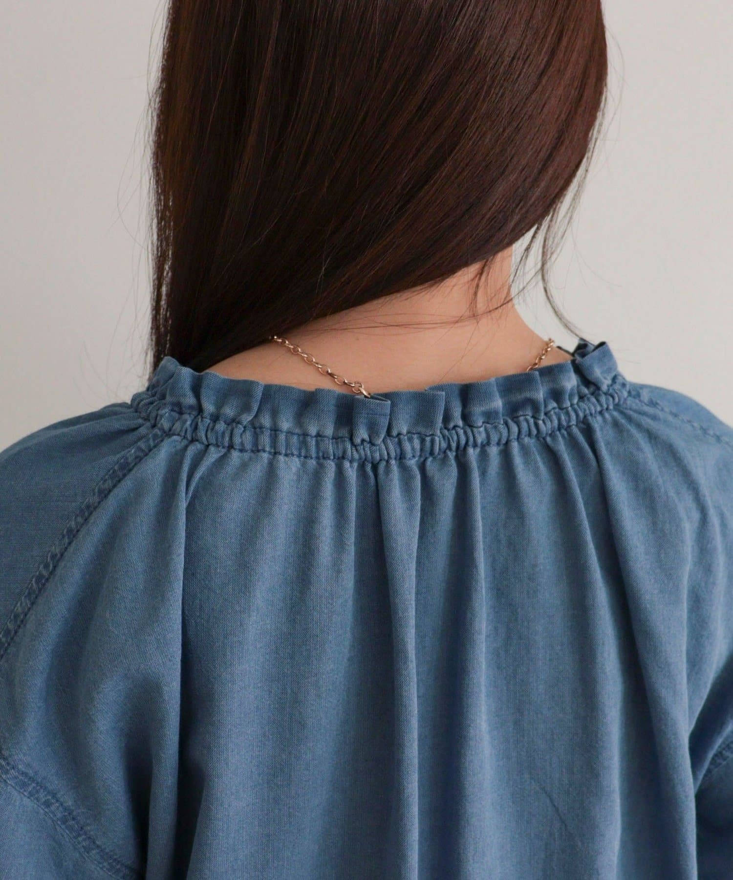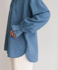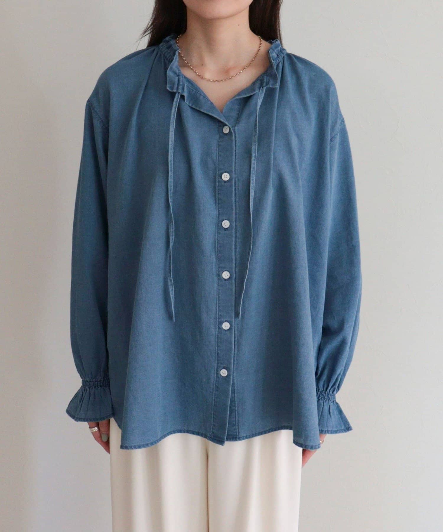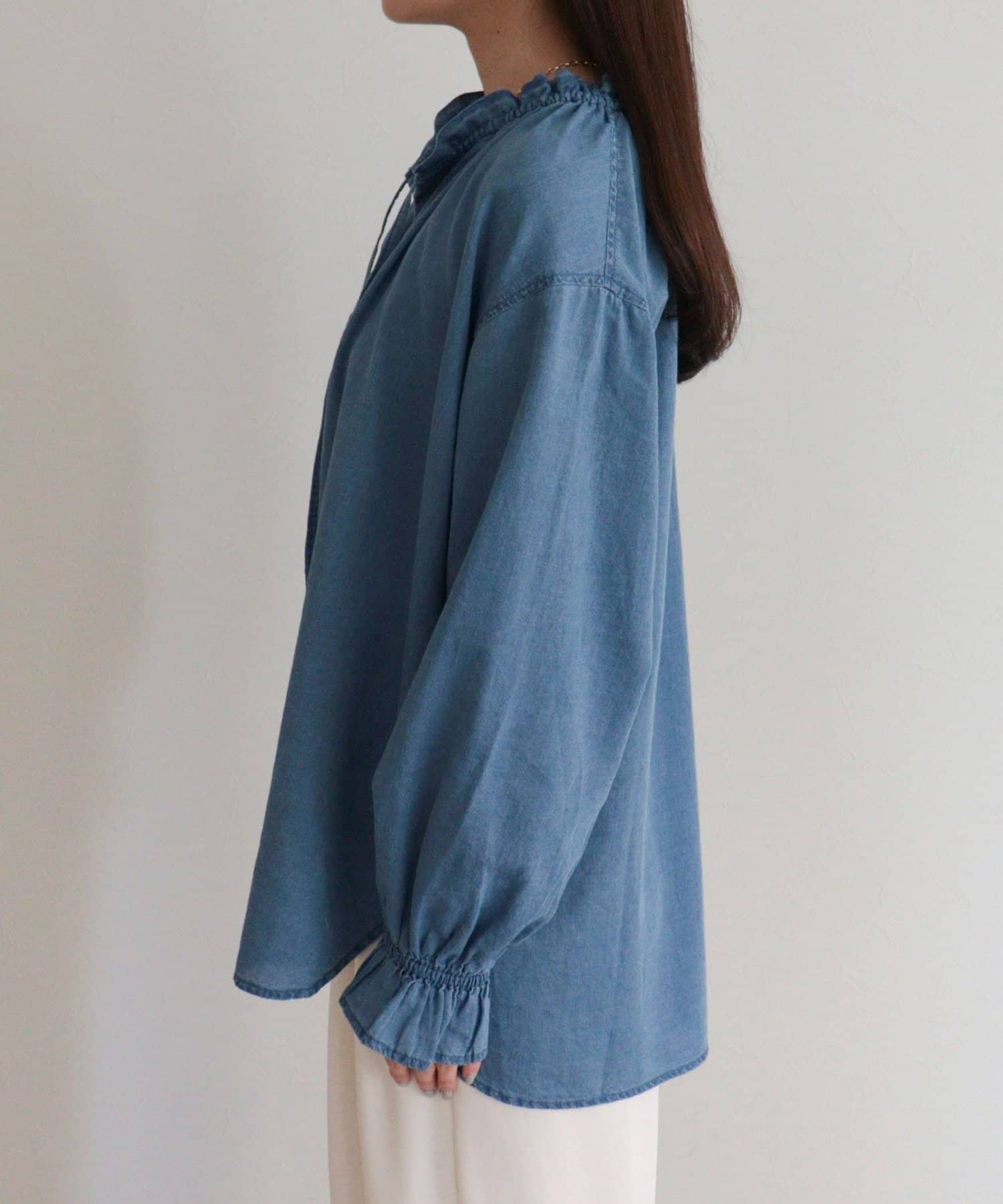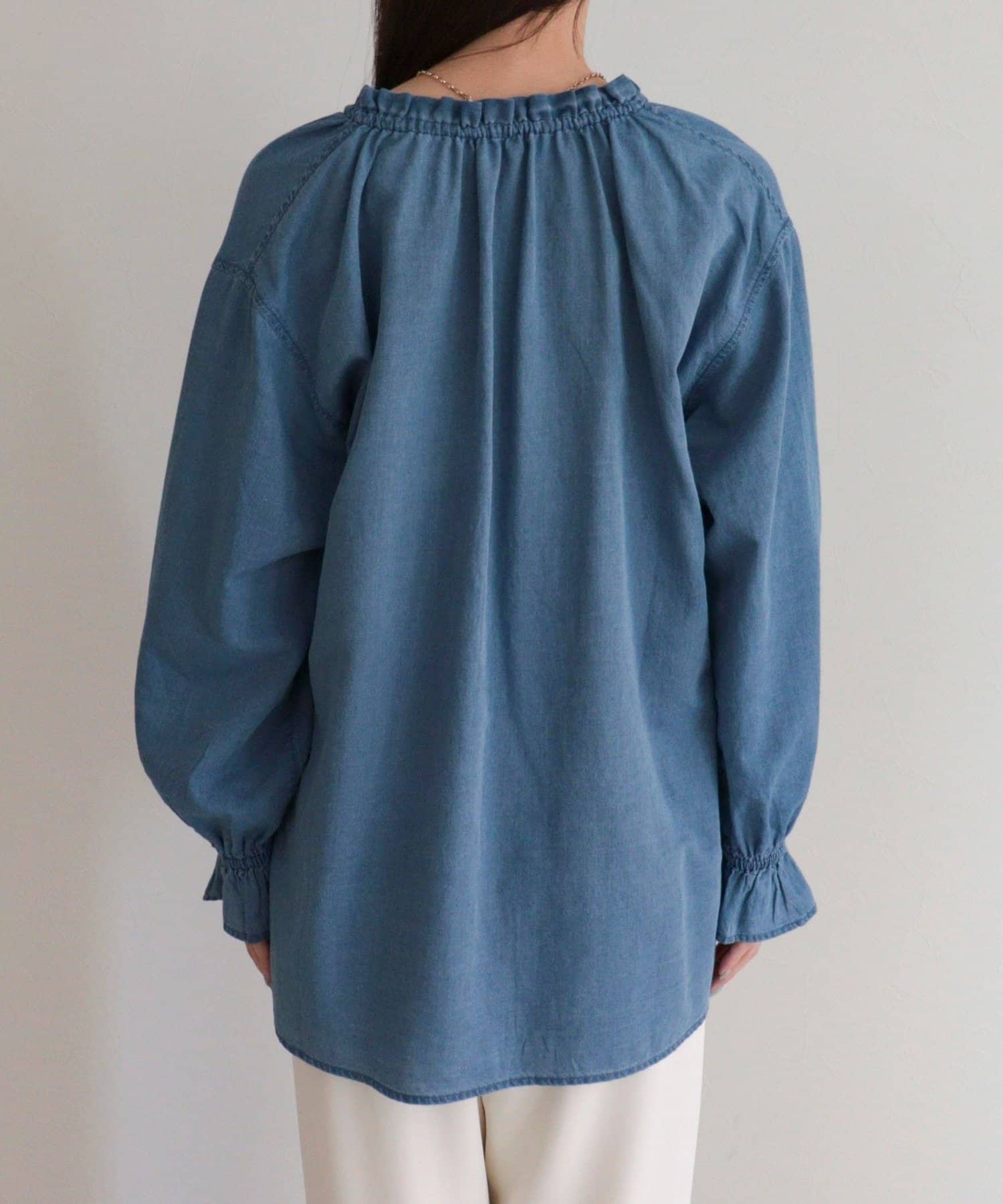 ・薄手のシアーデニム素材を使用したフリルカラーブラウス