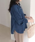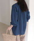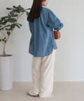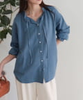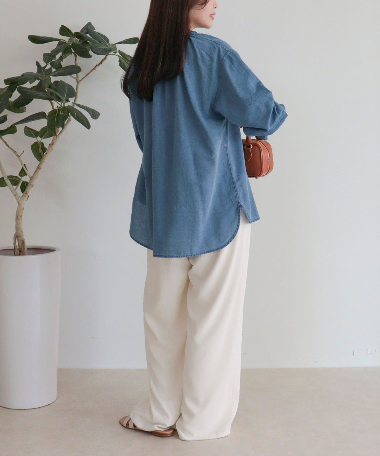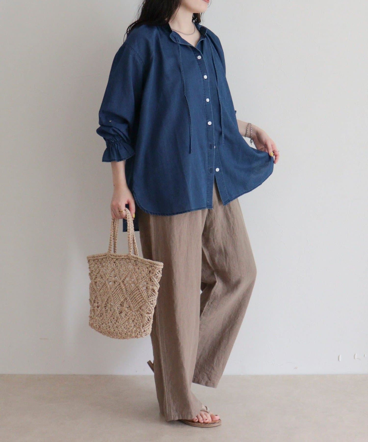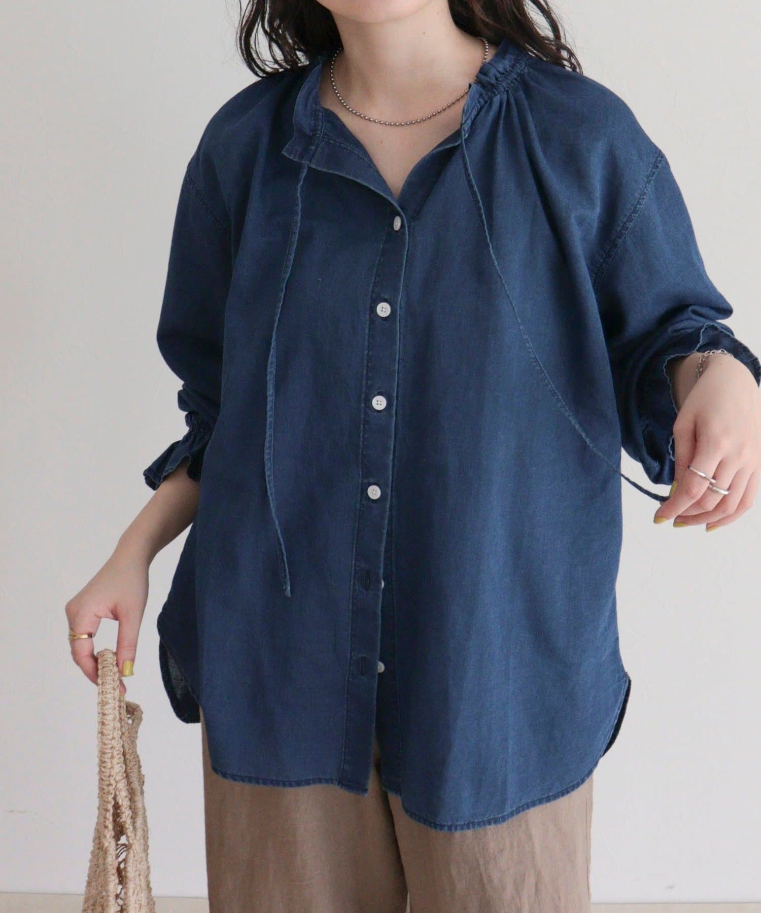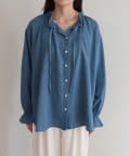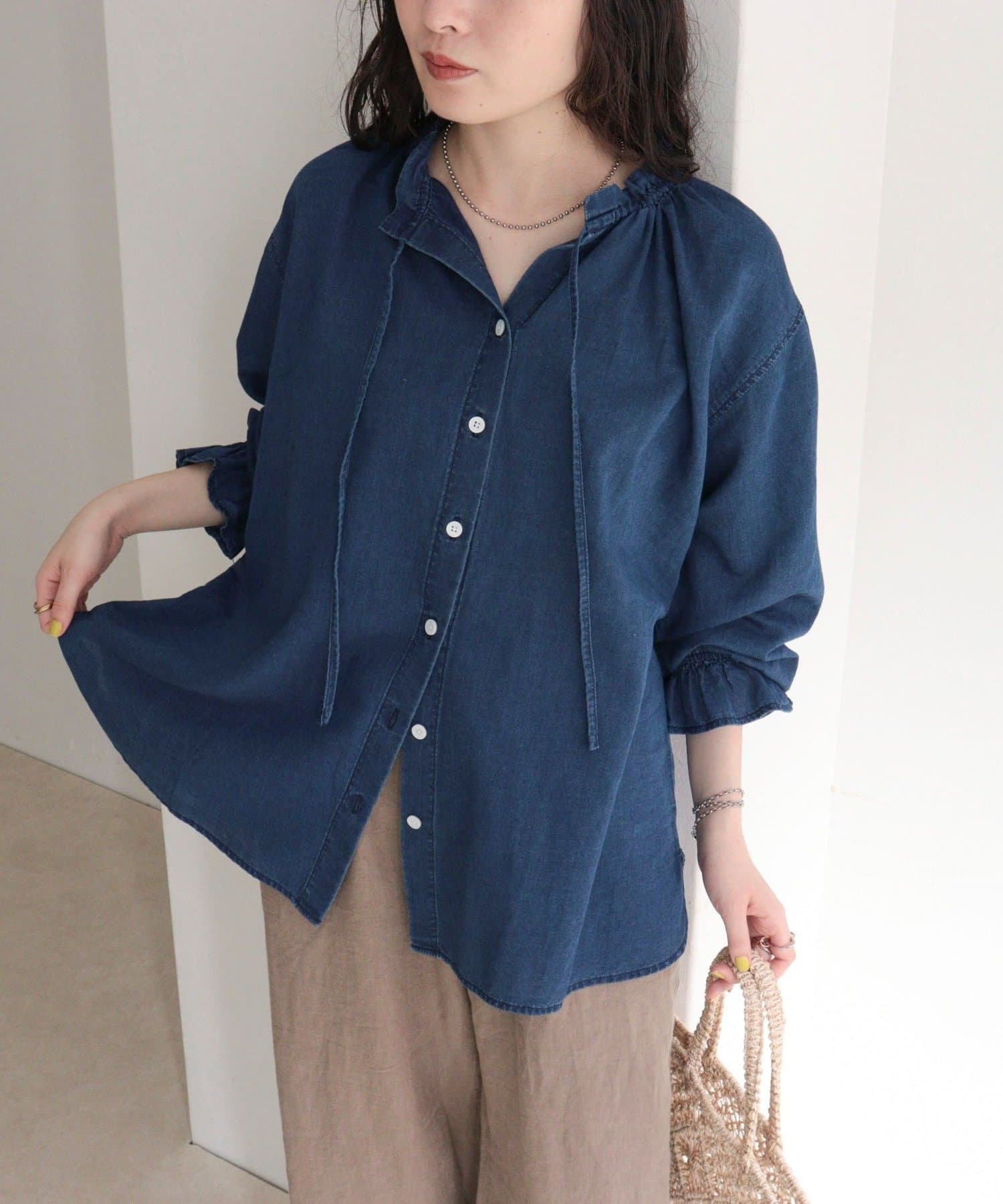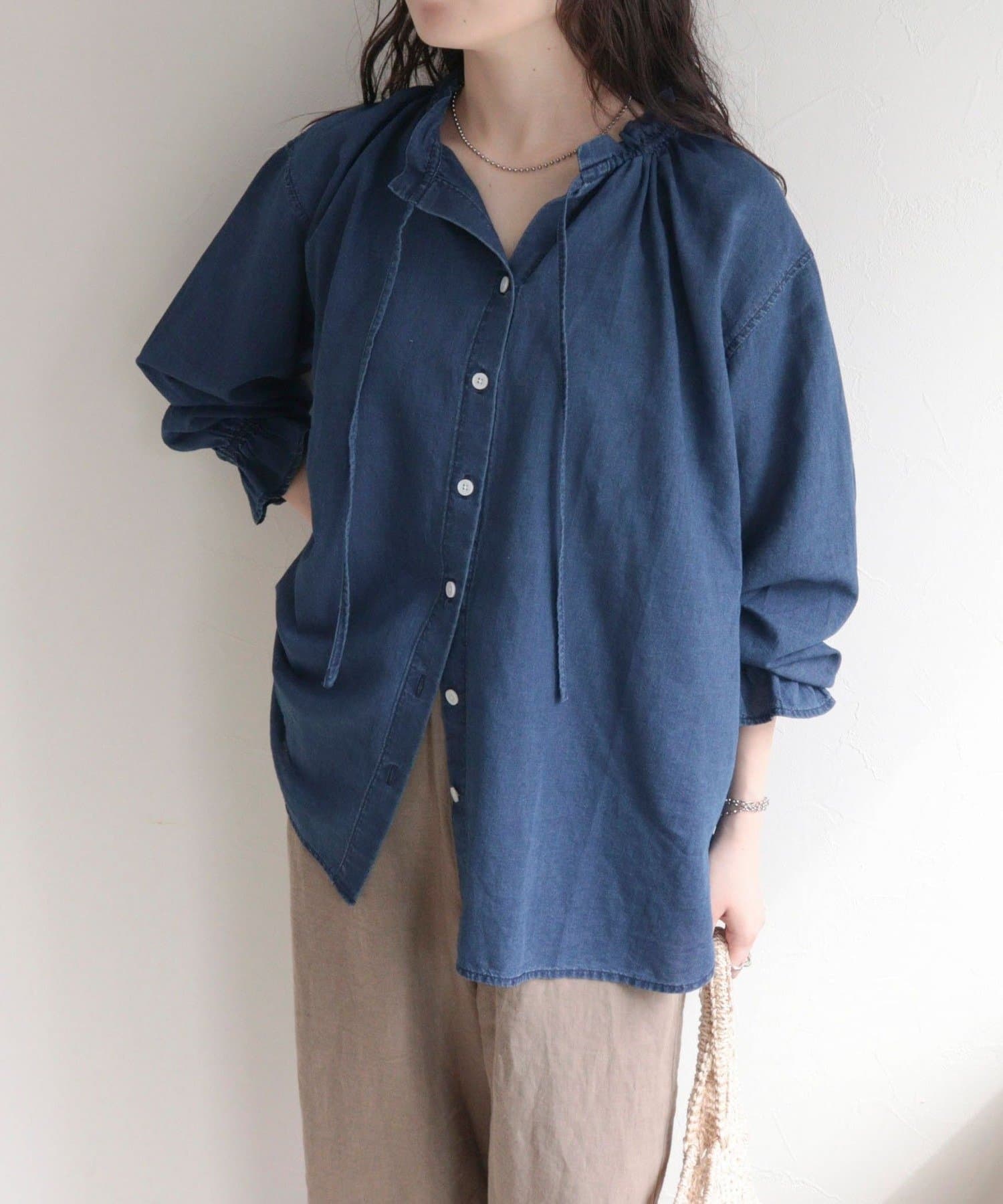 ・薄手のシアーデニム素材を使用したフリルカラーブラウス