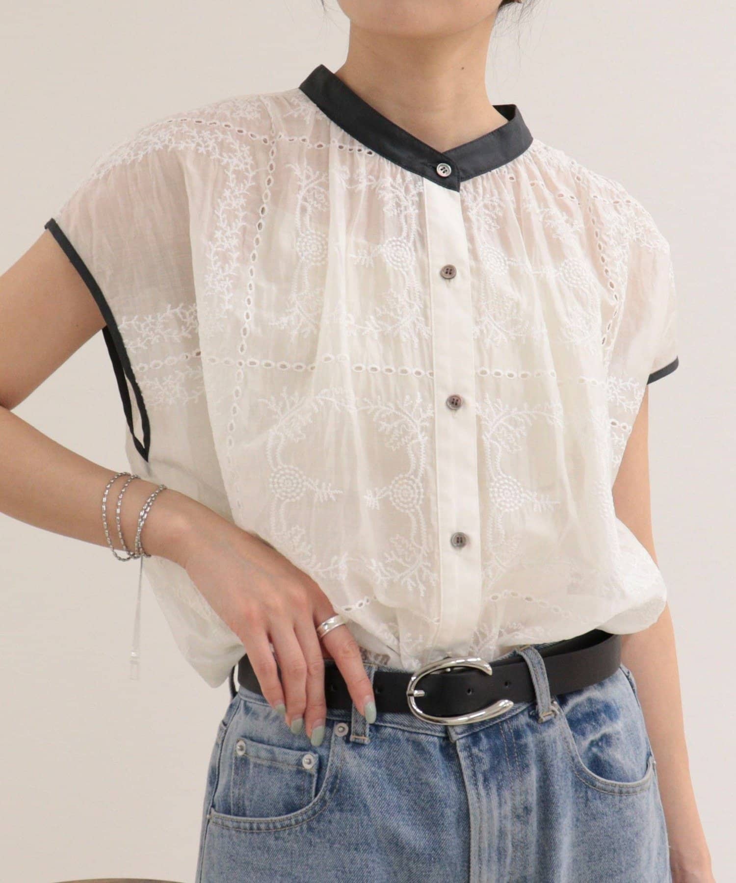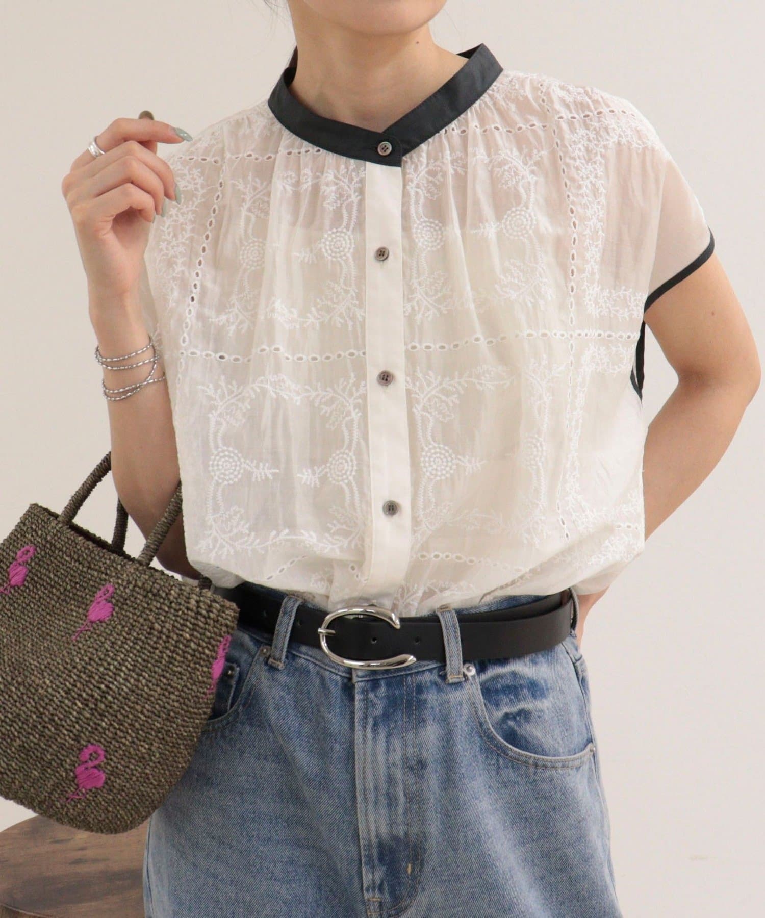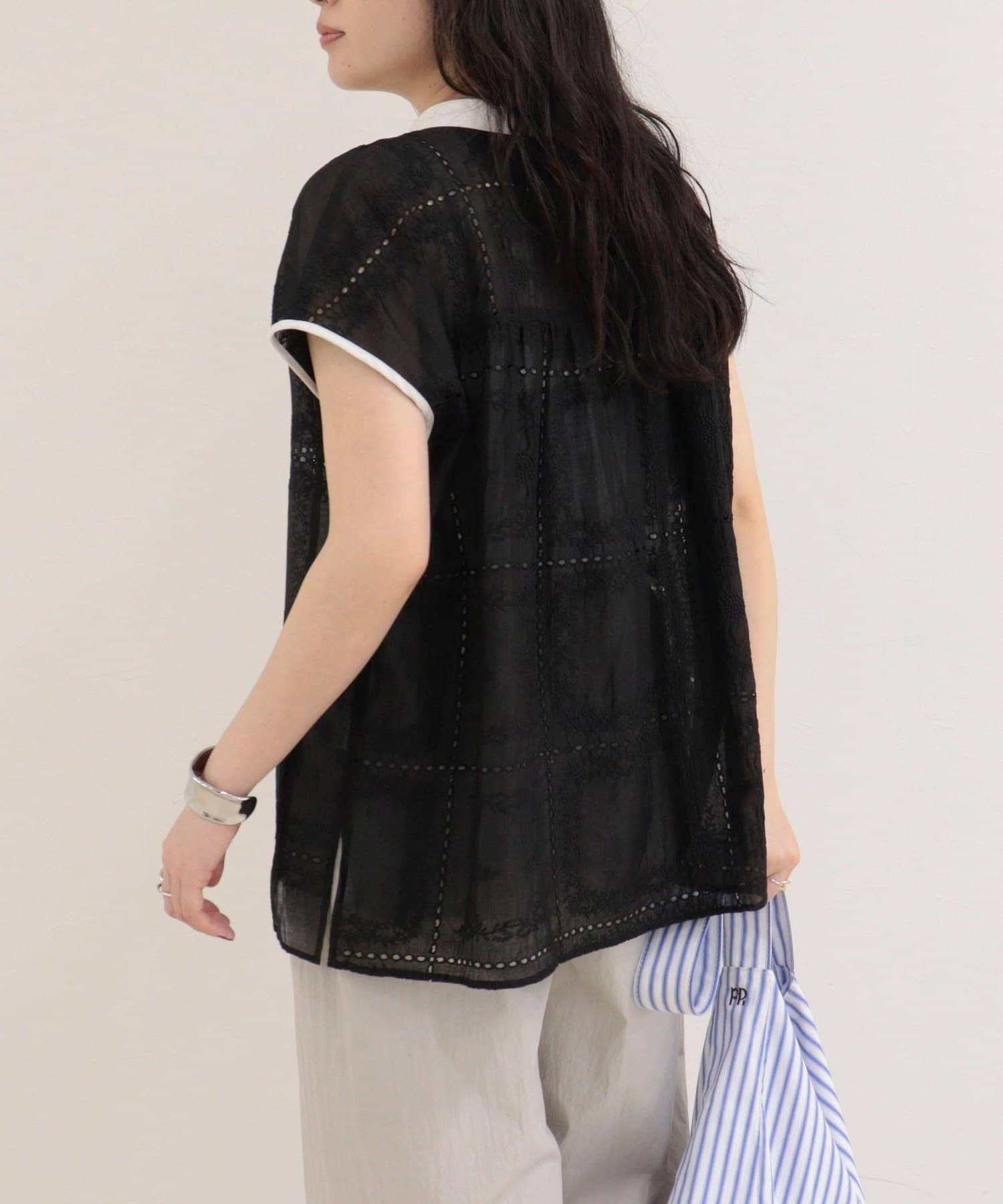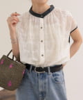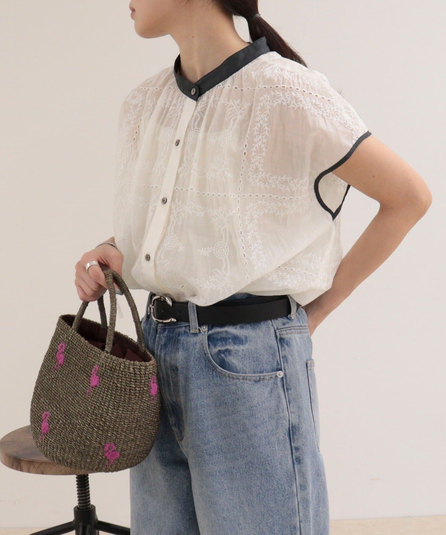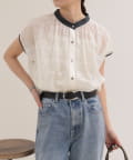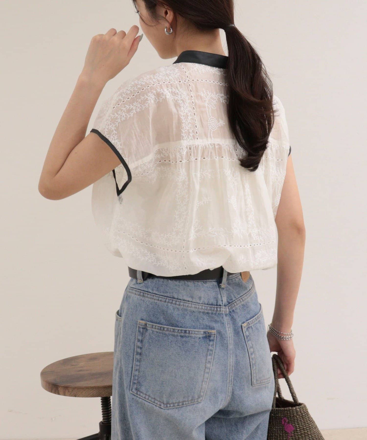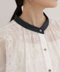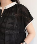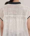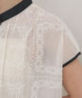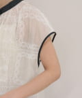 ・繊細な刺しゅうレースに、配色パイピングを効かせたフレンチスリーブブラウス