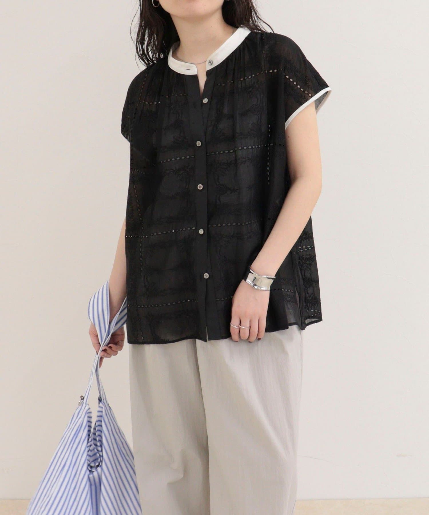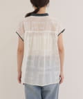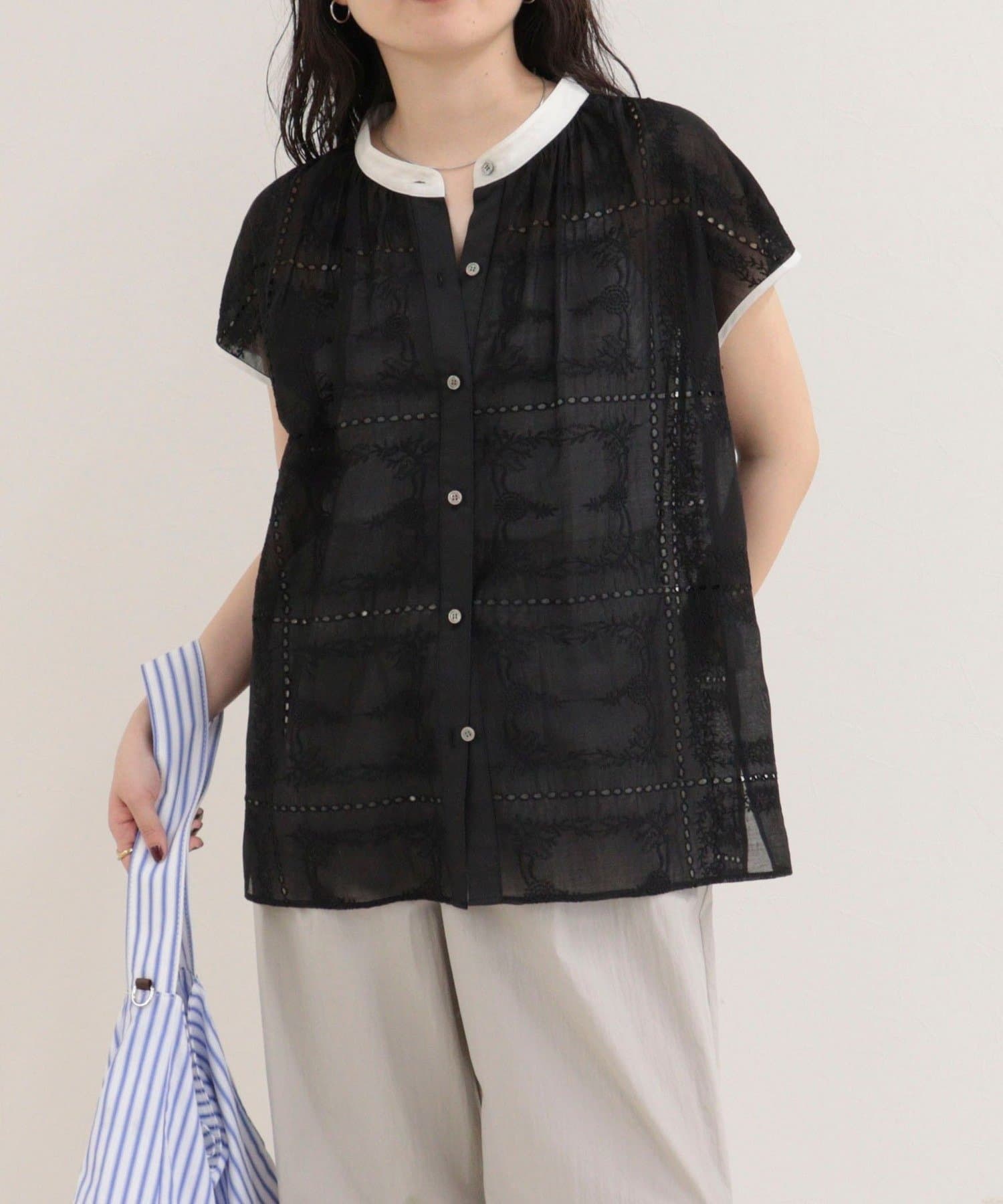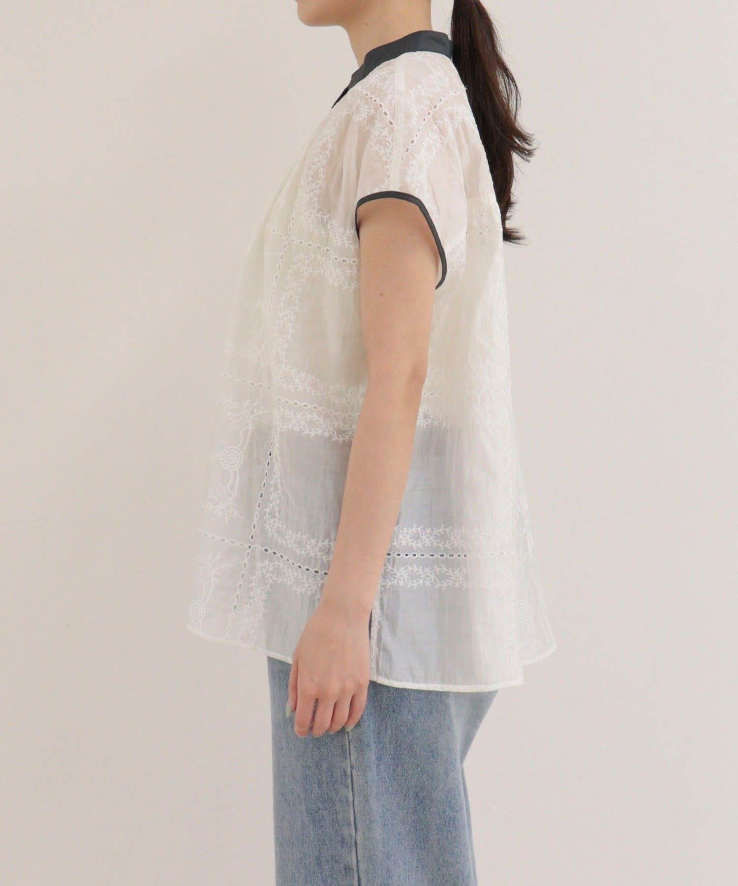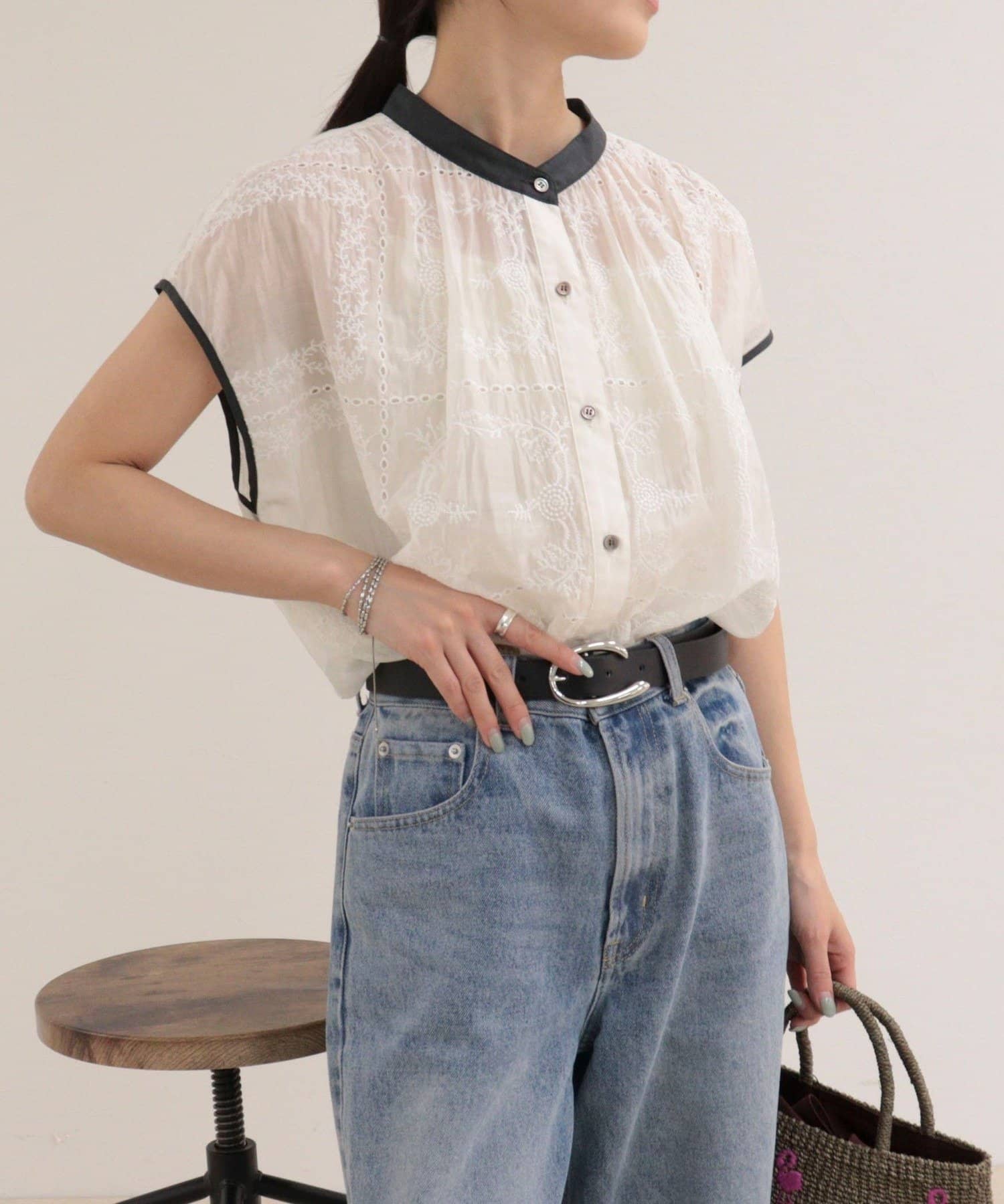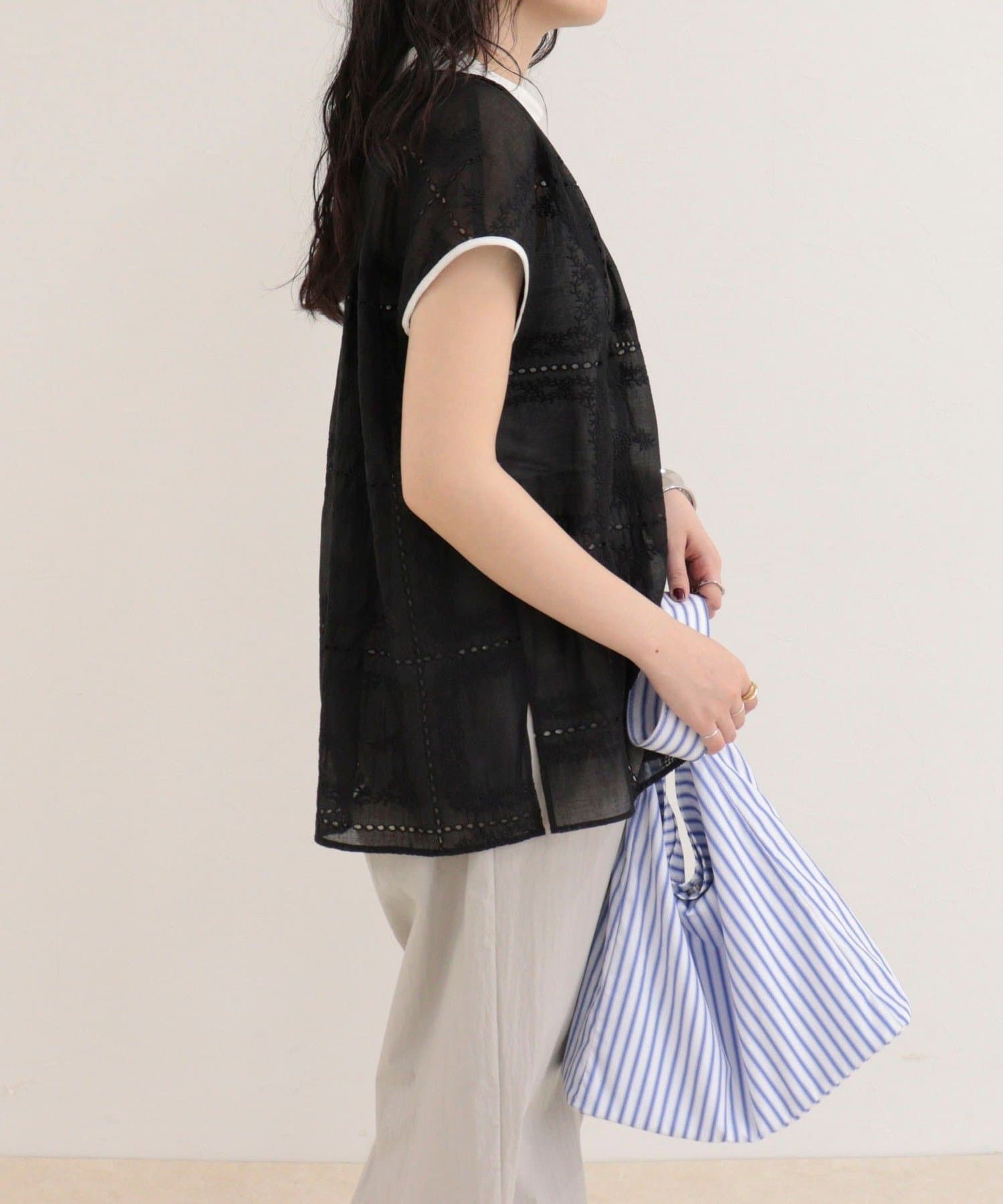 ・繊細な刺しゅうレースに、配色パイピングを効かせたフレンチスリーブブラウス